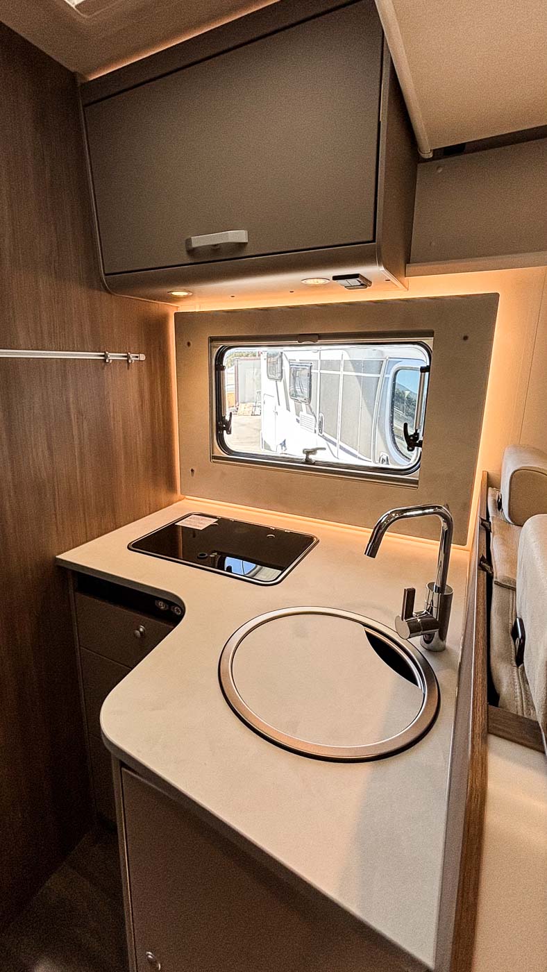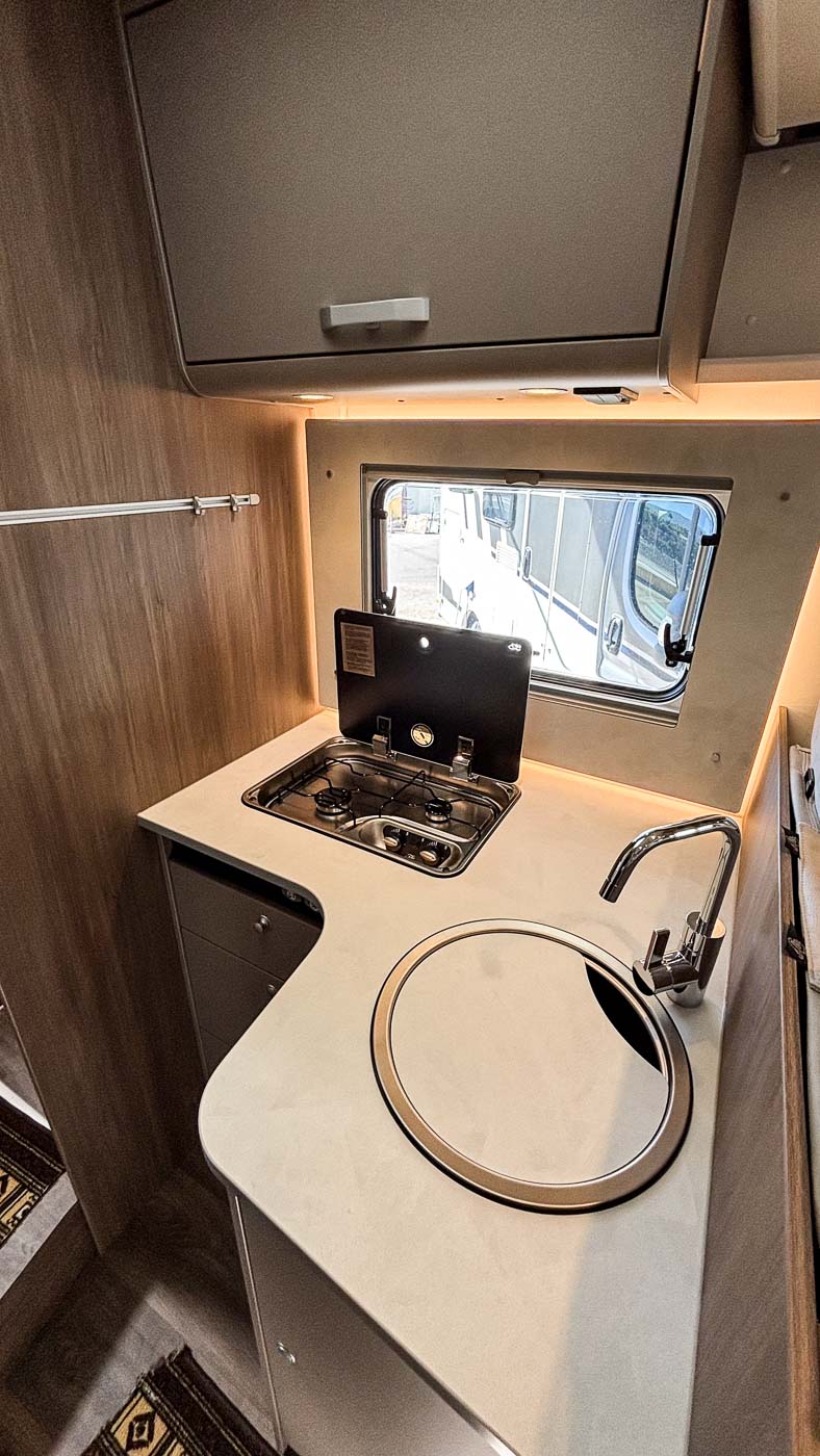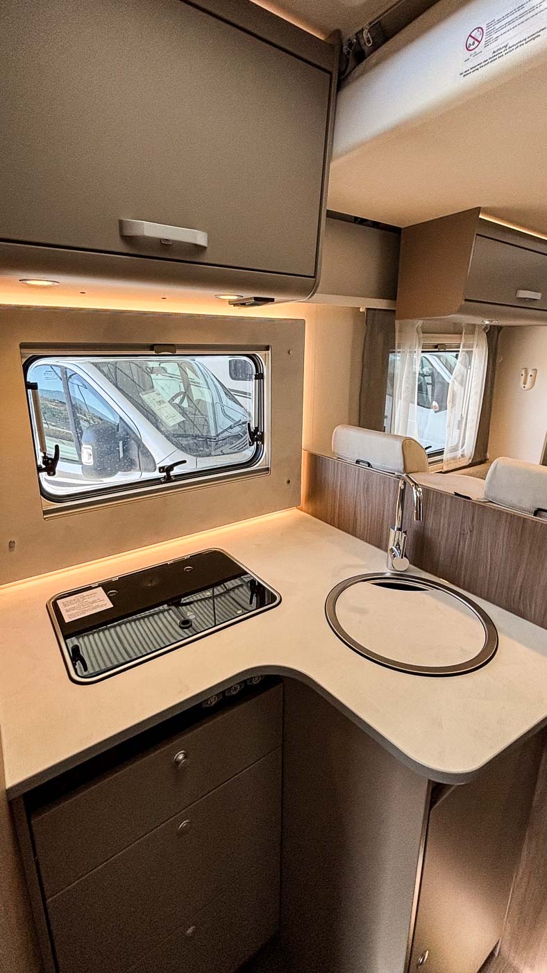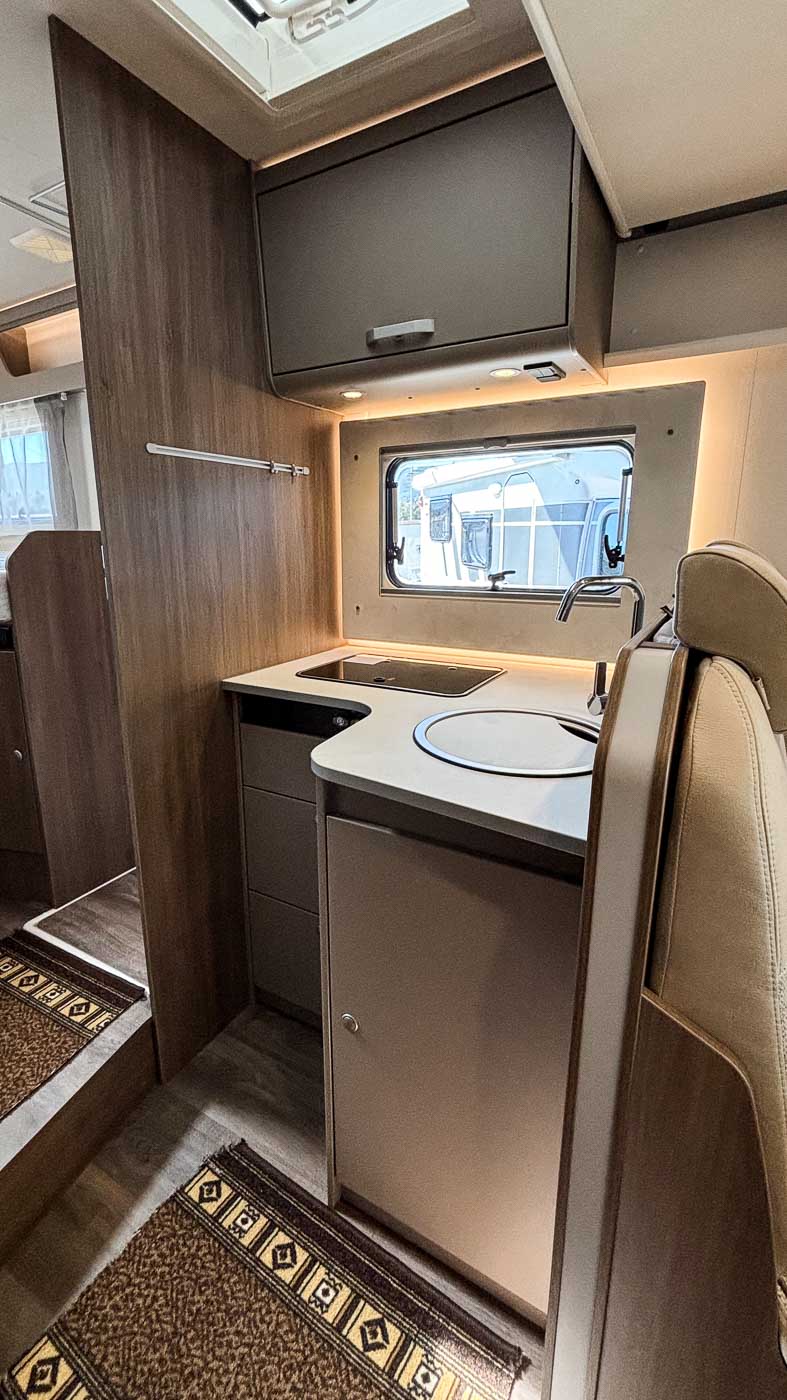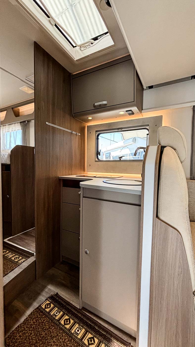 La cocina la encontramos en la parte central del vehículo y está completamente equipada: cuenta con dos fuegos, fregadero y frigorífico grande con congelador independiente.