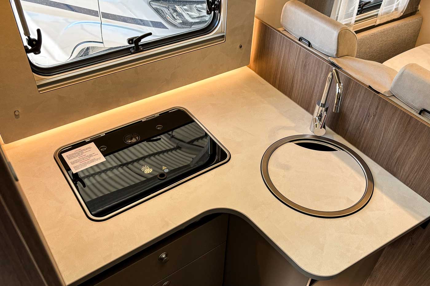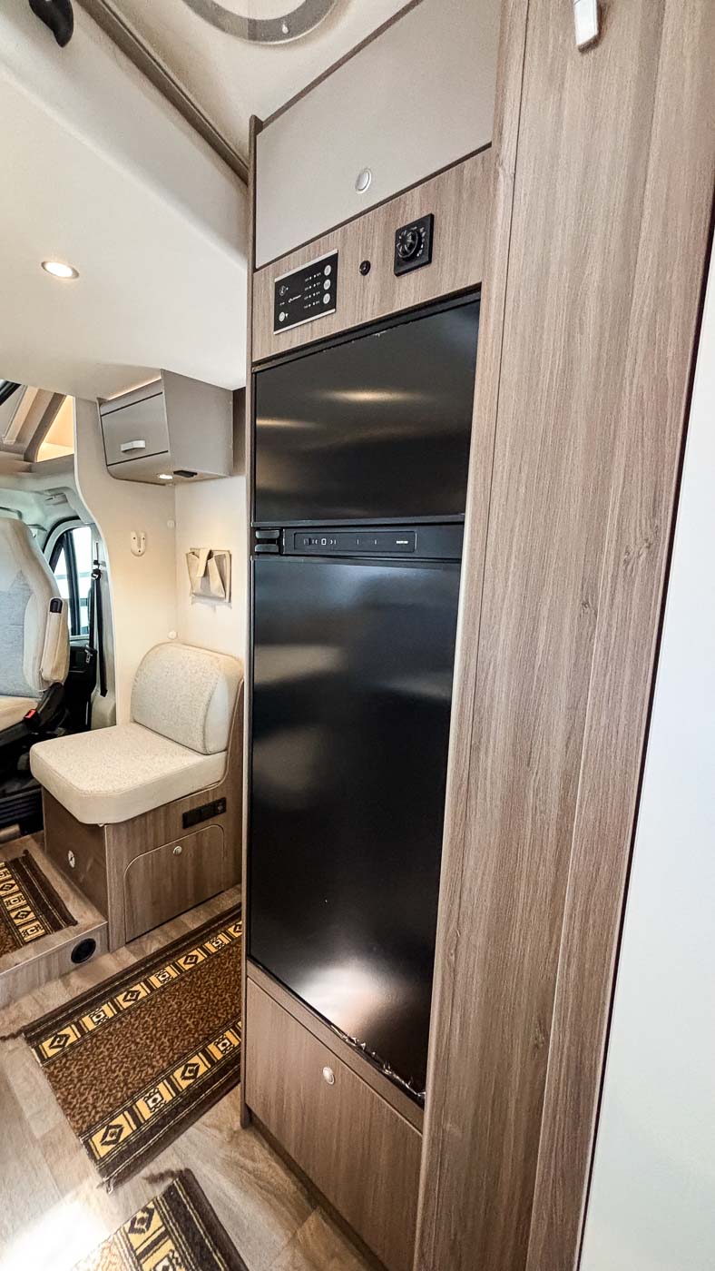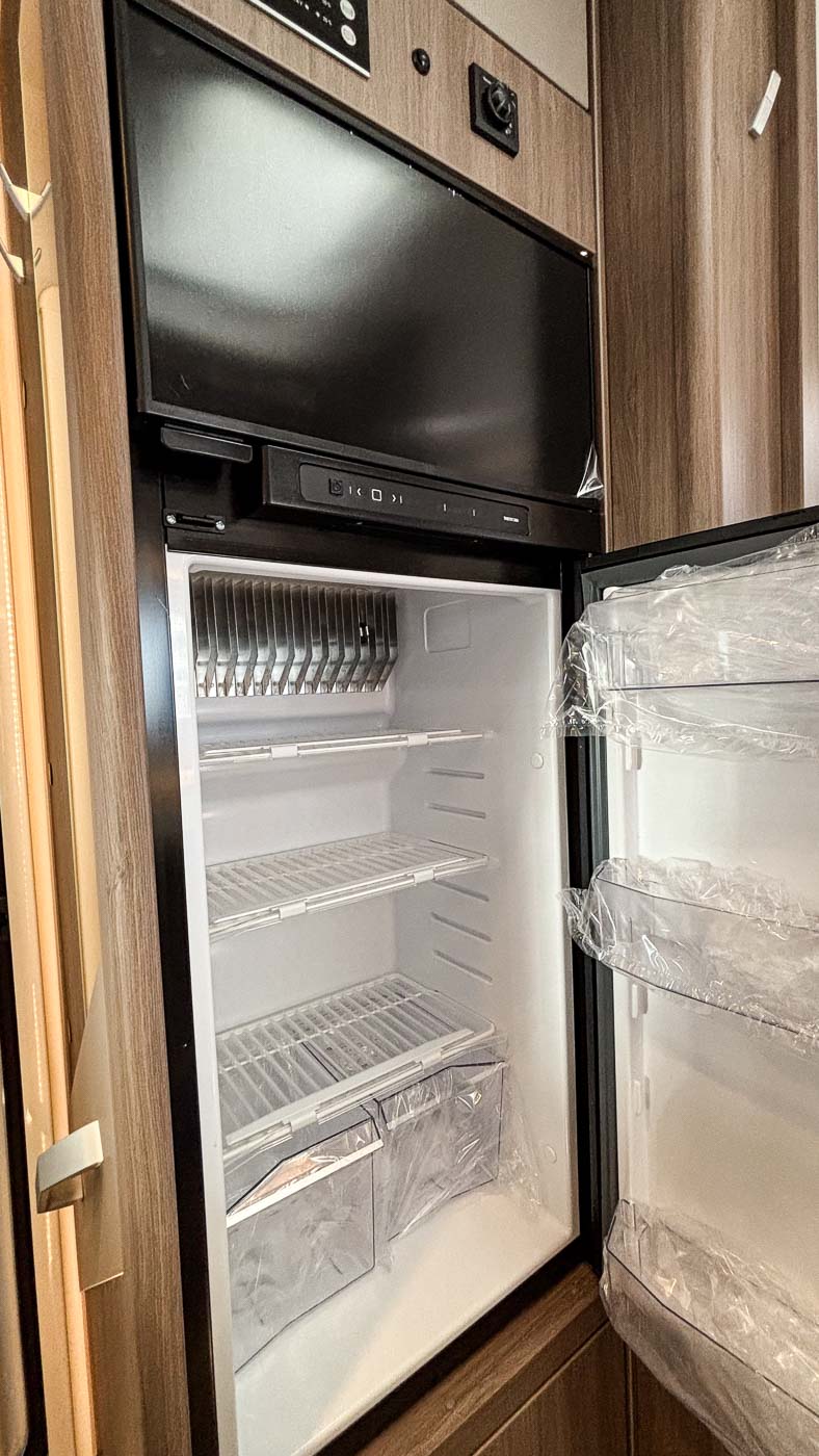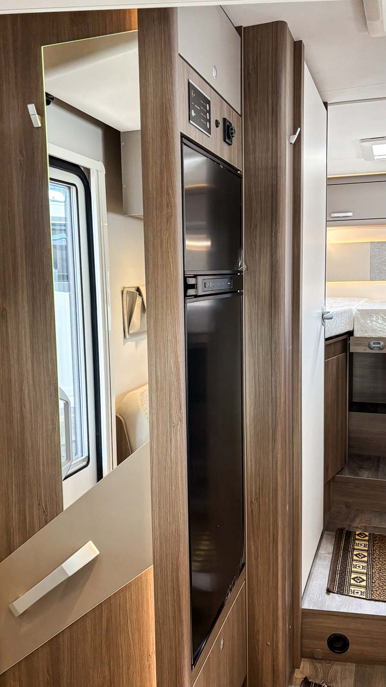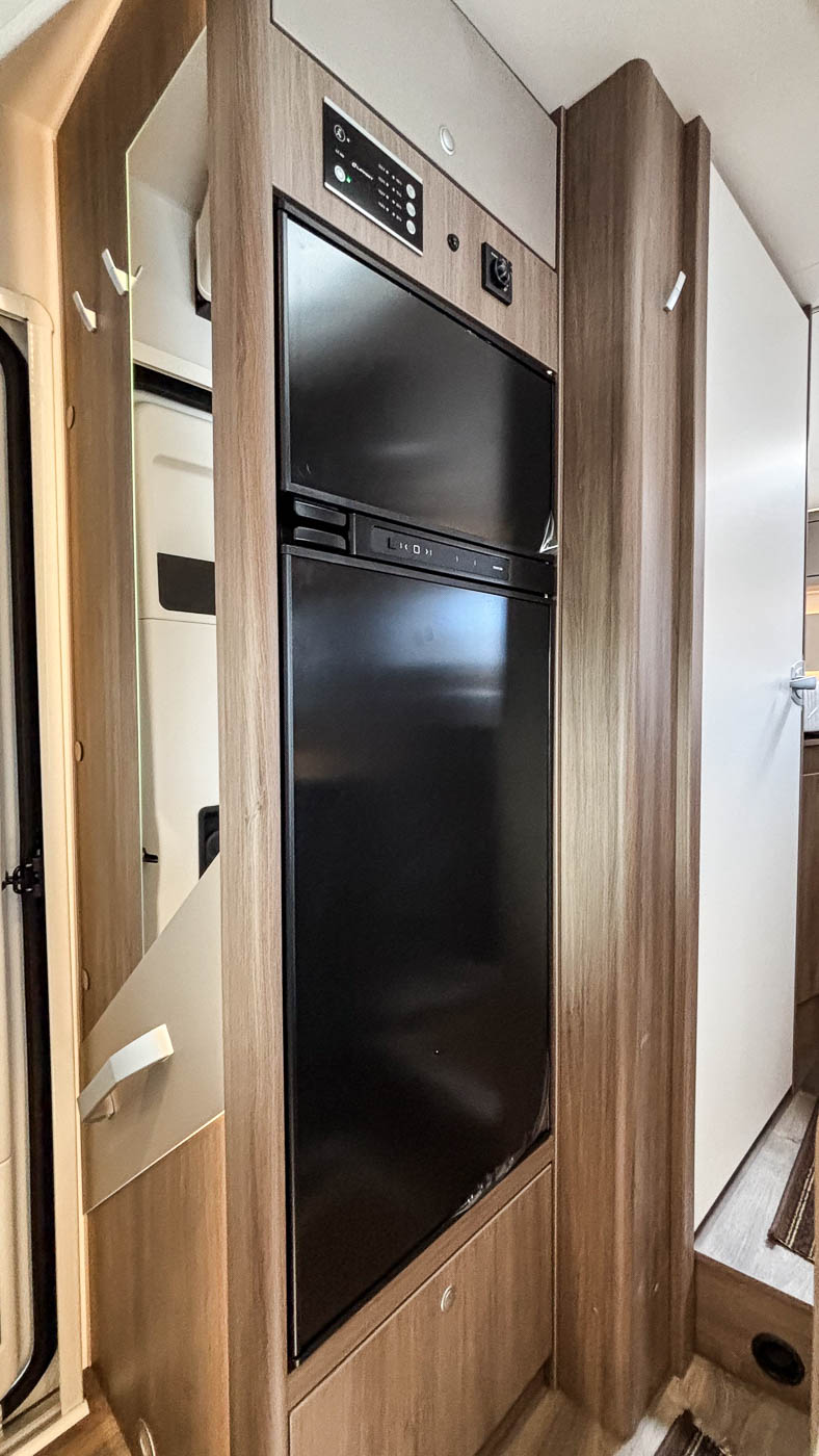 La cocina la encontramos en la parte central del vehículo y está completamente equipada: cuenta con dos fuegos, fregadero y frigorífico grande con congelador independiente.