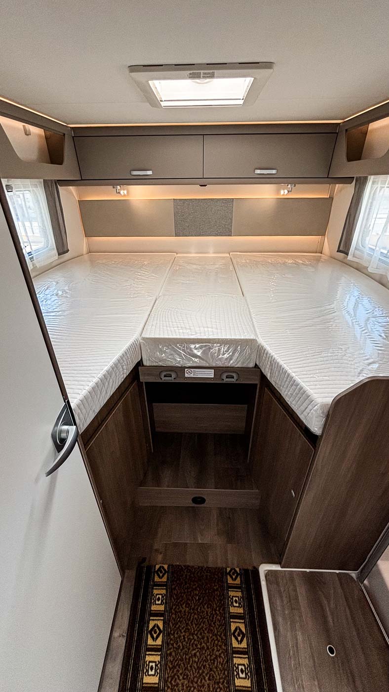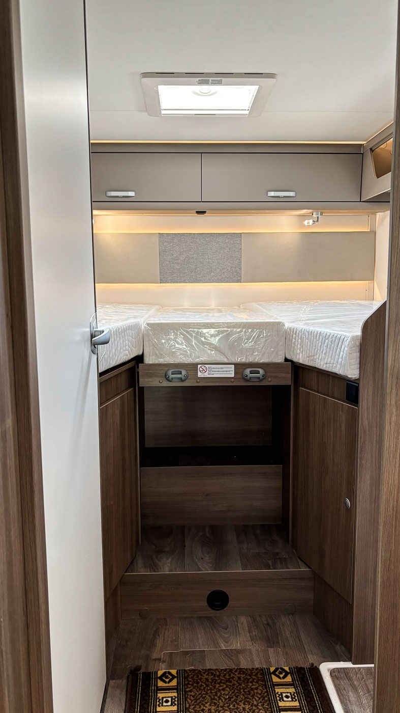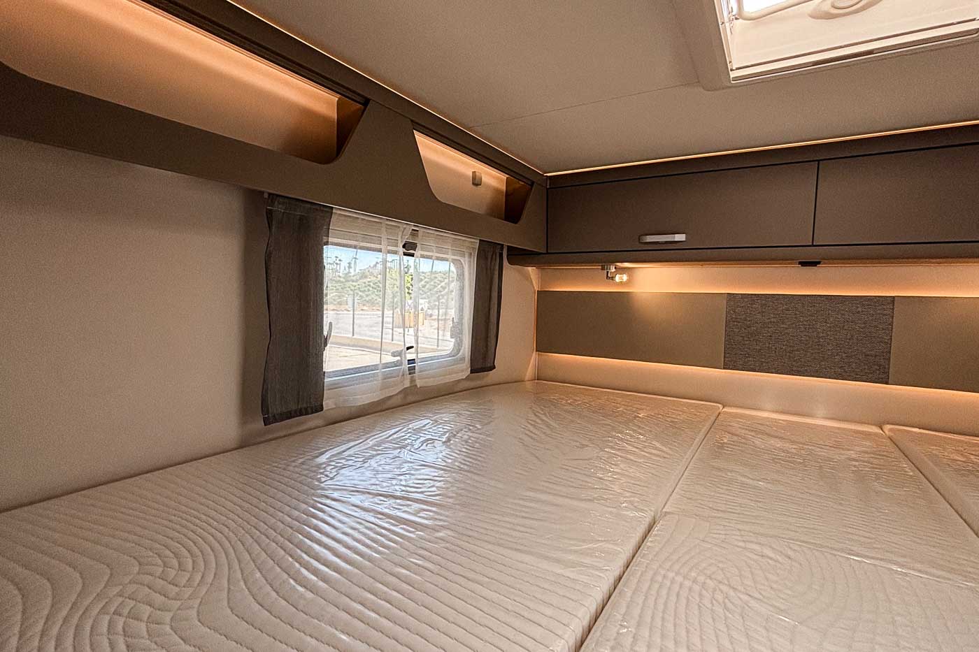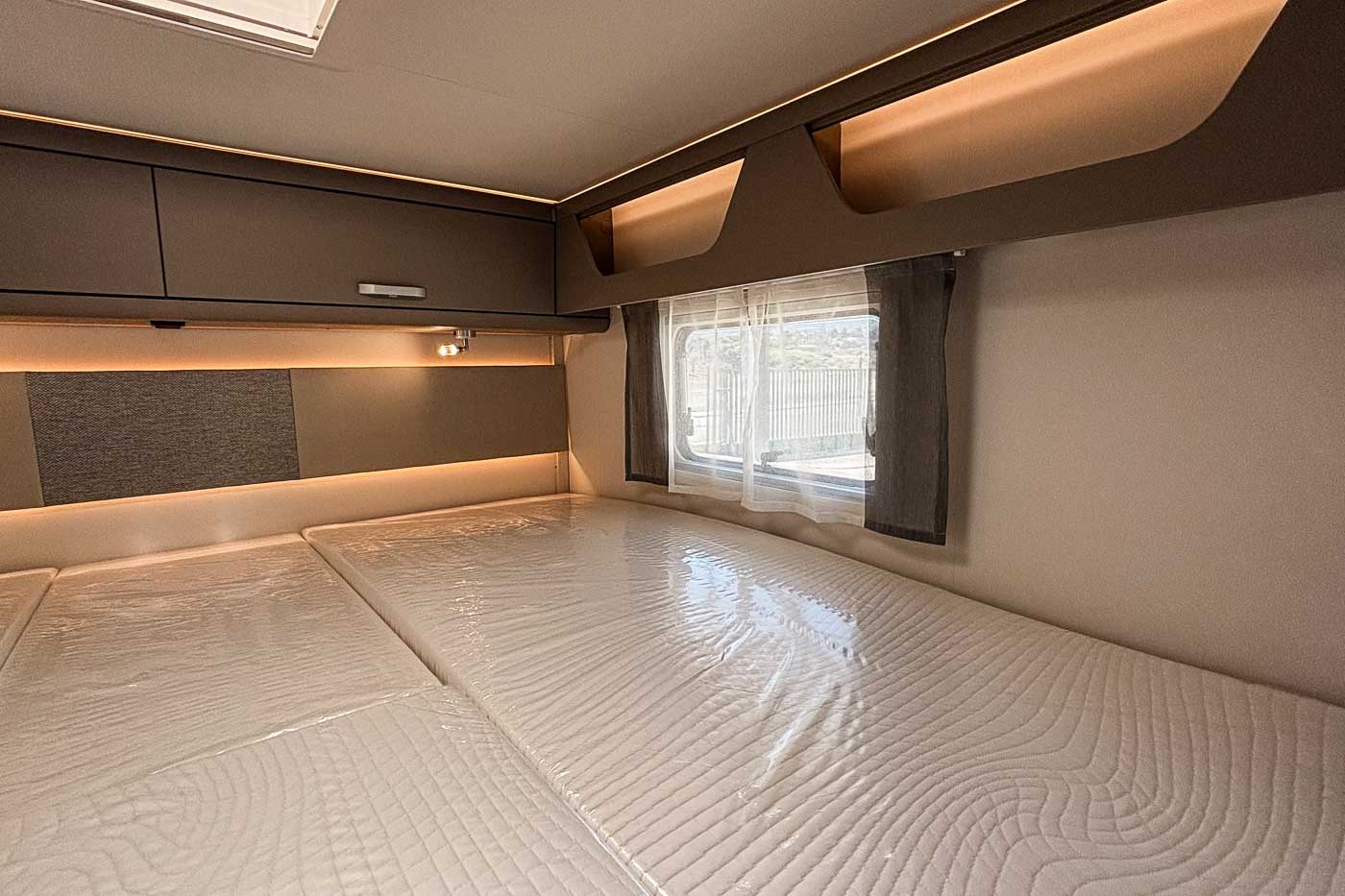 Su distribución interior se caracteriza principalmente por disponer de camas gemelas en la parte trasera, transformable en una cama de grandes dimensiones. Cuenta con numerosos espacios de almacenamiento, tanto en la parte superior como en la parte inferior de la cama.