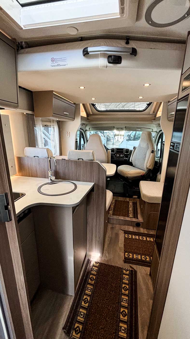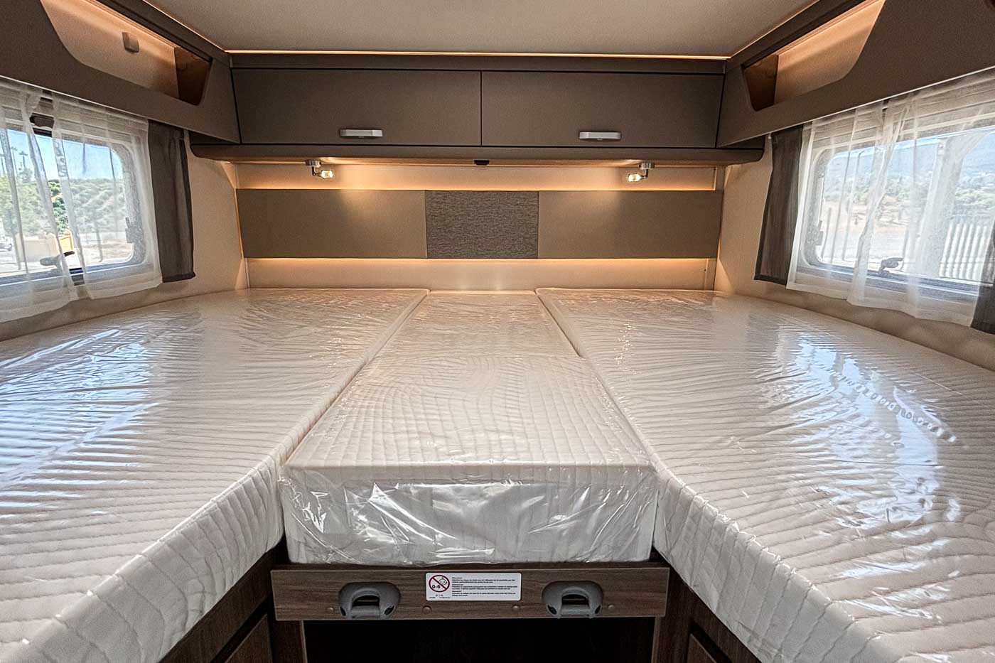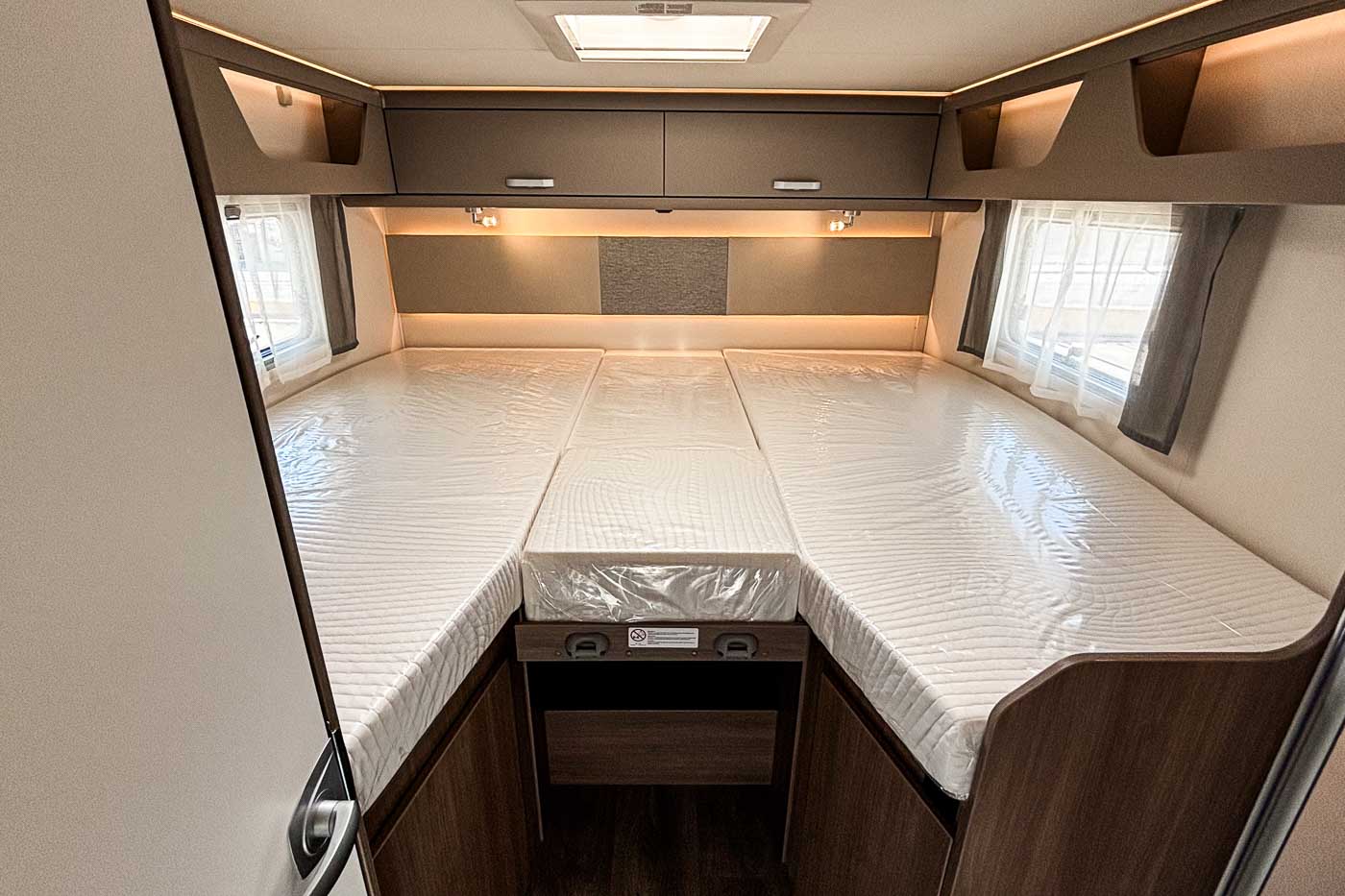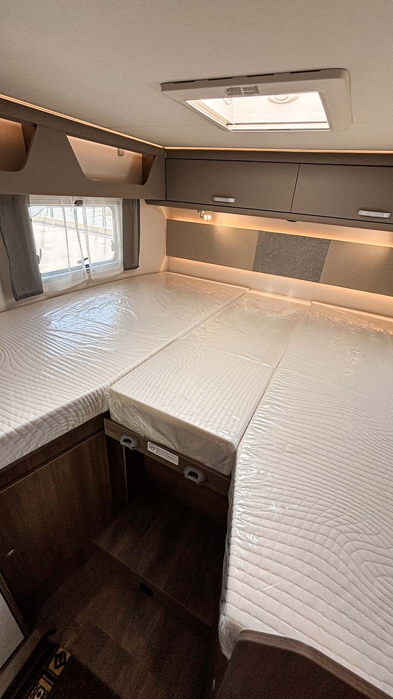 Su distribución interior se caracteriza principalmente por disponer de camas gemelas en la parte trasera, transformable en una cama de grandes dimensiones. Cuenta con numerosos espacios de almacenamiento, tanto en la parte superior como en la parte inferior de la cama.