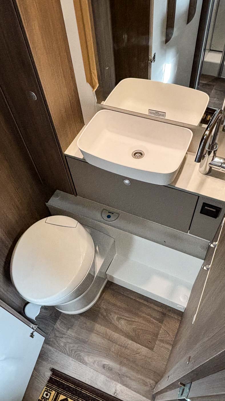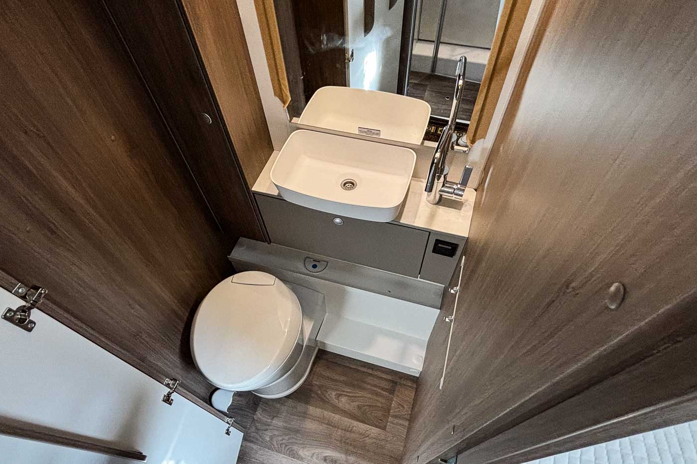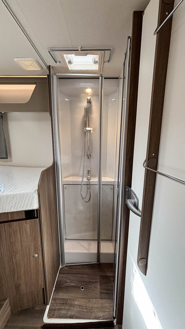 El baño está equipado con todo lo necesario: W.C, lavamanos y varios espacios de almacenamiento para nuestro equipaje. Frente al baño encontramos la cabina de ducha, espaciosa e independiente del baño. Podemos aislar este espacio del resto del habitáculo gracias a la puerta del baño para mayor intimidad.