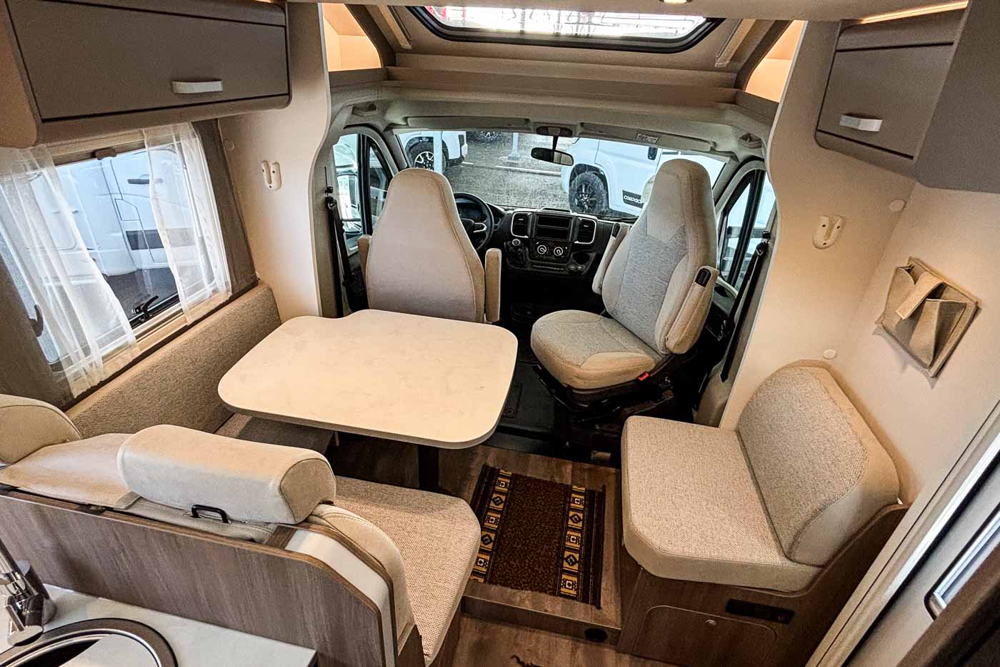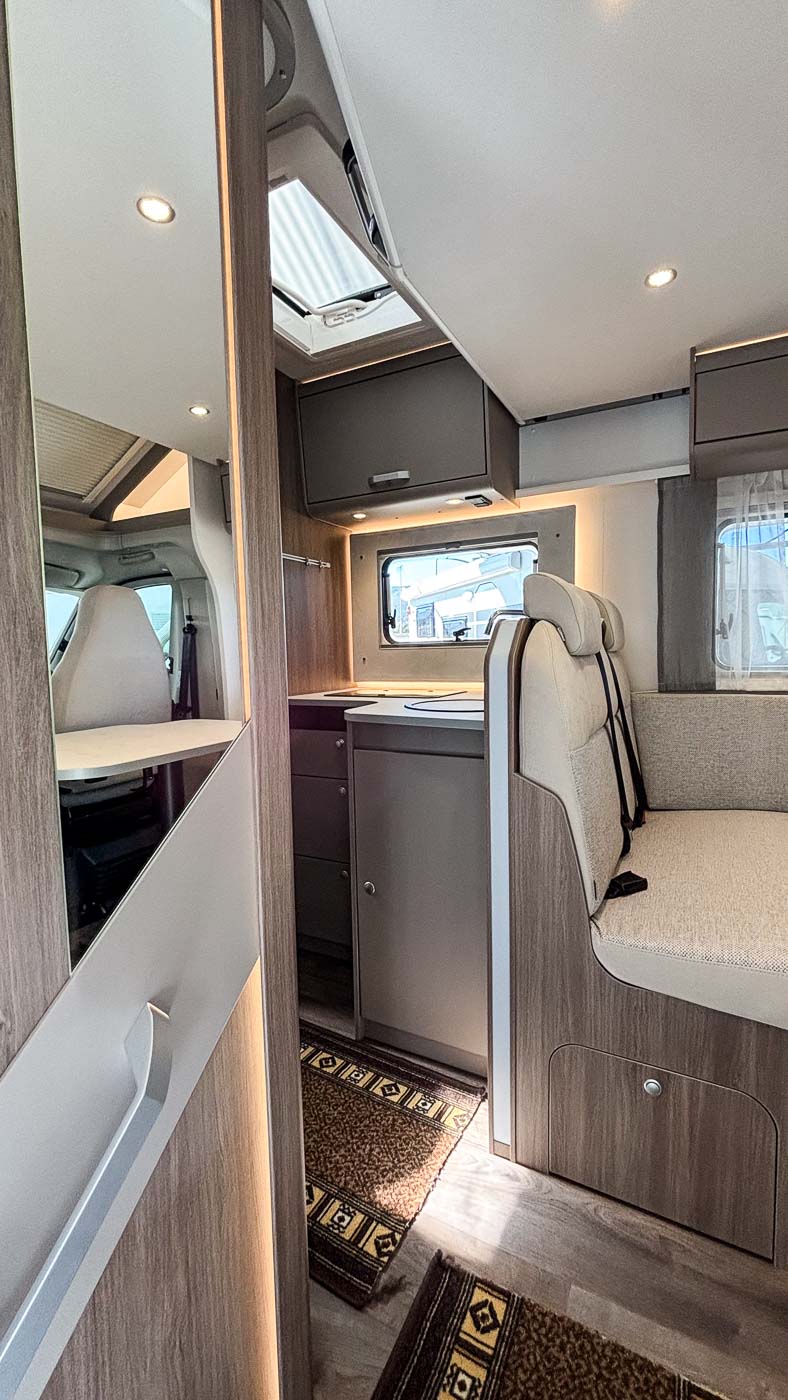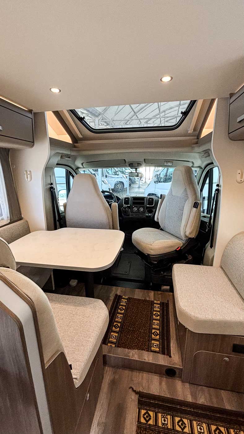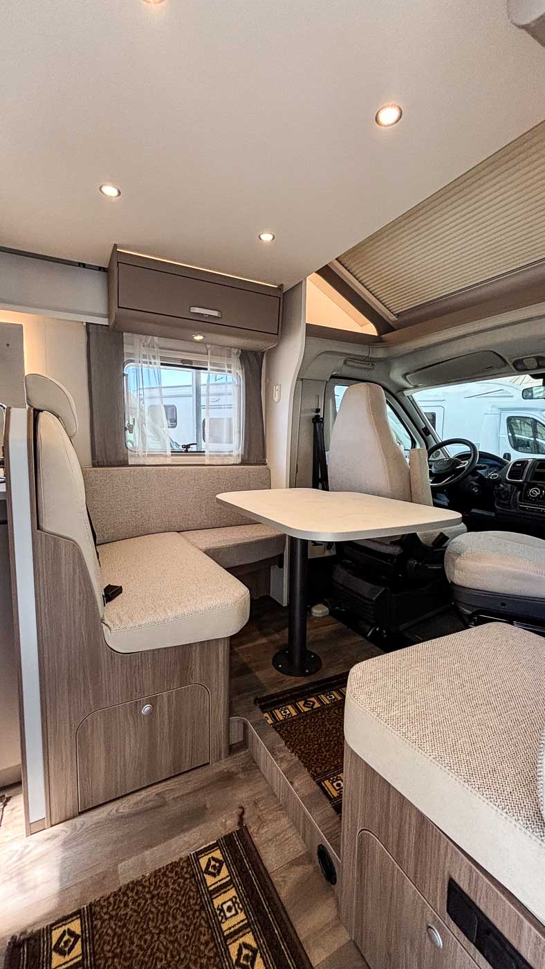 Dispone de cómodo salón con capacidad para cuatro personas gracias a los asientos giratorios de la cabina. Sobre el salón se dispone una segunda cama doble, perfectamente integrada en el techo y fácilmente abatible, ofreciendo así hasta cuatro plazas para dormir.