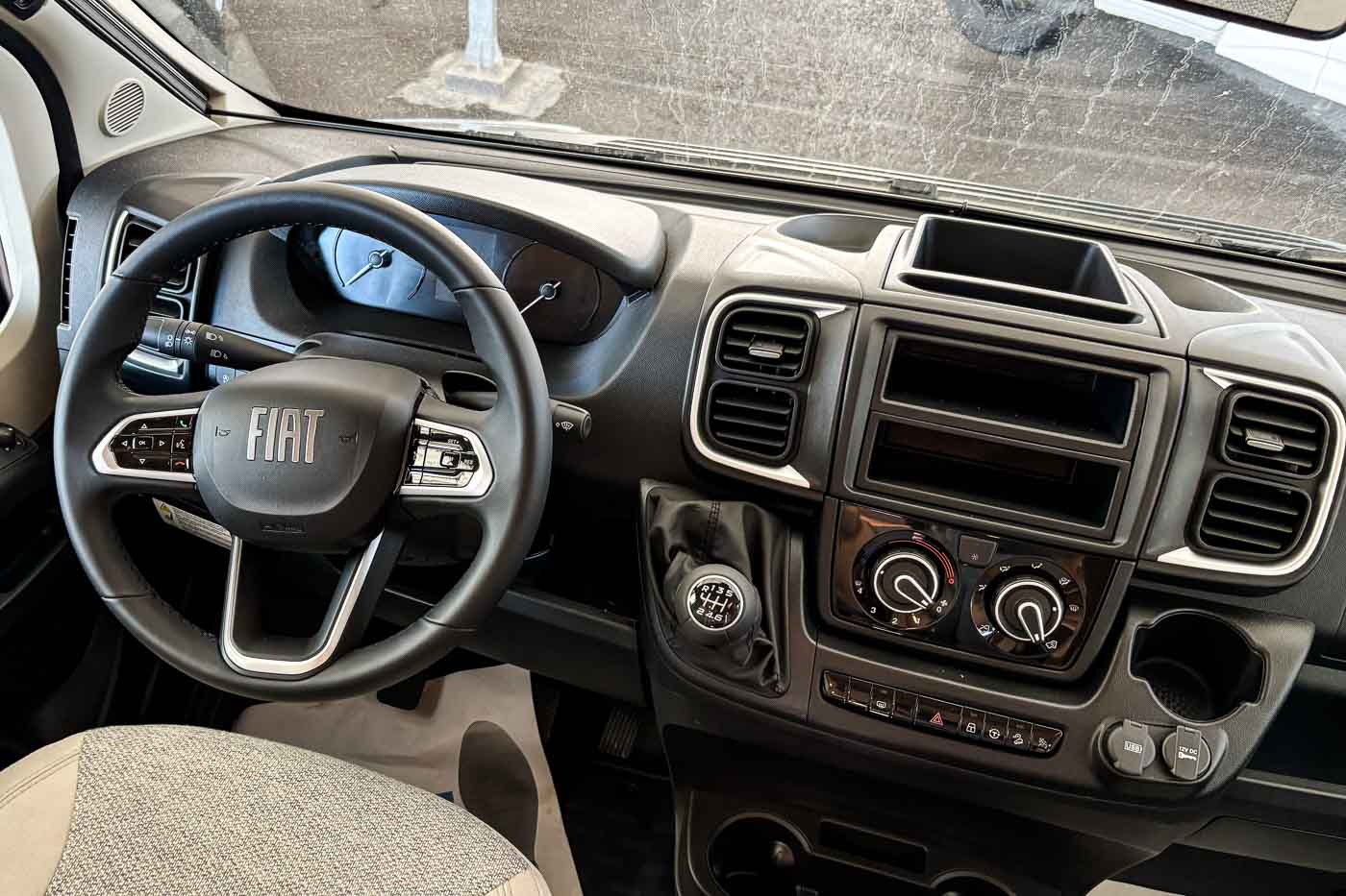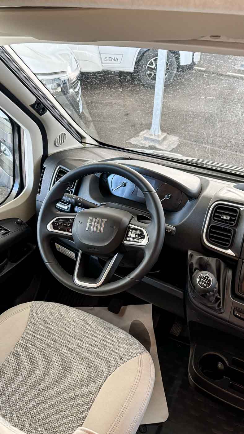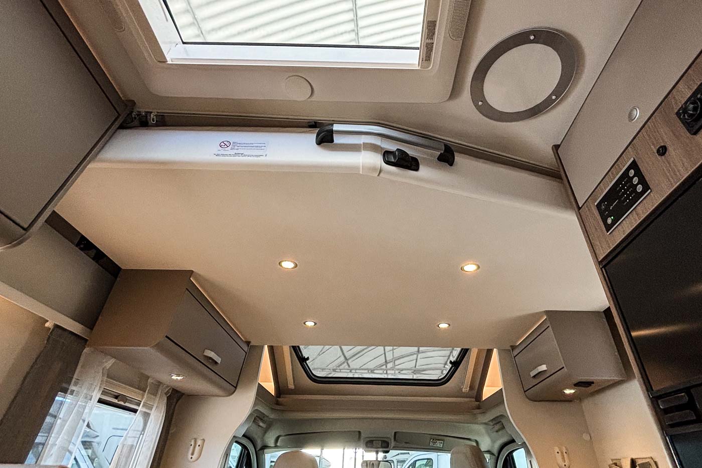 Dispone de cómodo salón con capacidad para cuatro personas gracias a los asientos giratorios de la cabina. Sobre el salón se dispone una segunda cama doble, perfectamente integrada en el techo y fácilmente abatible, ofreciendo así hasta cuatro plazas para dormir.