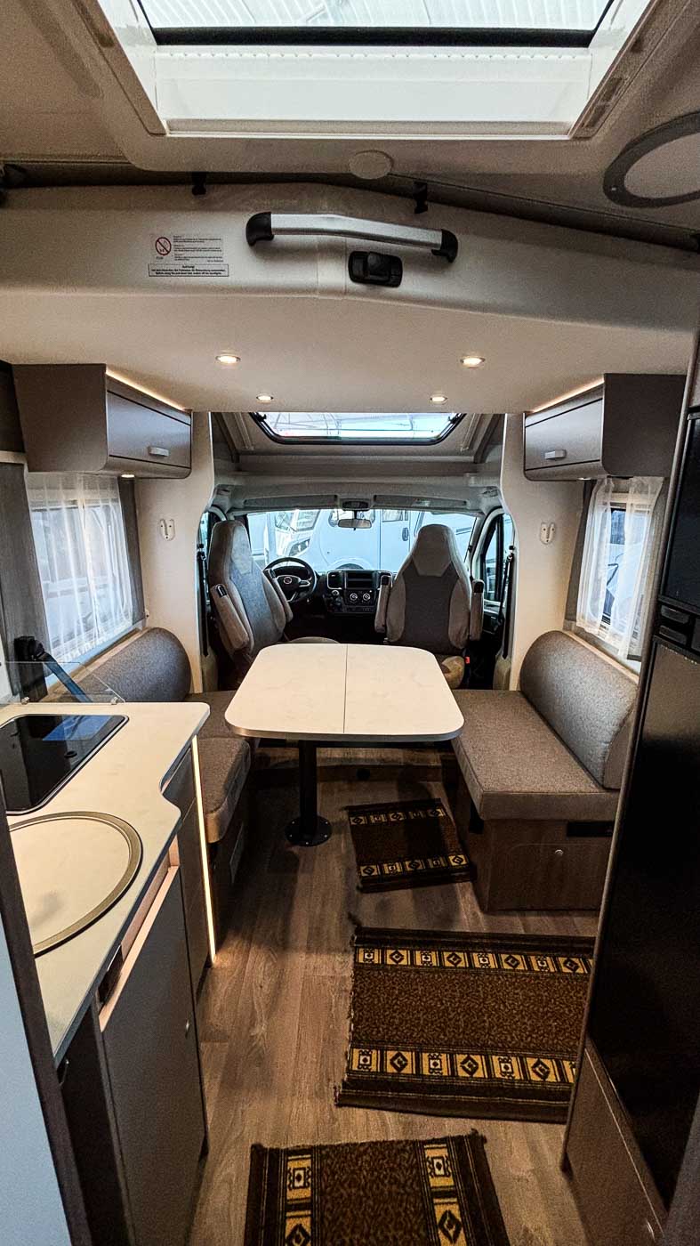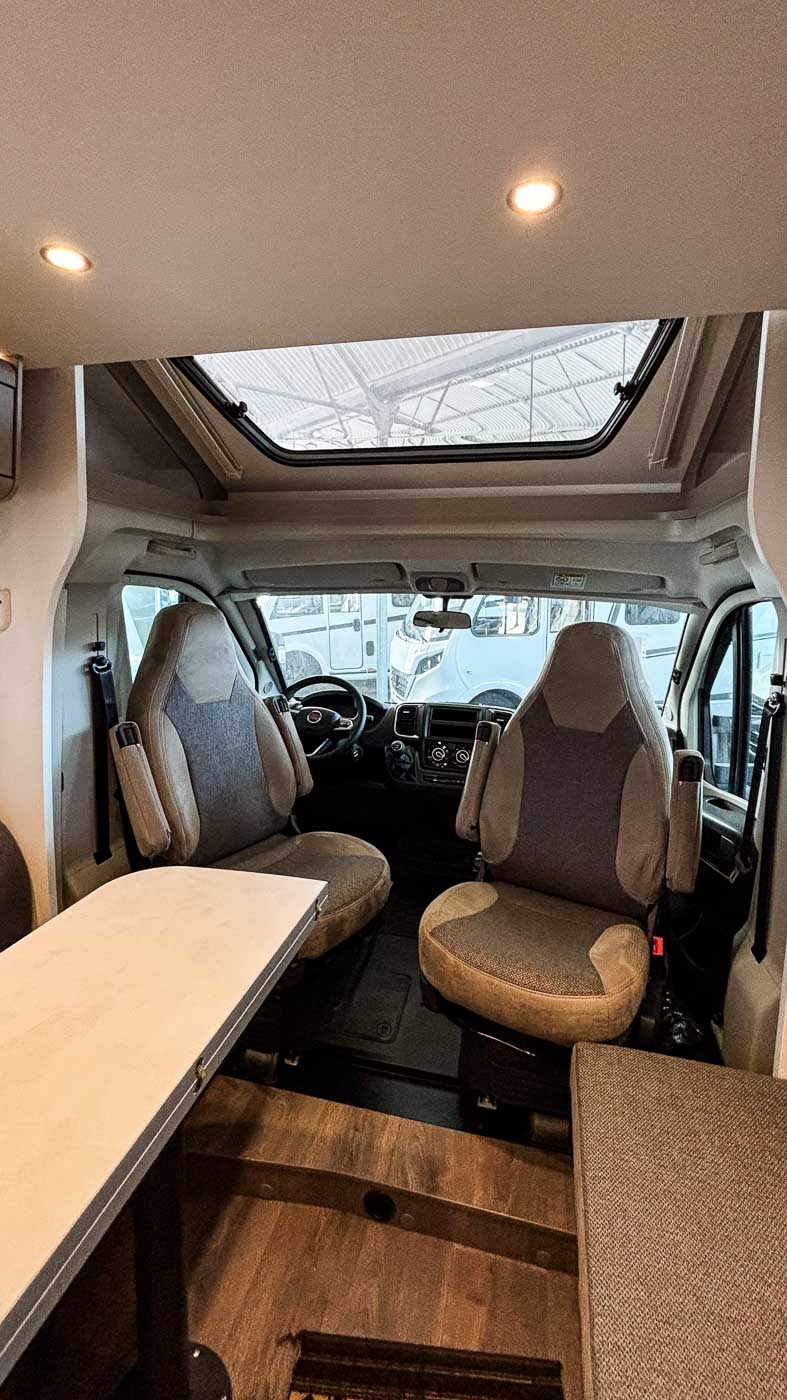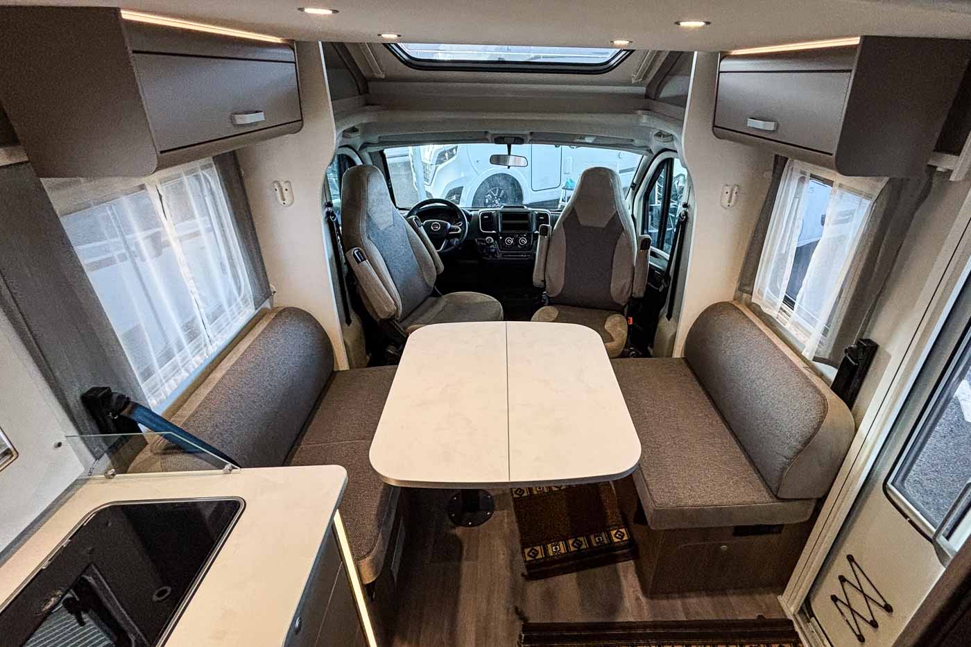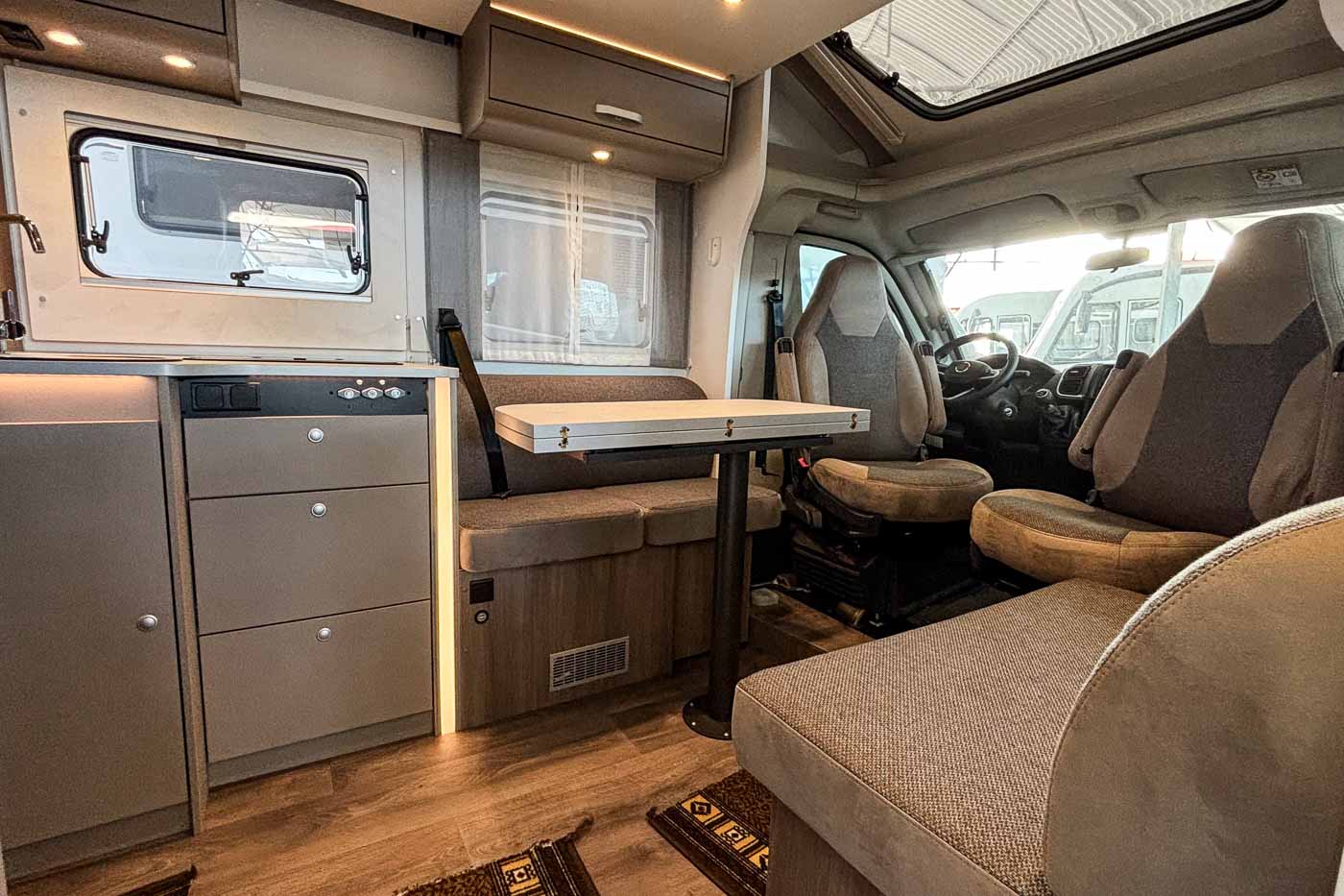Dispone de gran salón “face to face”, con capacidad para cuatro personas, gracias a los asientos enfrentados, los asientos giratorios de la cabina y la mesa central plegable. Sobre el salón se dispone una segunda cama doble, perfectamente integrada en el techo, ofreciendo así hasta cuatro plazas para dormir.