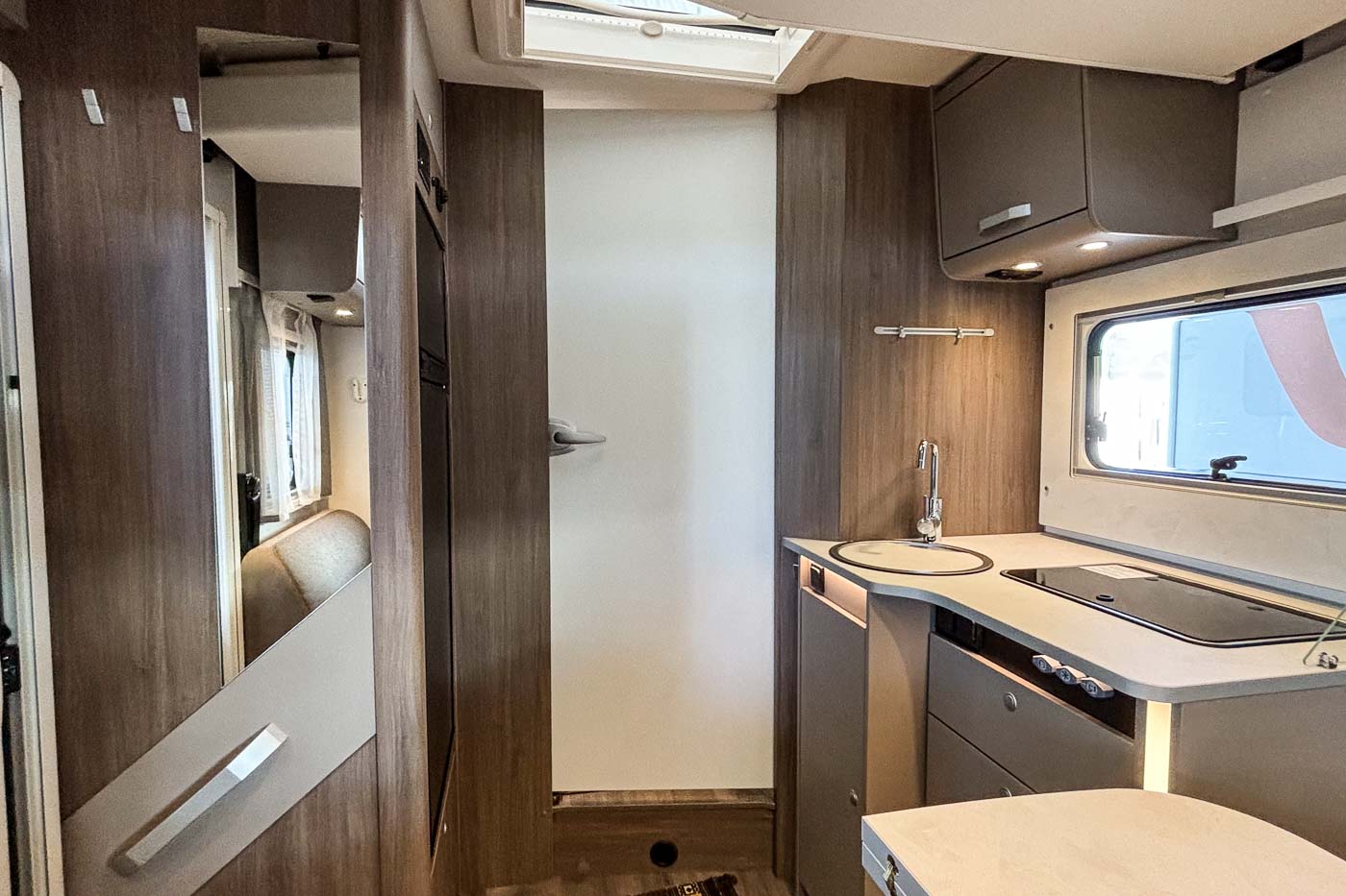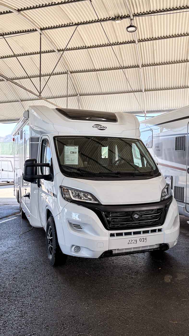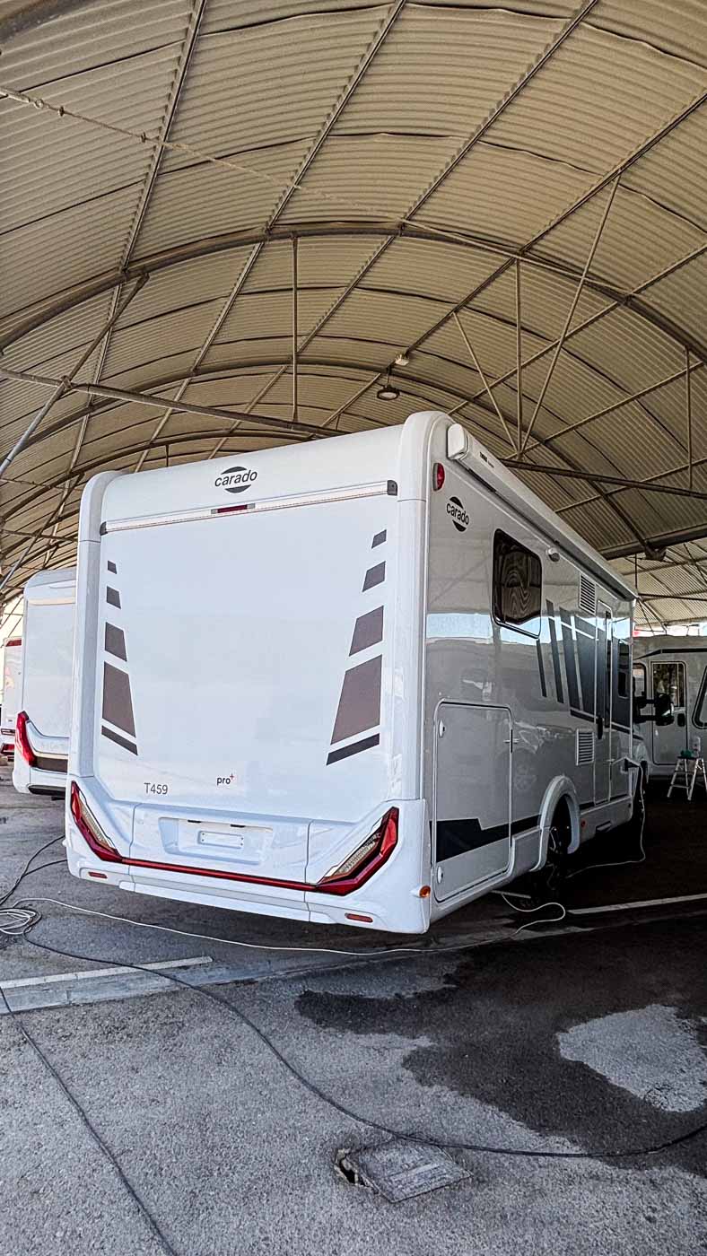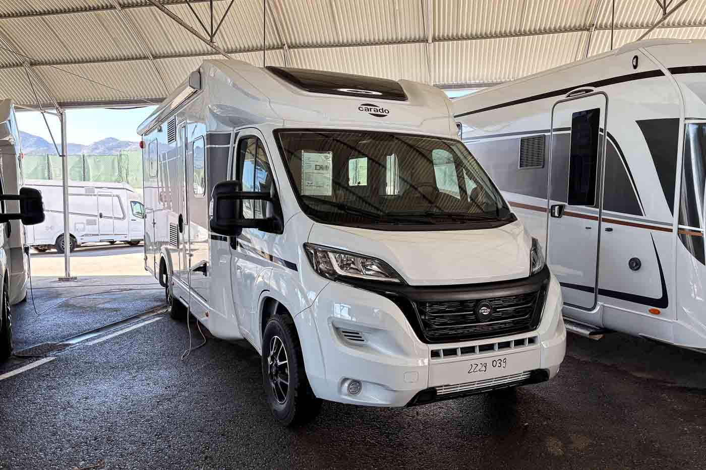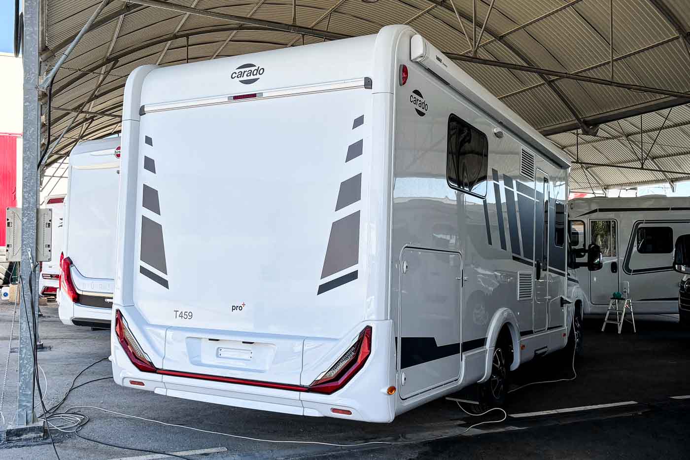 La Carado T 459 PRO es una autocaravana perfilada con capacidad para cuatro personas. Su distribución interior se caracteriza principalmente por disponer de amplia cama isla en la parte trasera, regulable en altura y fácilmente accesible desde ambos laterales. Cuenta con numerosos espacios de almacenamiento, tanto en la parte superior como en la parte inferior de la cama.