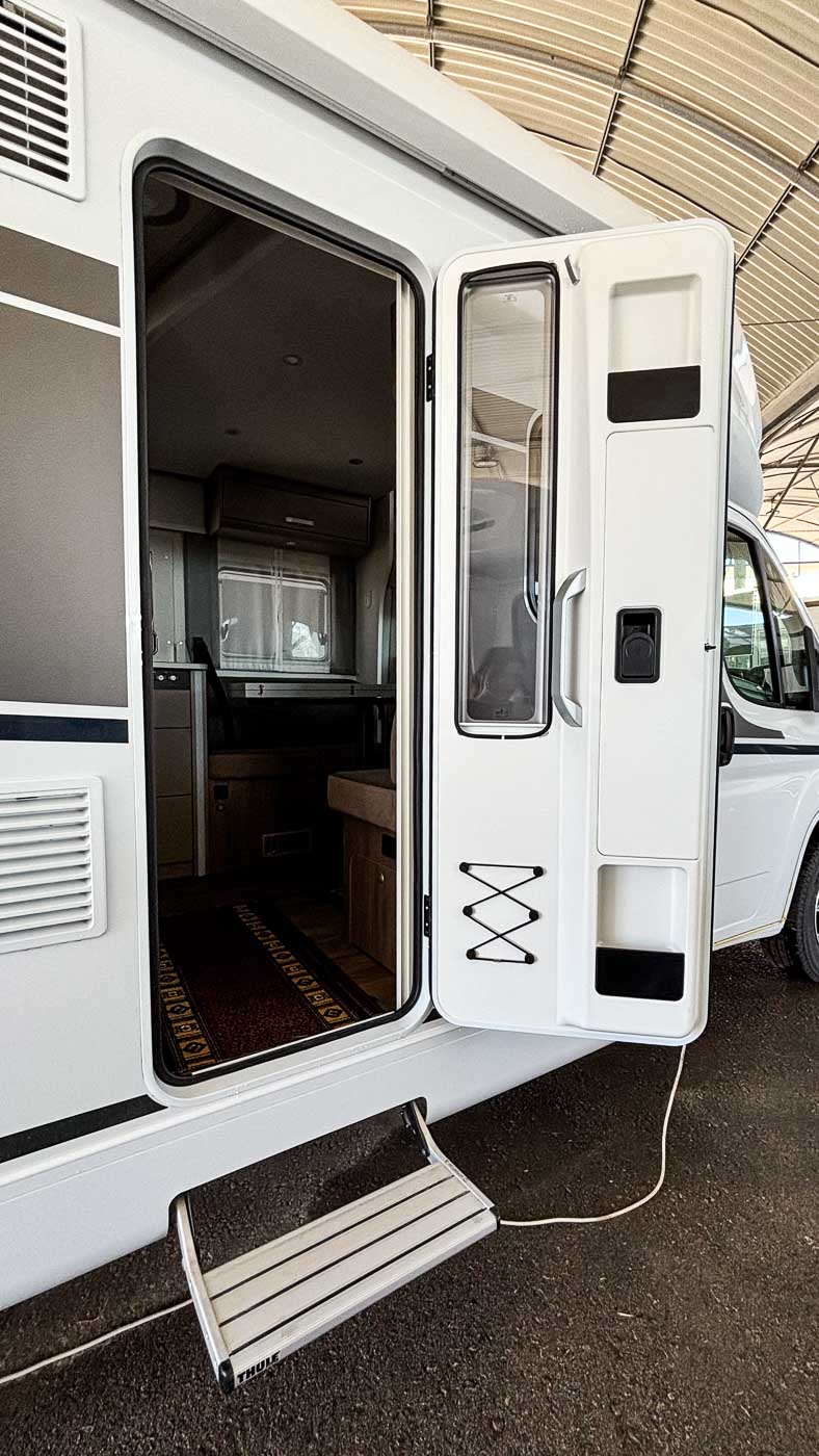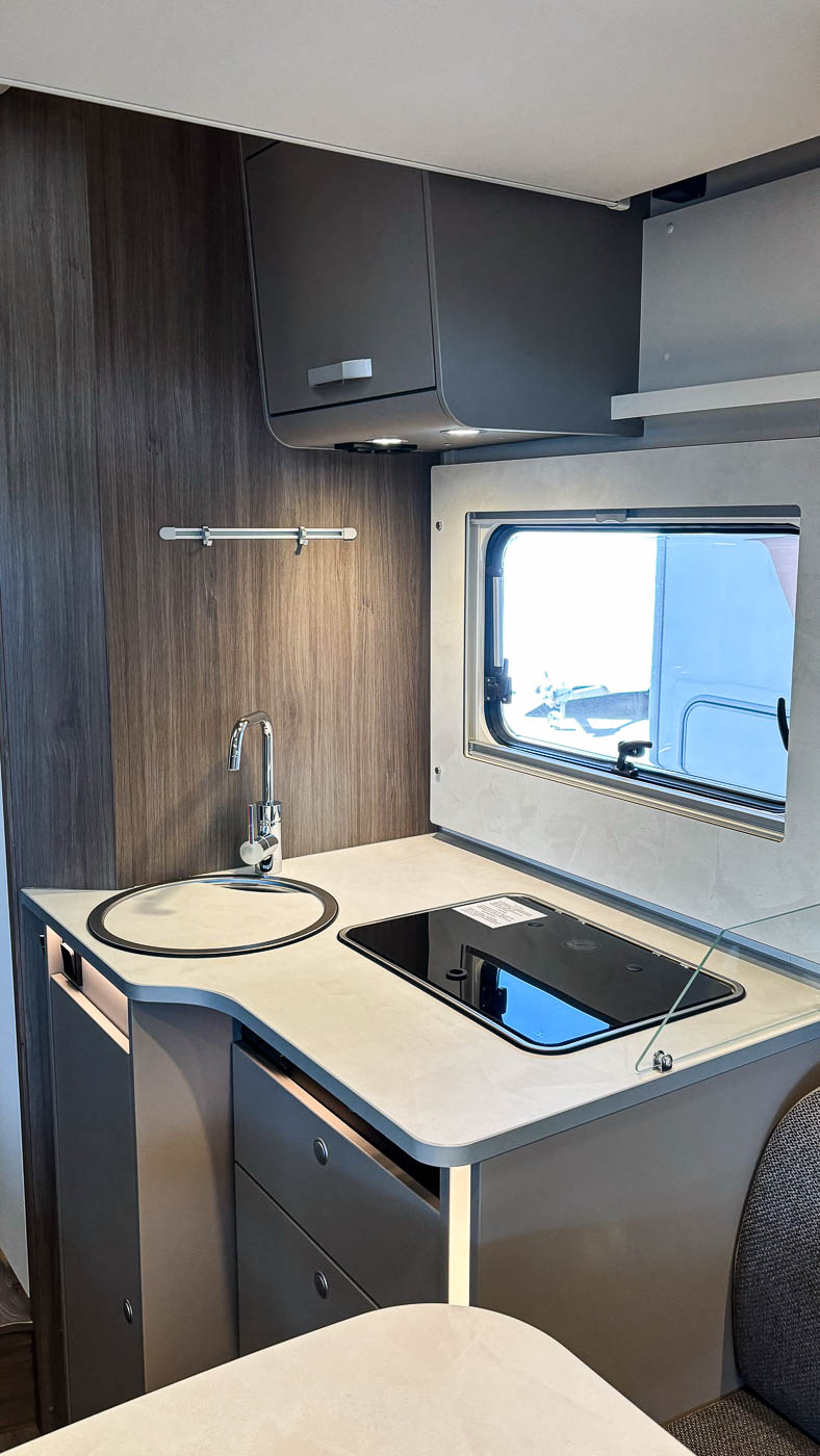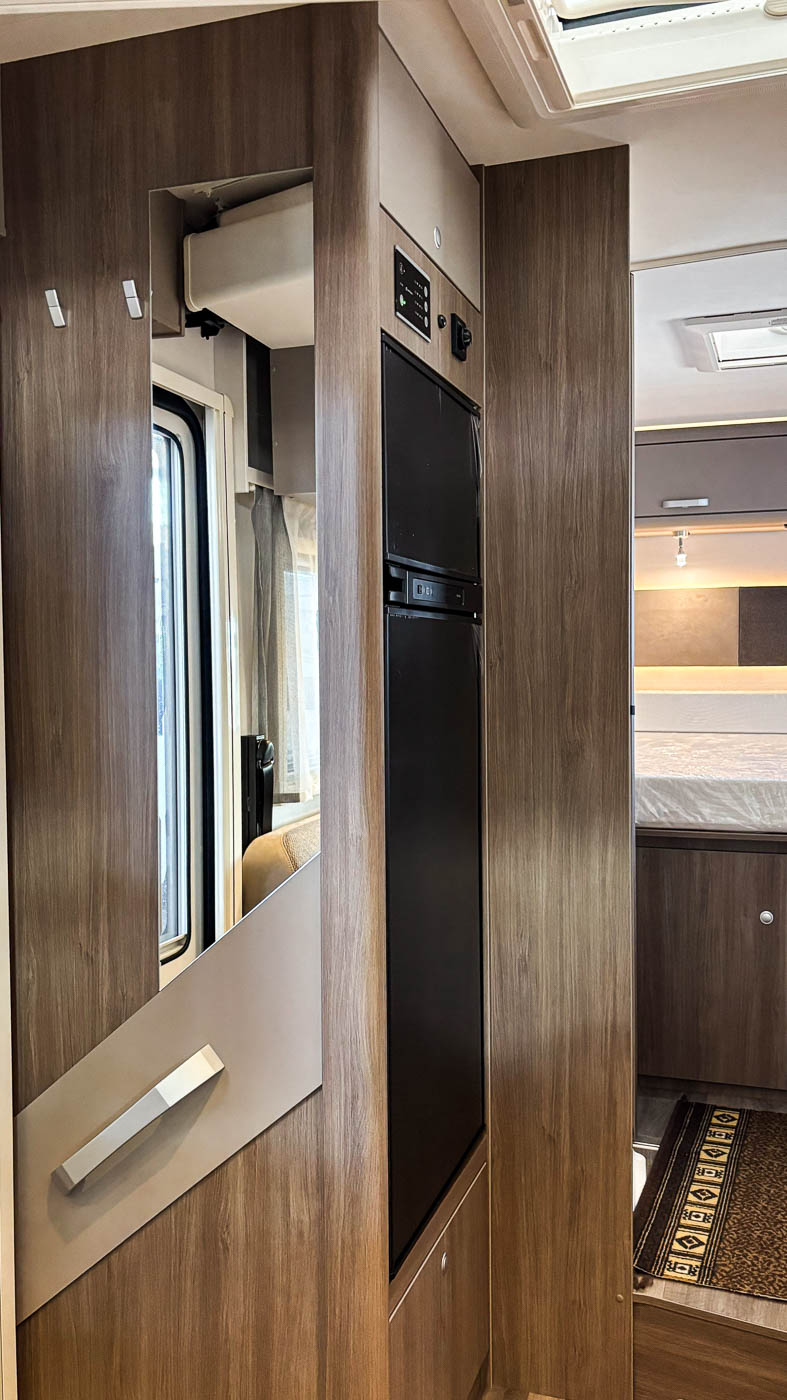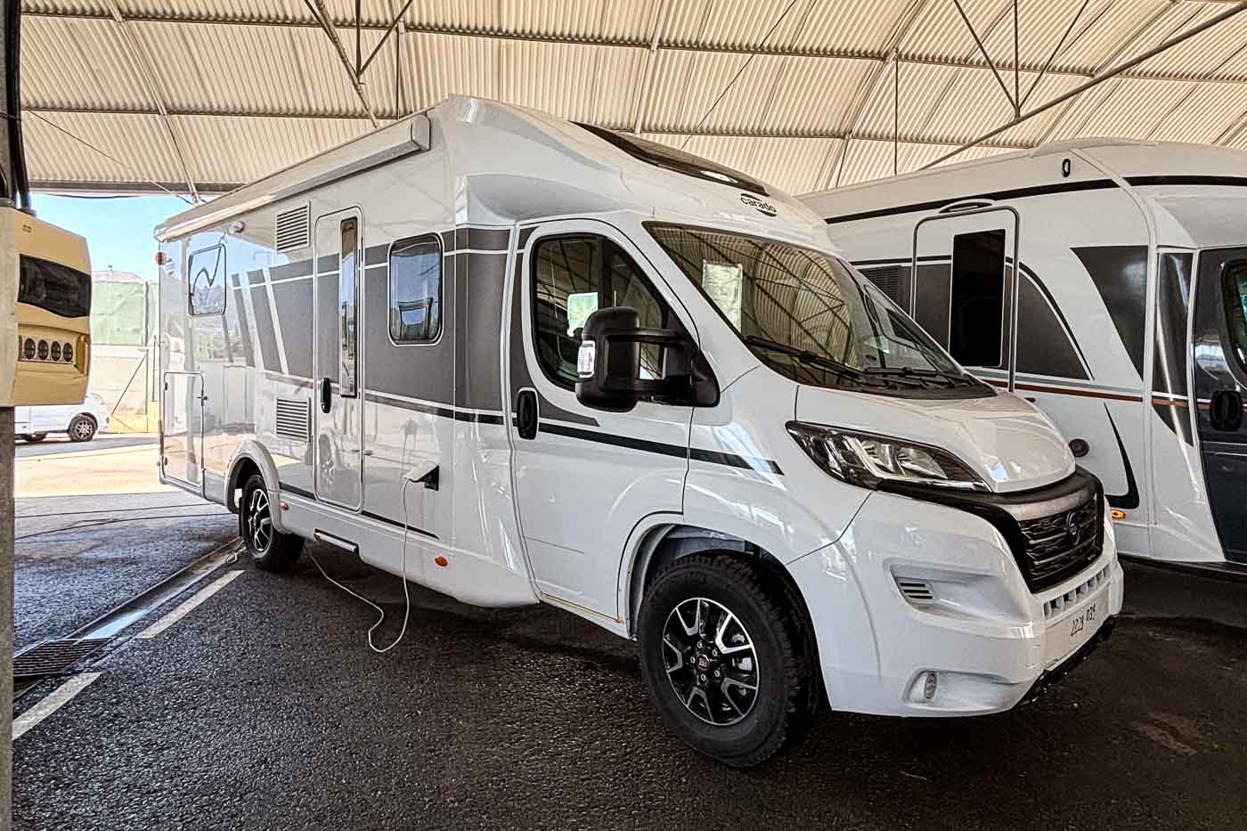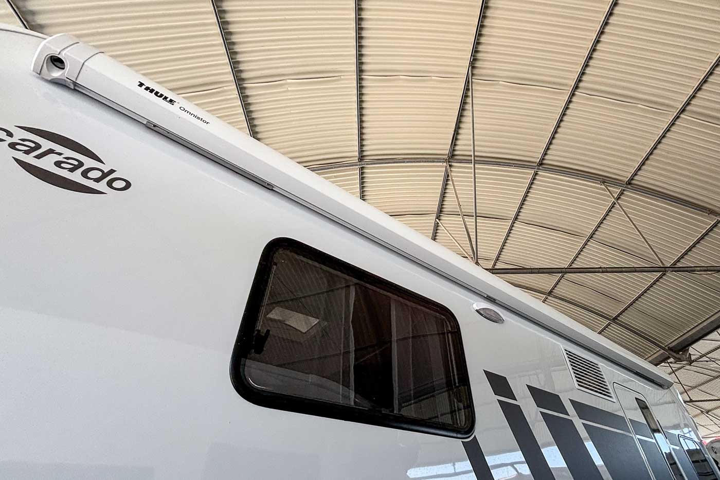 La Carado T 459 PRO es una autocaravana perfilada con capacidad para cuatro personas. Su distribución interior se caracteriza principalmente por disponer de amplia cama isla en la parte trasera, regulable en altura y fácilmente accesible desde ambos laterales. Cuenta con numerosos espacios de almacenamiento, tanto en la parte superior como en la parte inferior de la cama.