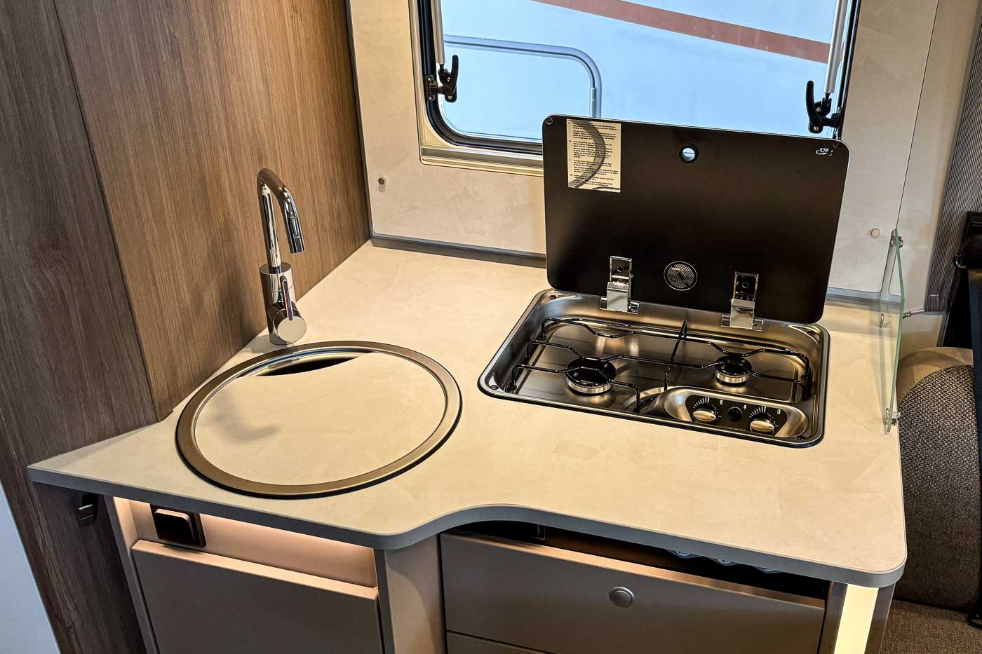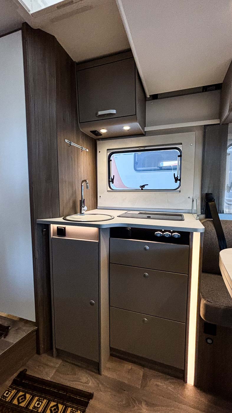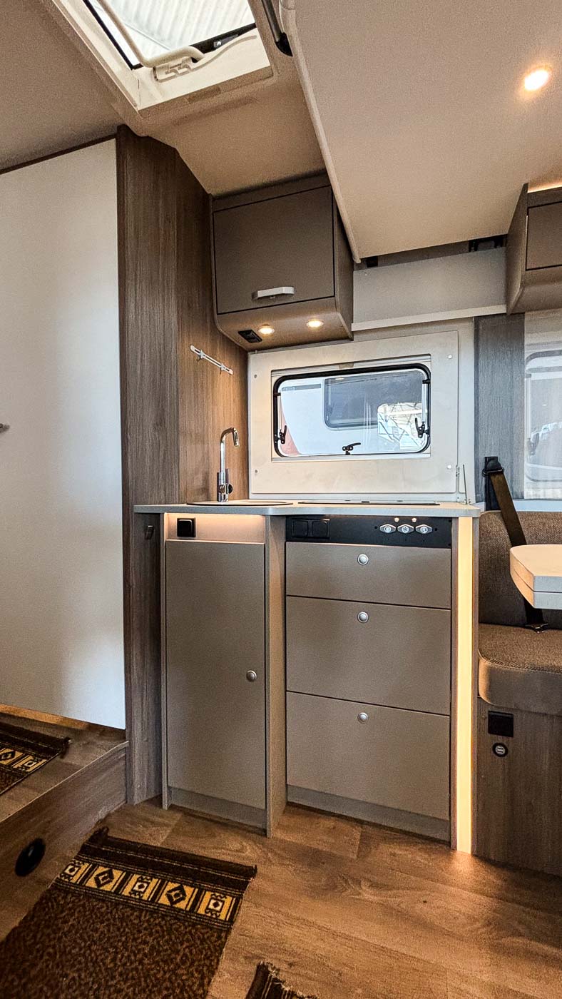 La cocina la encontramos en la parte central del vehículo y está completamente equipada: cuenta con tres fuegos, fregadero y frigorífico grande.