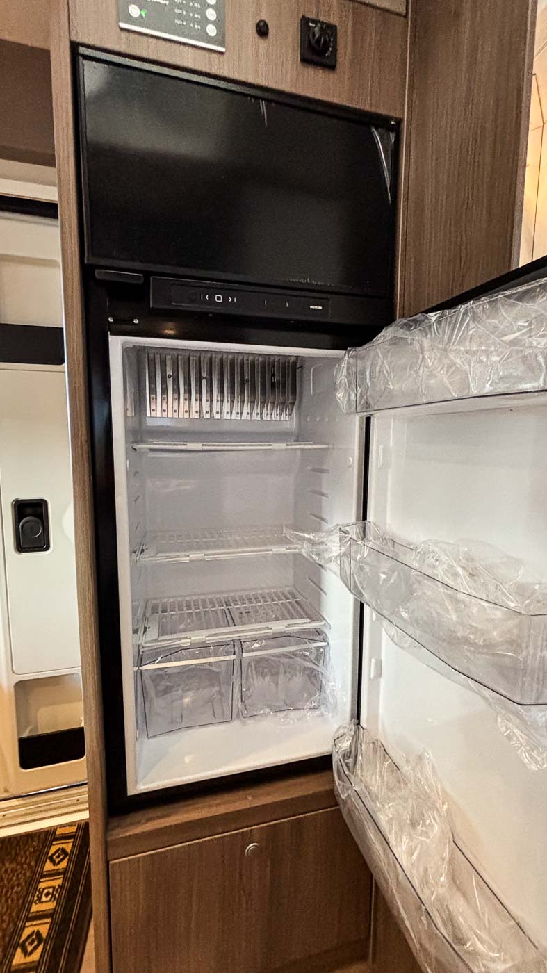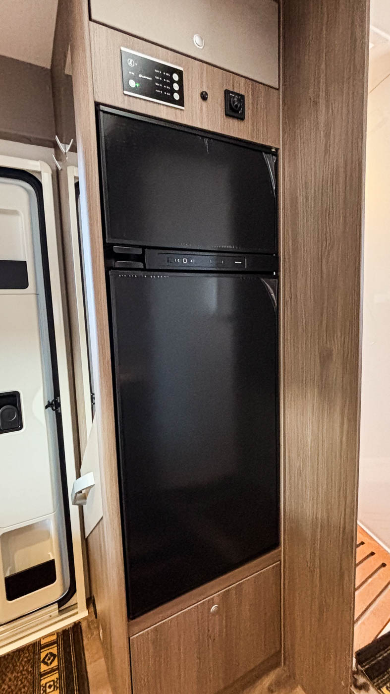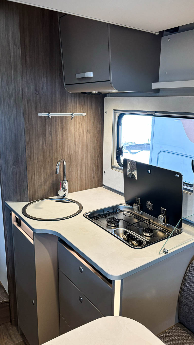 La cocina la encontramos en la parte central del vehículo y está completamente equipada: cuenta con tres fuegos, fregadero y frigorífico grande.