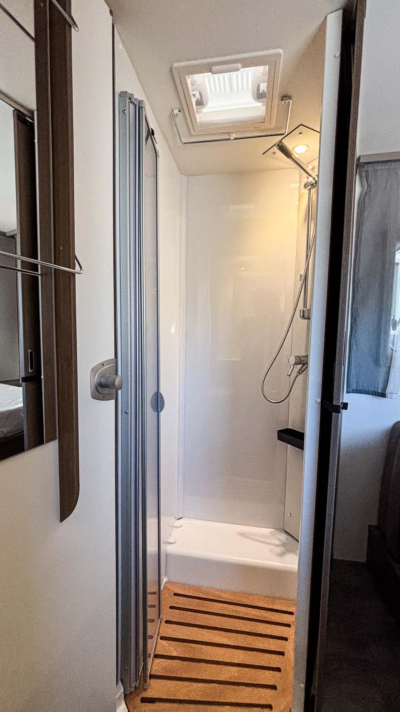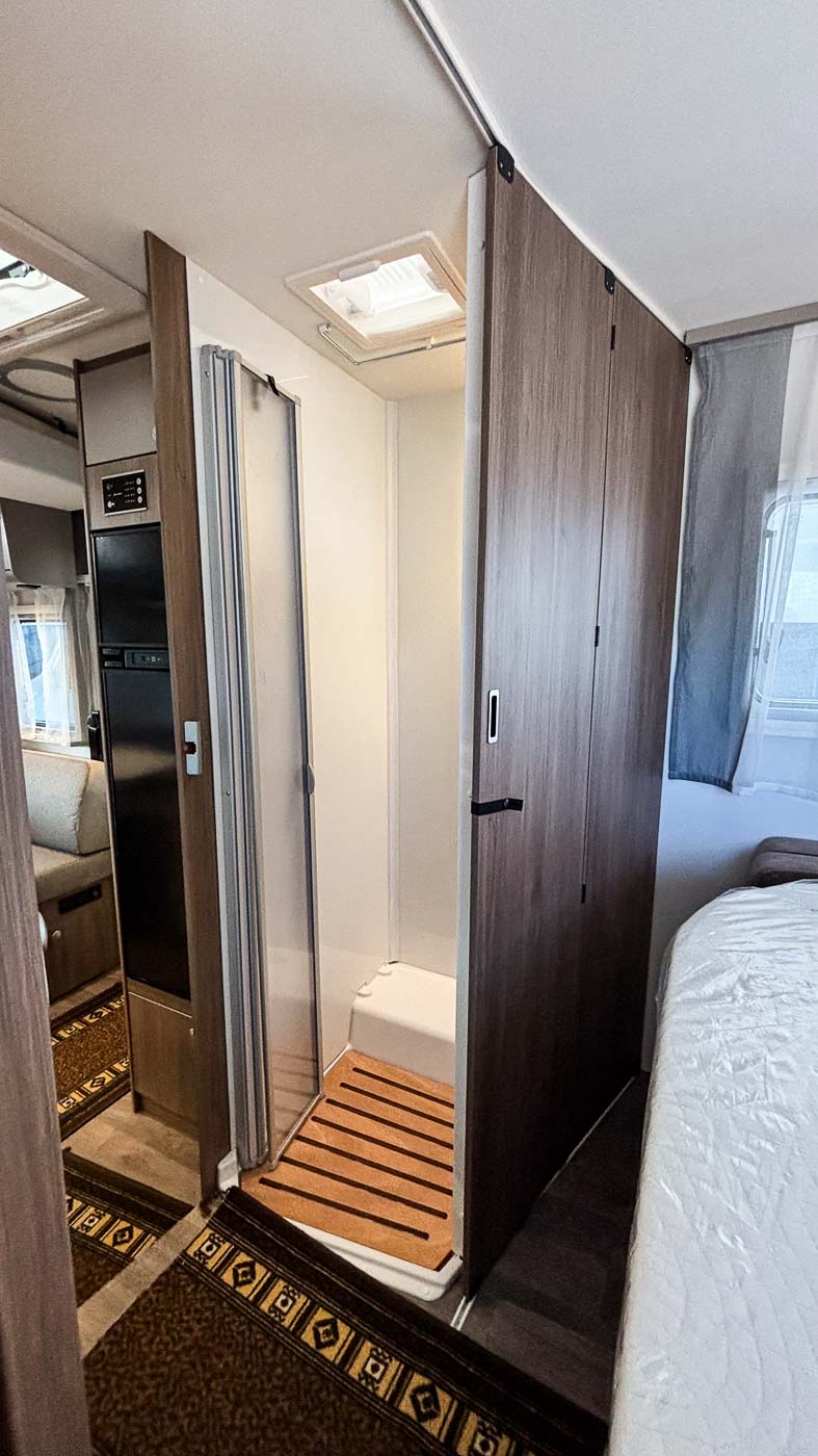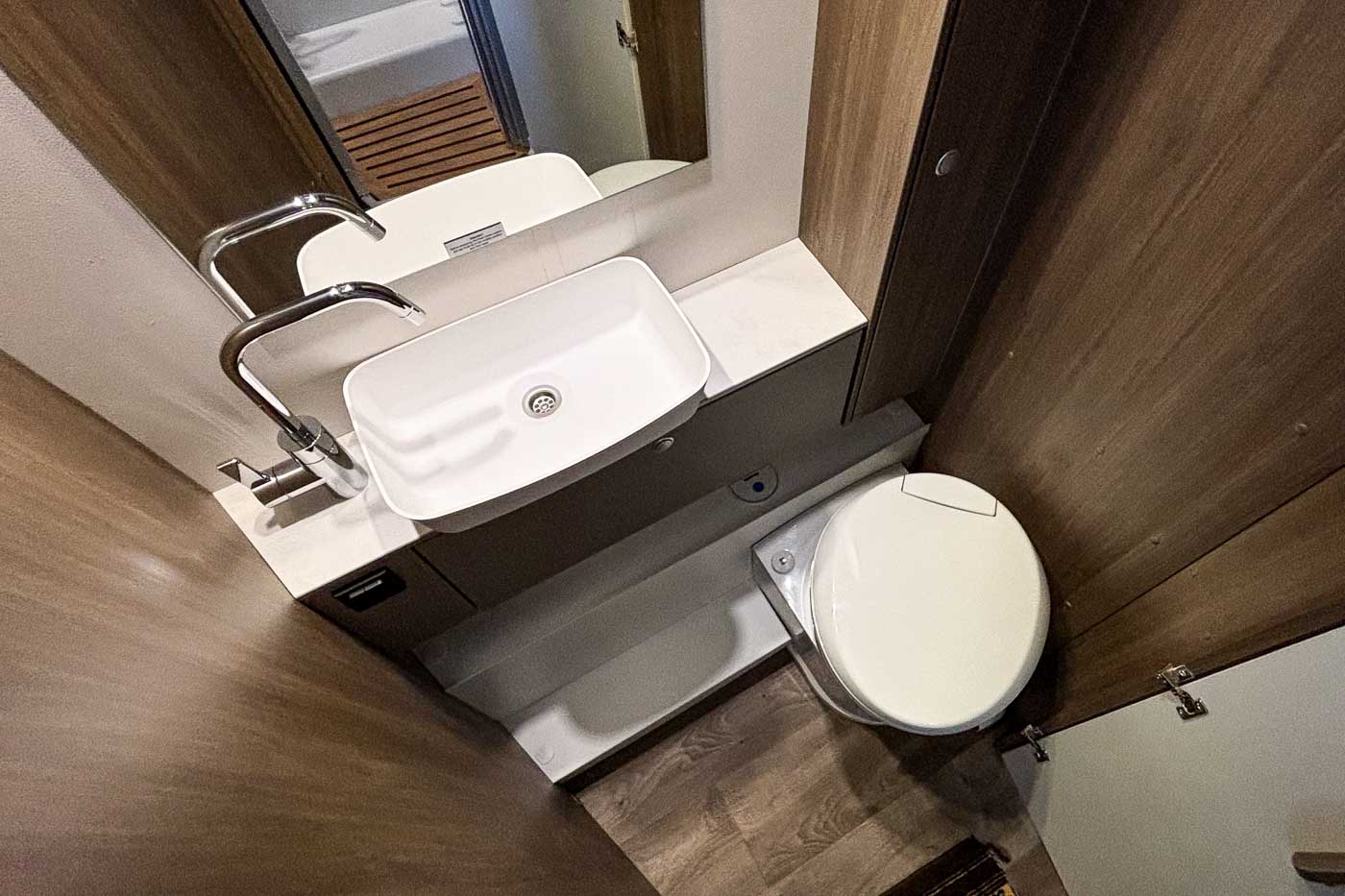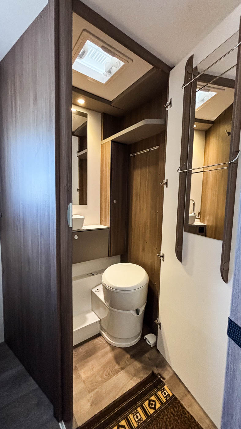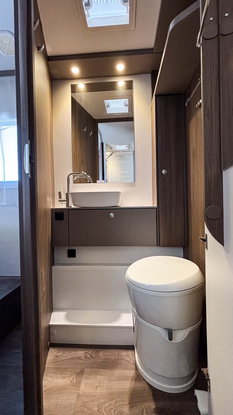 El baño está equipado con W.C, lavamanos y varios espacios de almacenamiento para nuestro equipaje; con cabina de ducha independiente, de grandes dimensiones y cómoda. La puerta del baño permite cerrar la zona trasera del habitáculo para mayor independencia.