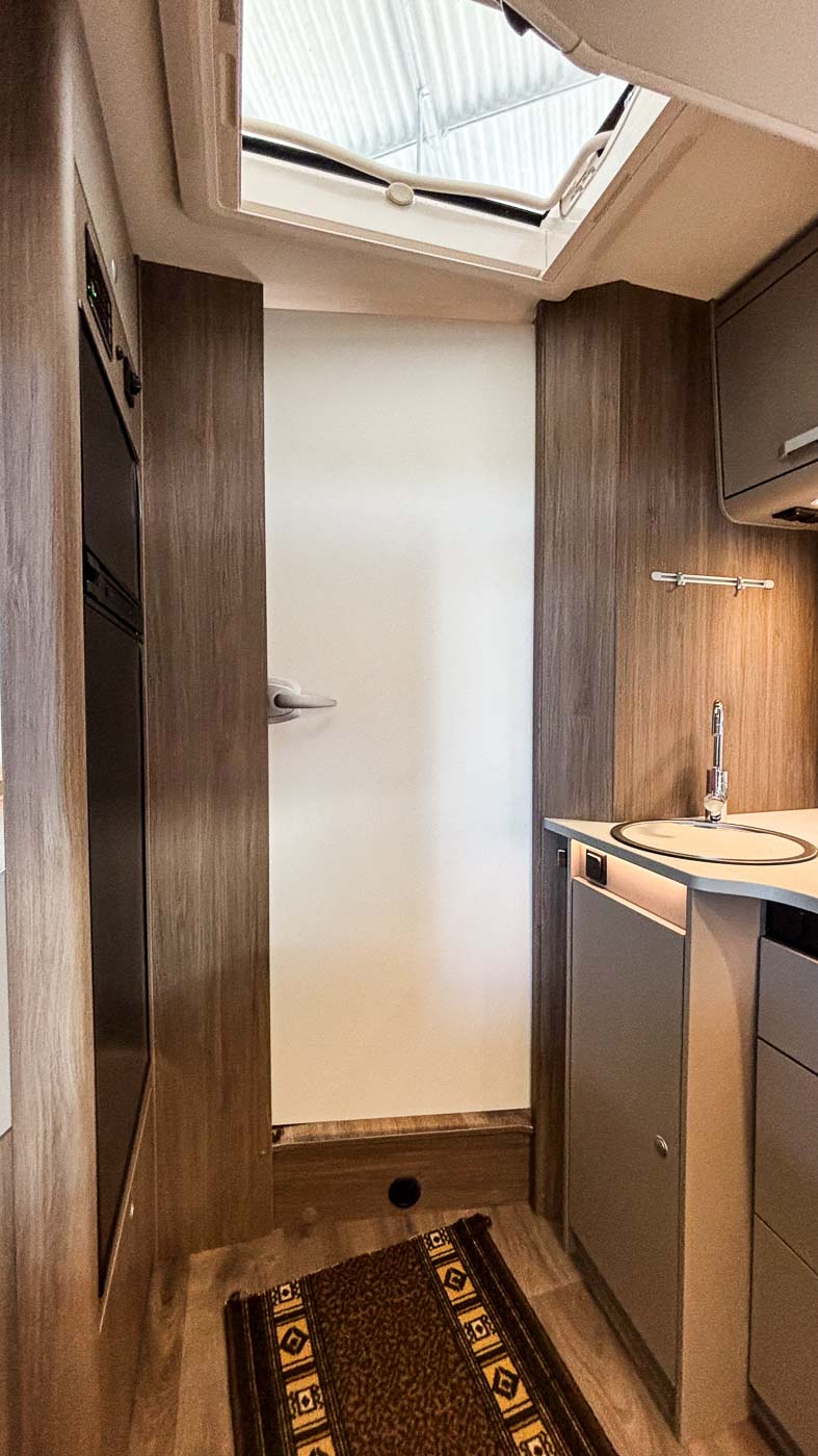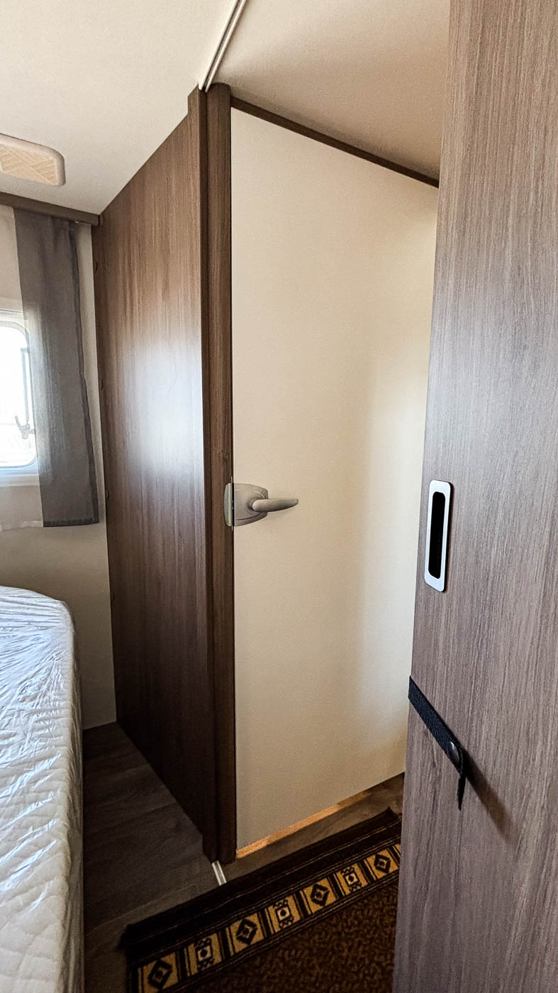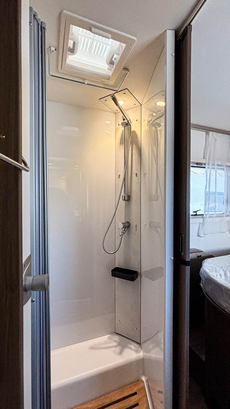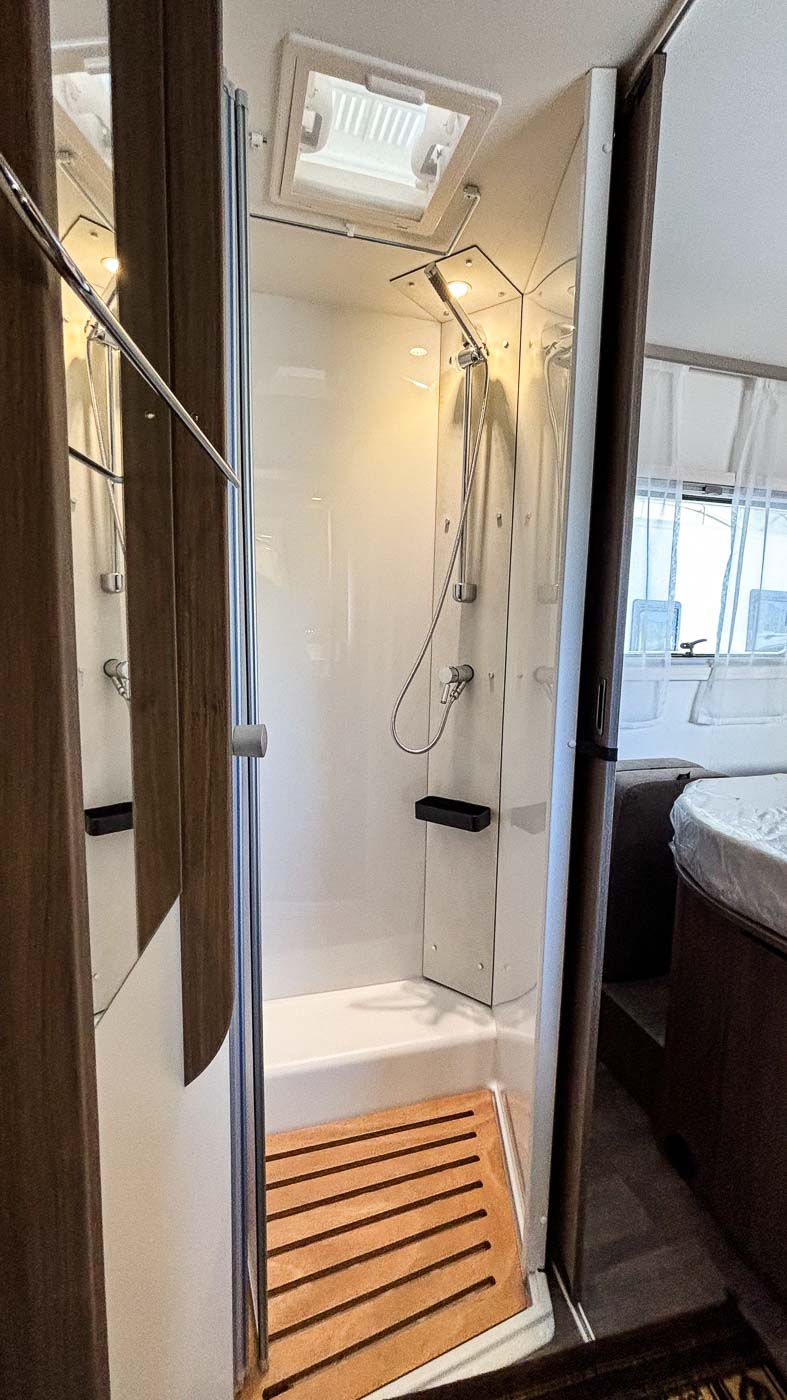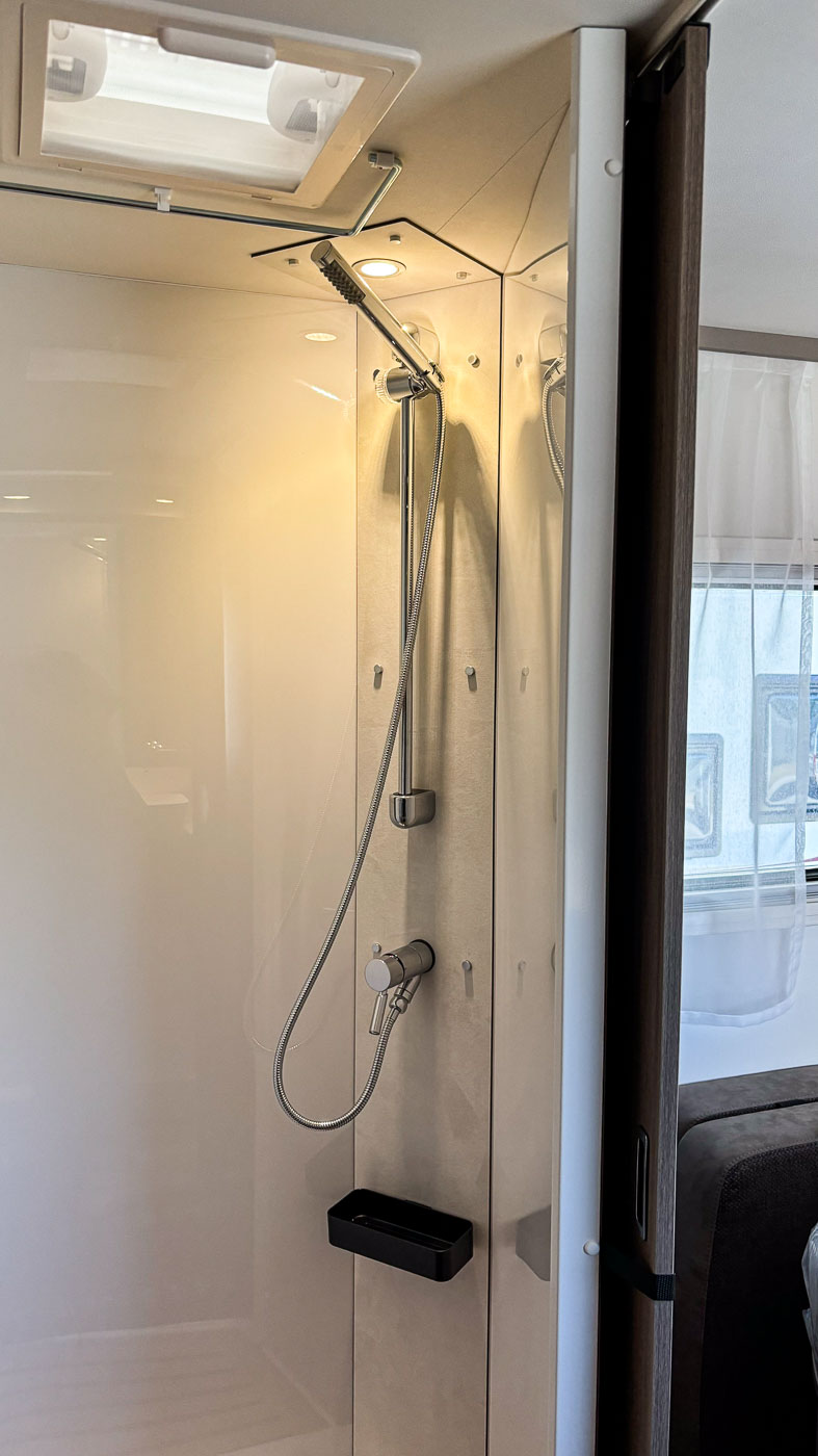 El baño está equipado con W.C, lavamanos y varios espacios de almacenamiento para nuestro equipaje; con cabina de ducha independiente, de grandes dimensiones y cómoda. La puerta del baño permite cerrar la zona trasera del habitáculo para mayor independencia.