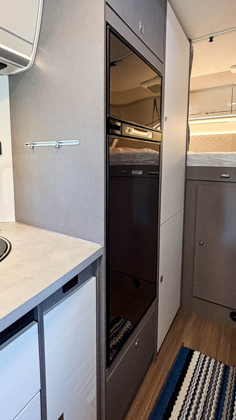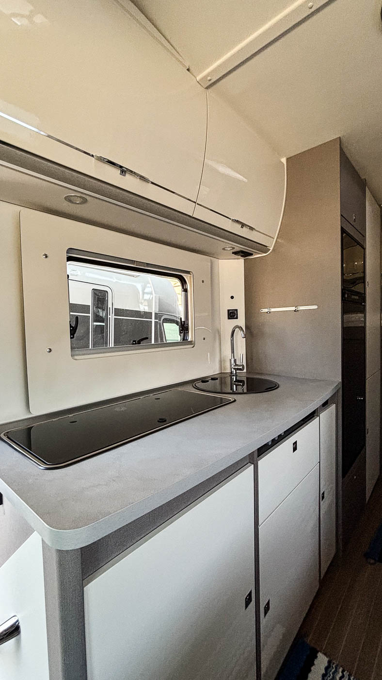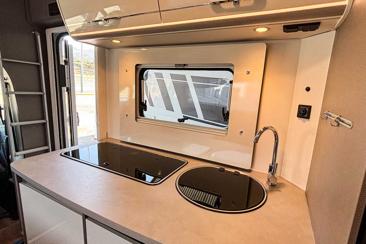 La parte central del vehículo está ocupada por la cocina, equipada con tres fuegos, fregadero y frigorífico grande.