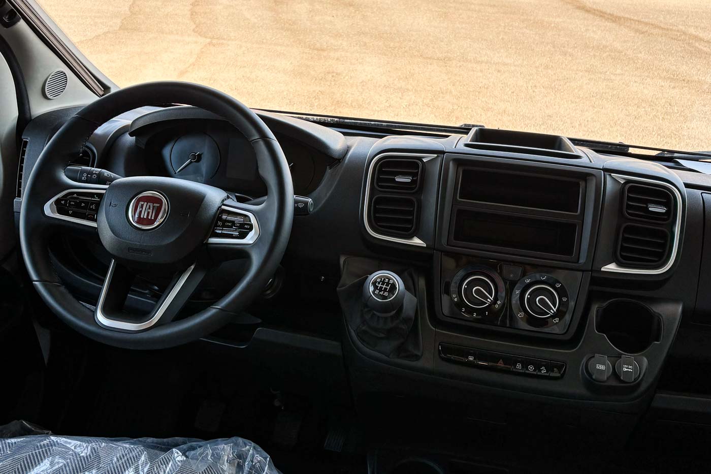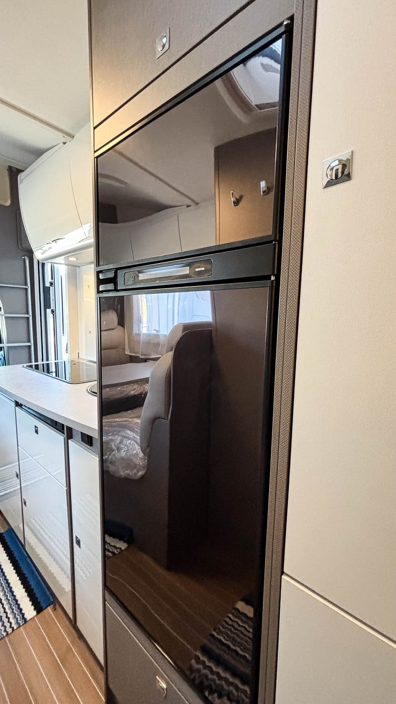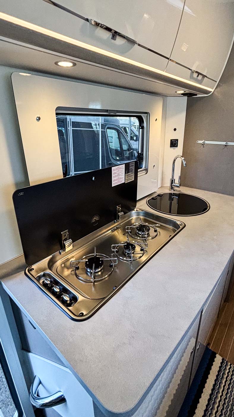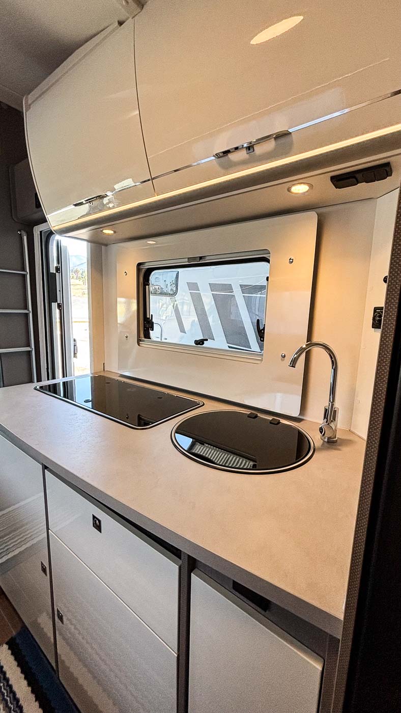 La parte central del vehículo está ocupada por la cocina, equipada con tres fuegos, fregadero y frigorífico grande.