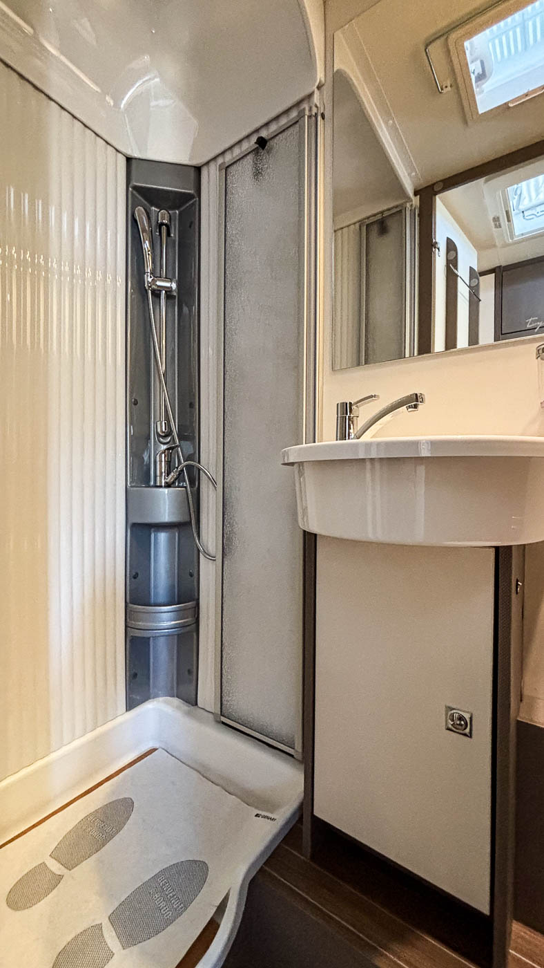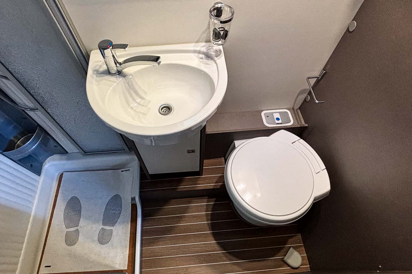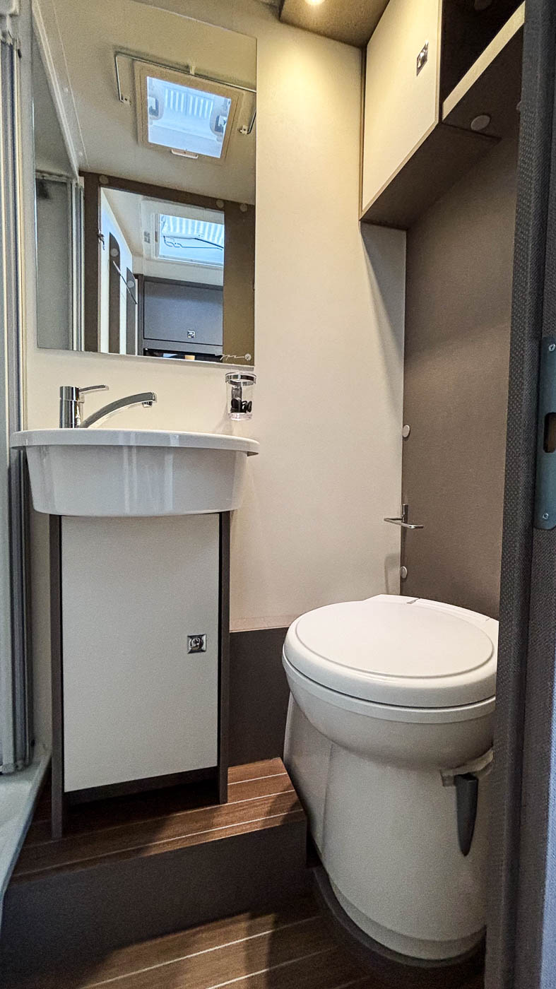 El baño es compacto y funcional, pero equipado con todo lo necesario: lavamanos, W.C. y ducha.