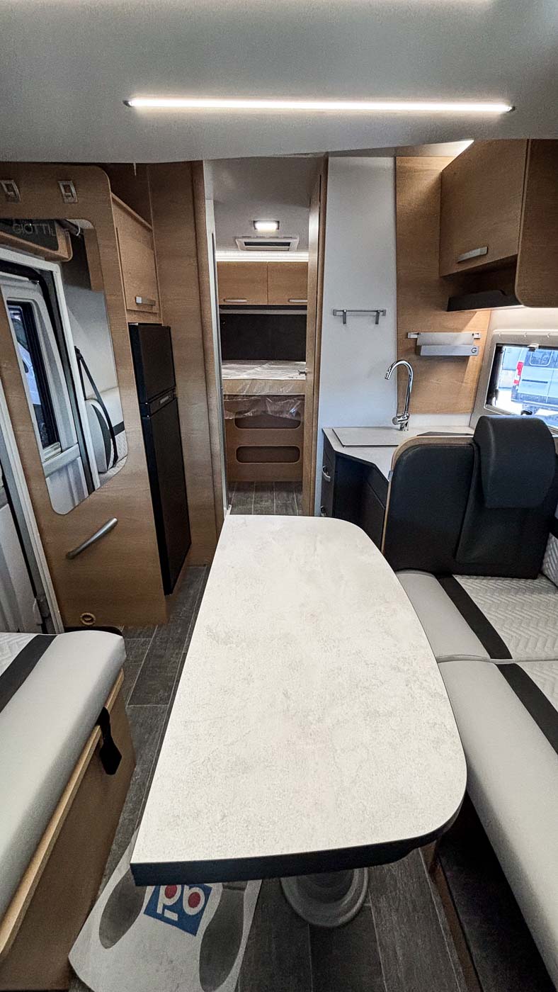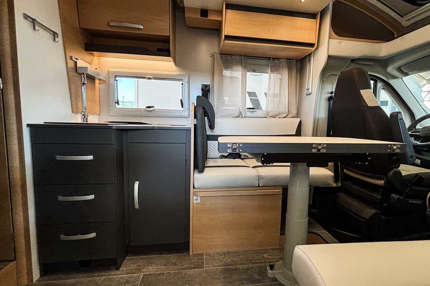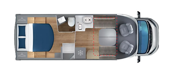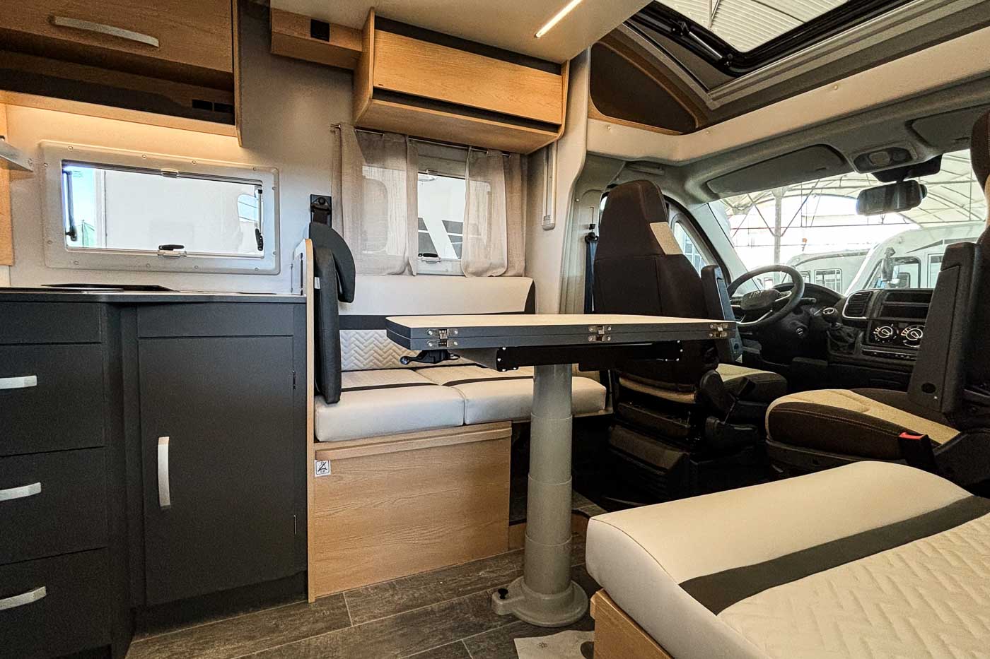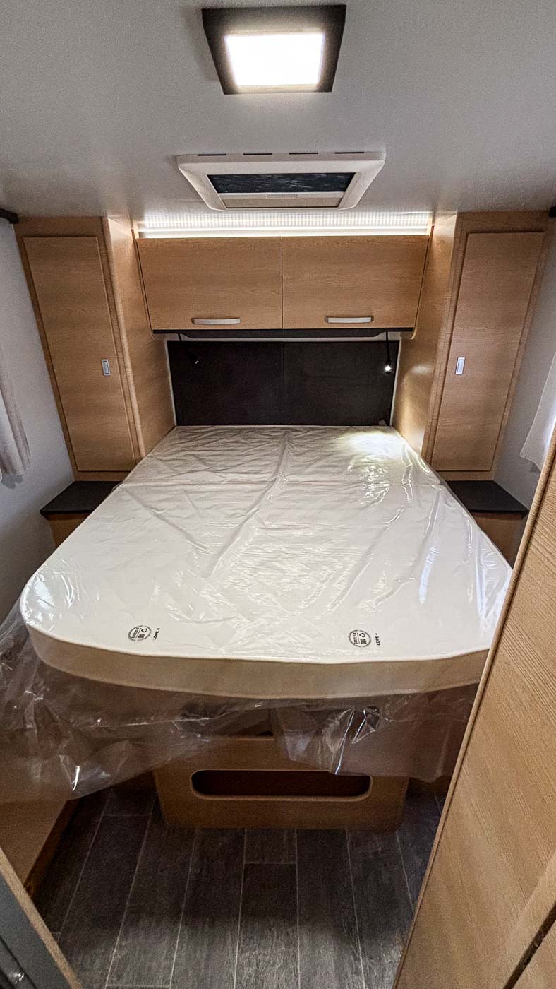 Su distribución se caracteriza por disponer de amplia cama isla en la parte trasera, fácilmente accesible desde ambos laterales. Cuenta con numerosos espacios de almacenamiento tanto en la parte superior como en la parte inferior de la cama.