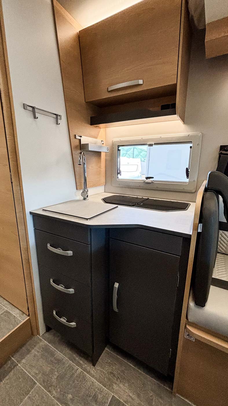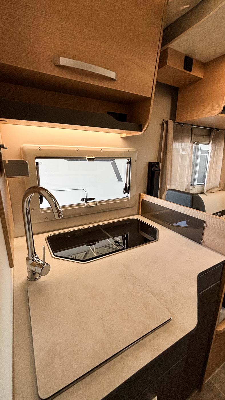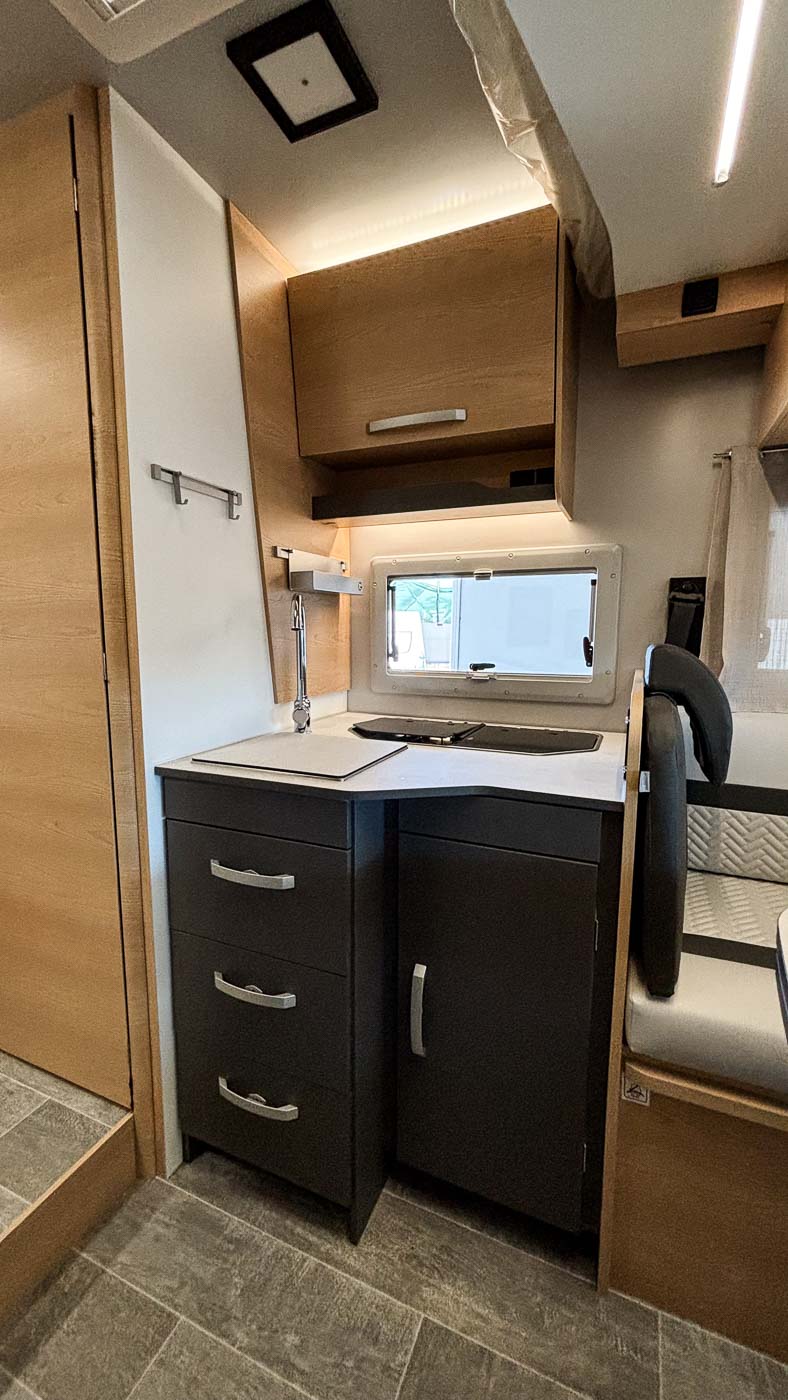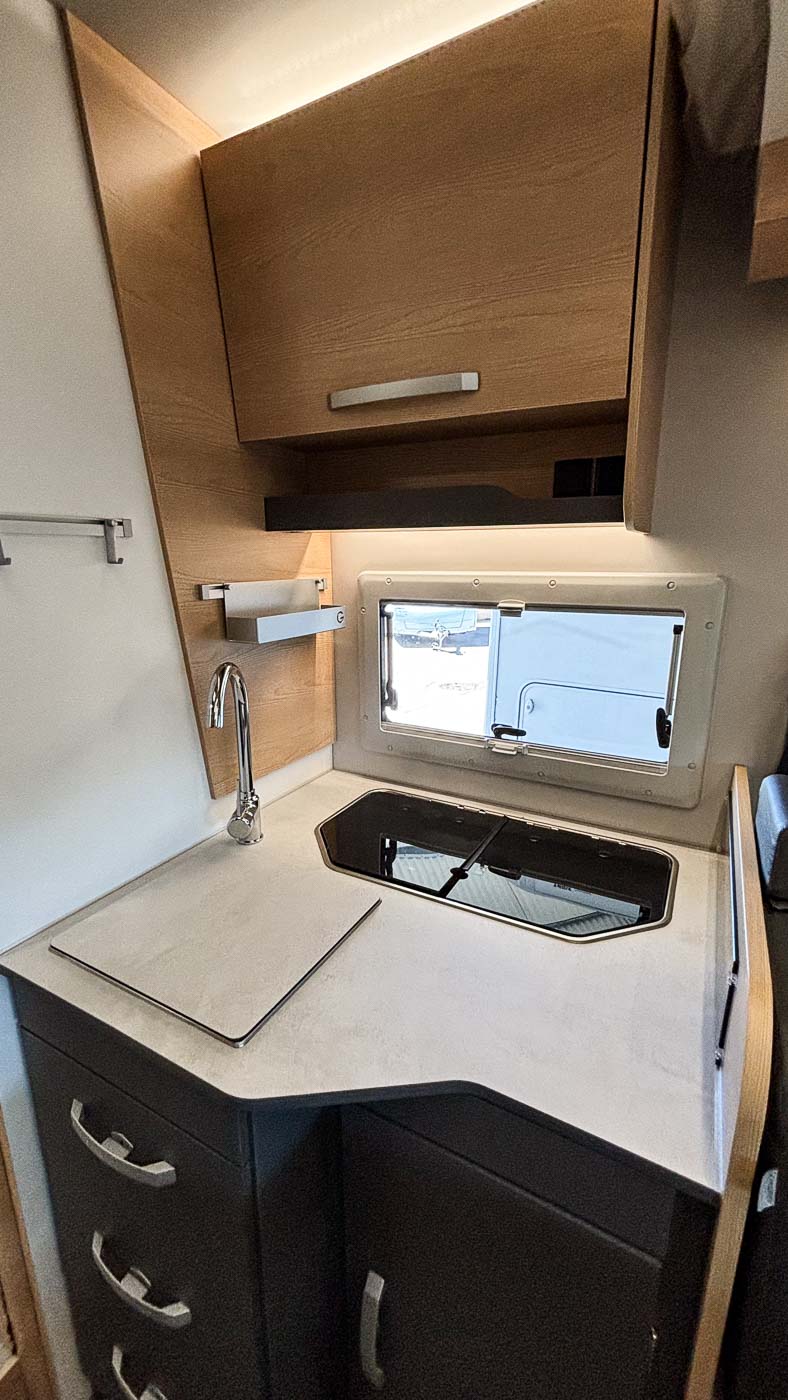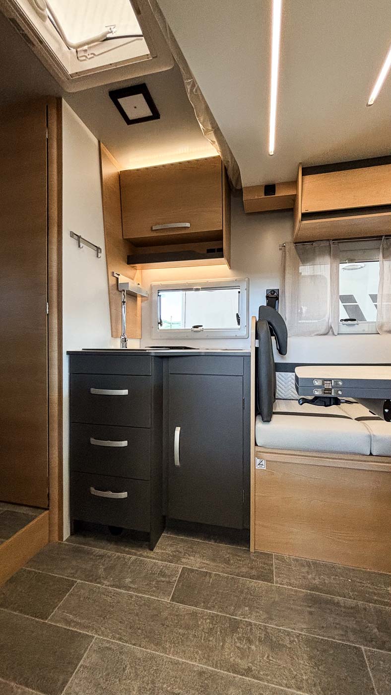 La parte central del vehículo está ocupada por la cocina, equipada con dos fuegos, fregadero y frigorífico grande.