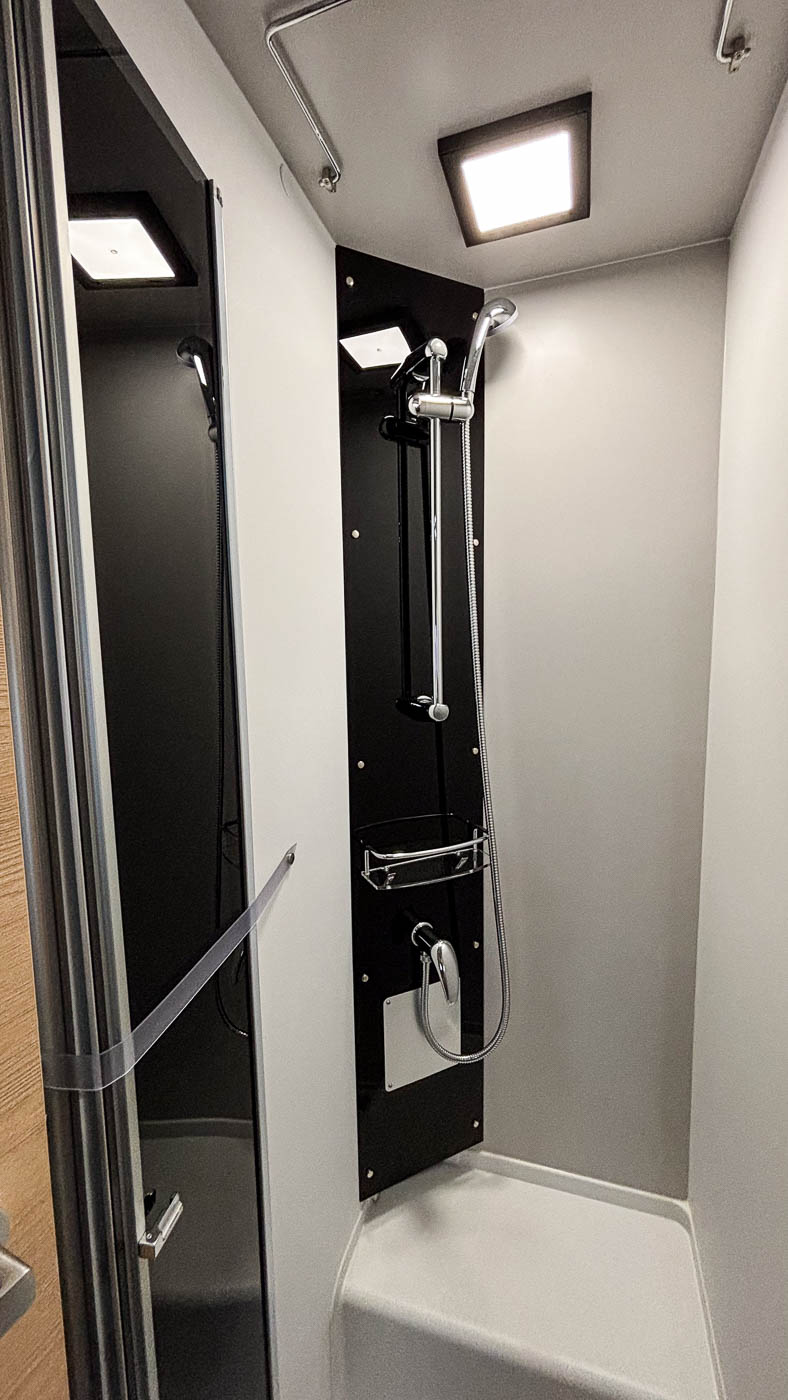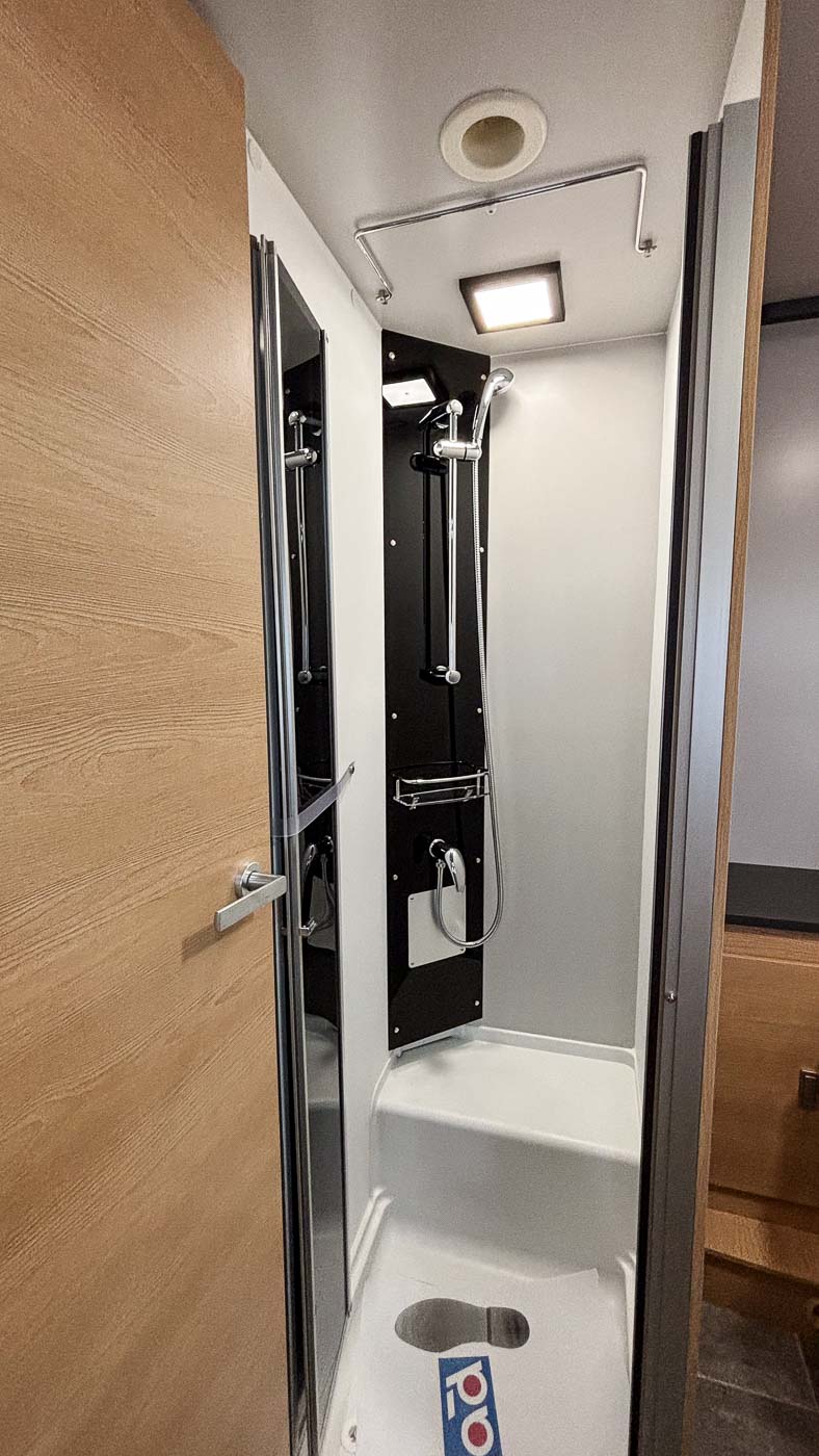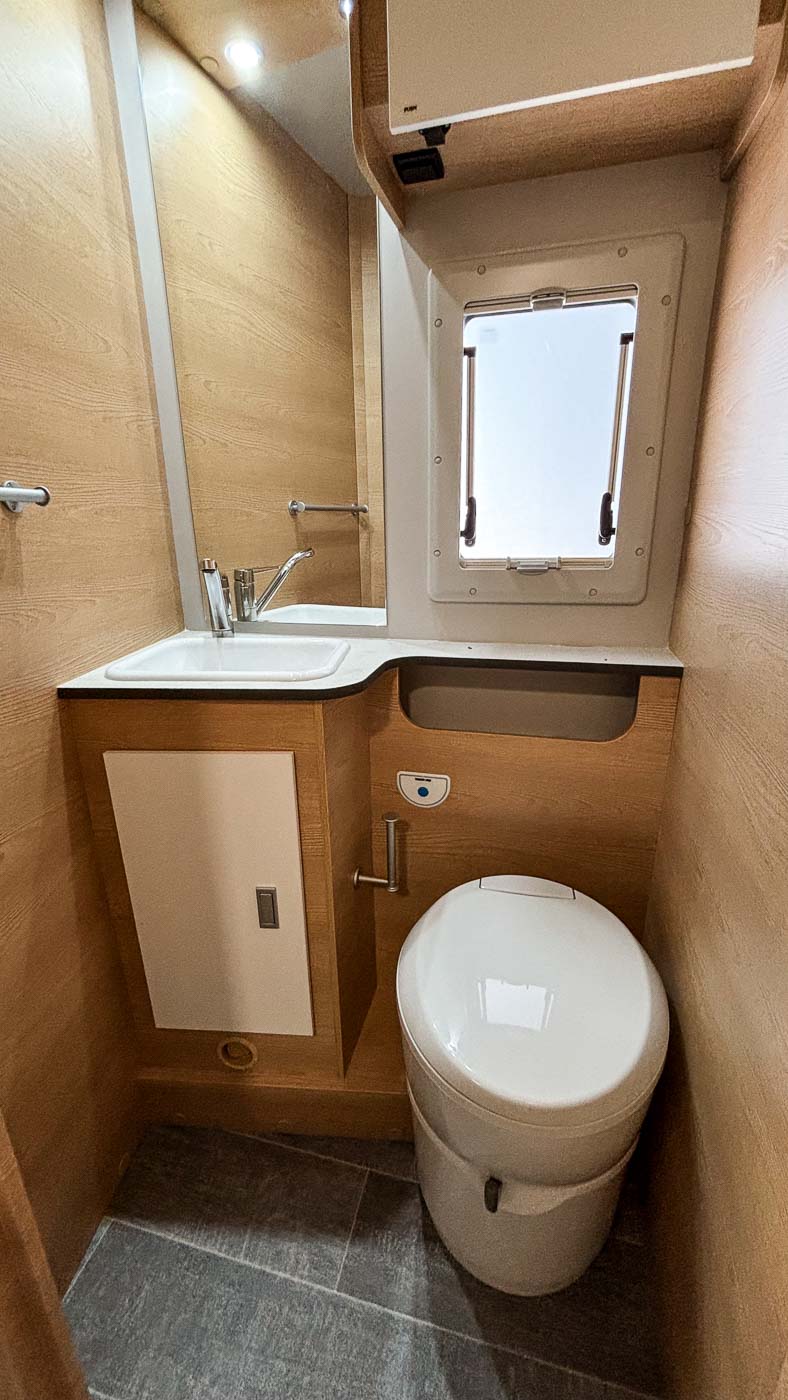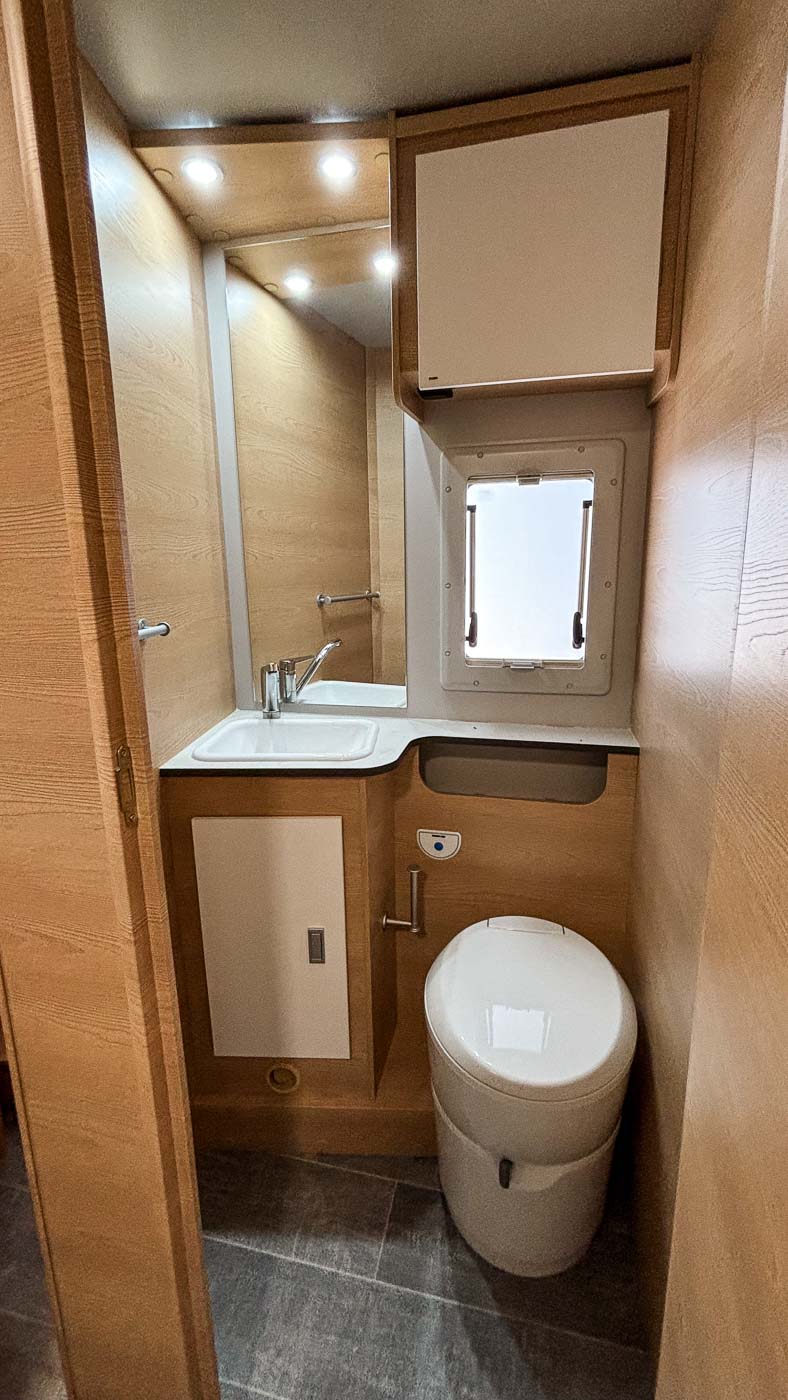 El baño lo encontramos en la zona posterior del vehículo, de grandes dimensiones y equipado con todo lo necesario: W.C., lavamanos y espaciosa zona de organización para menaje. Cuenta con cabina de ducha independiente del baño.