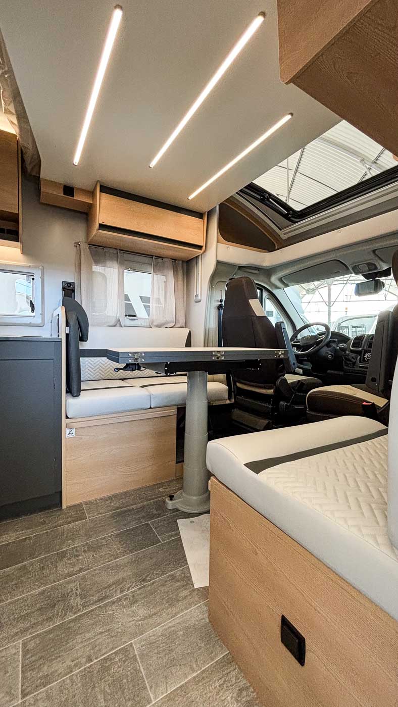 Cuenta con gran salón “face to face”, en el que compartir los mejores momentos. Dispone de mesa central plegable, dos sofás enfrentados así como los asientos giratorios de la cabina. Sobre esta zona se encuentra otra cama doble fácilmente abatible desde el techo.