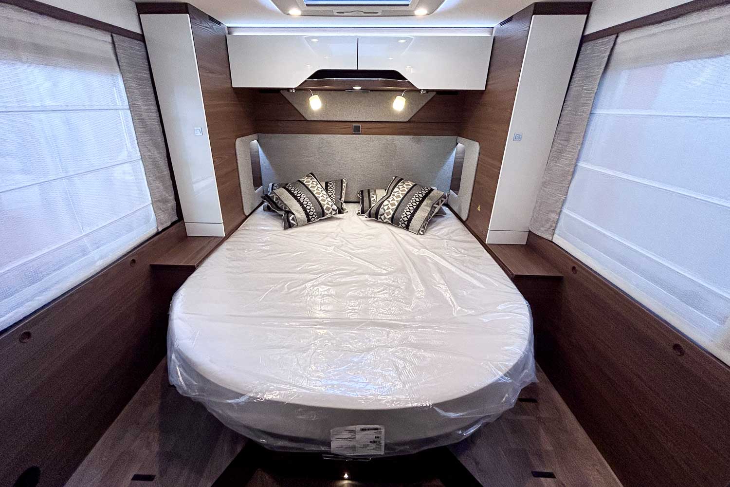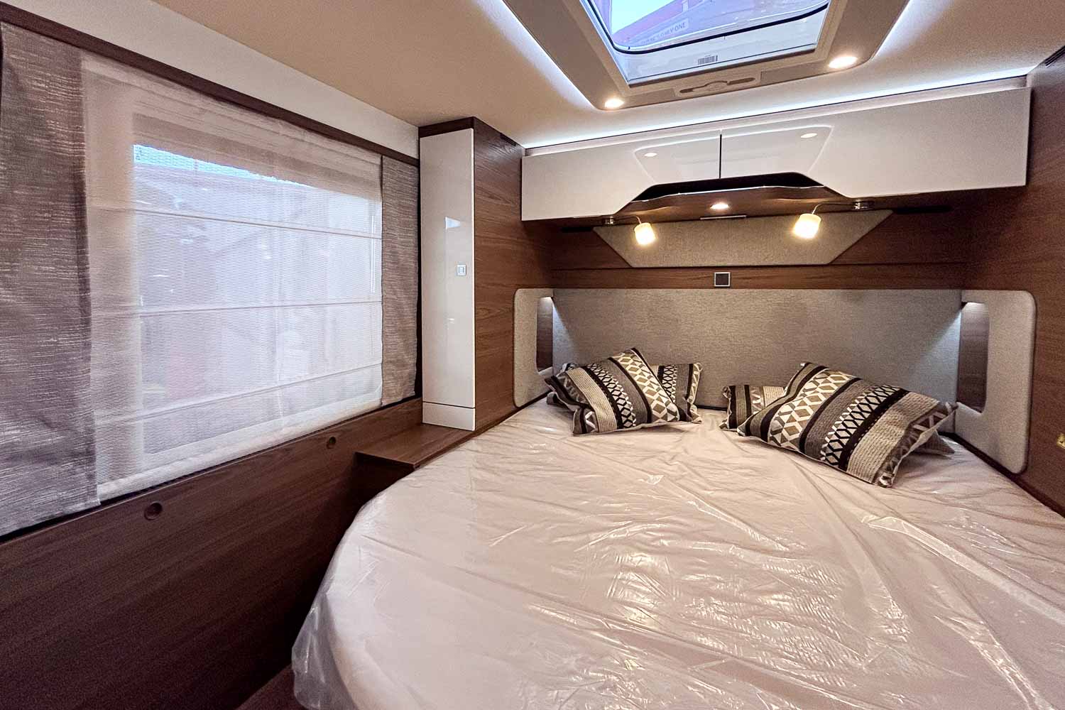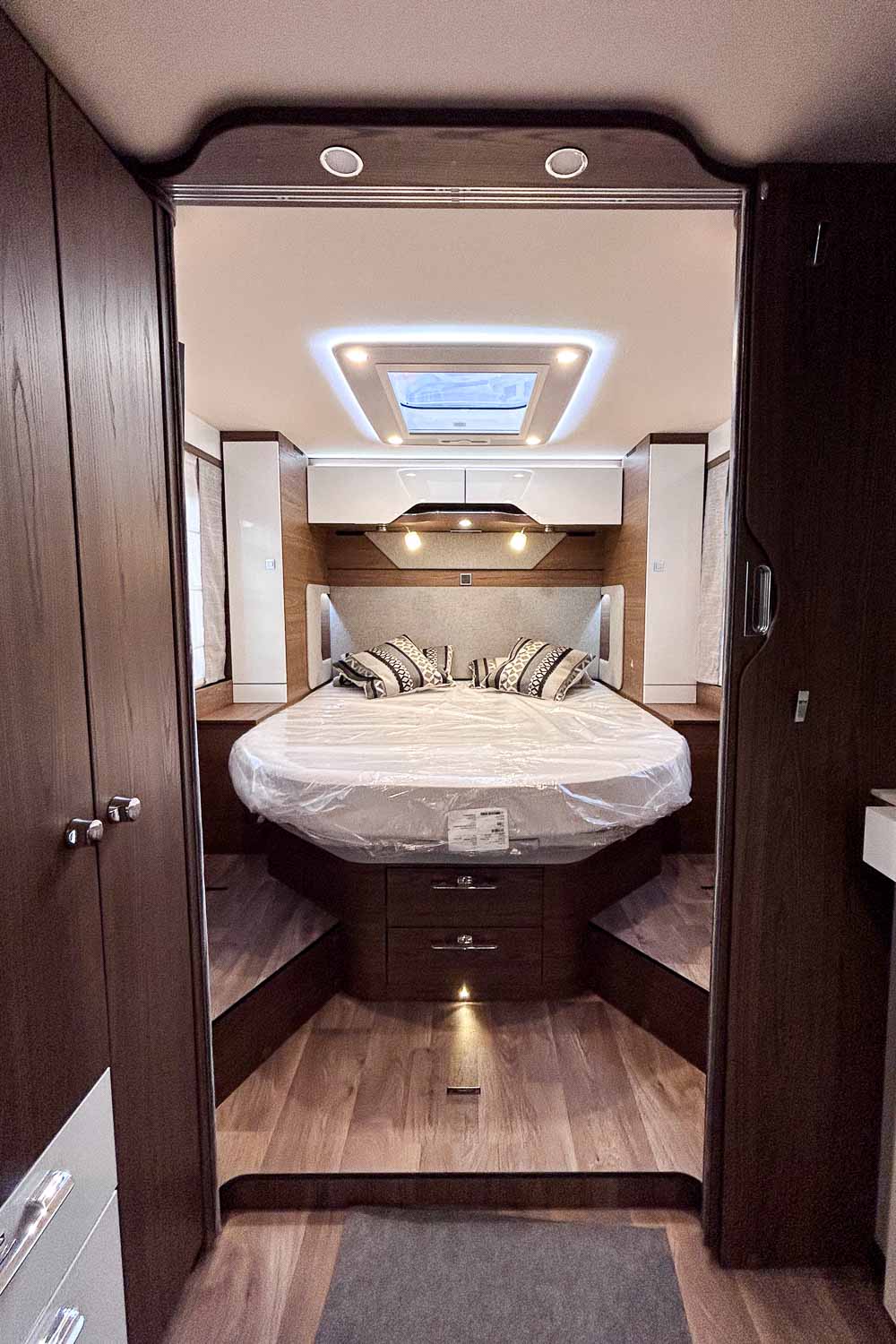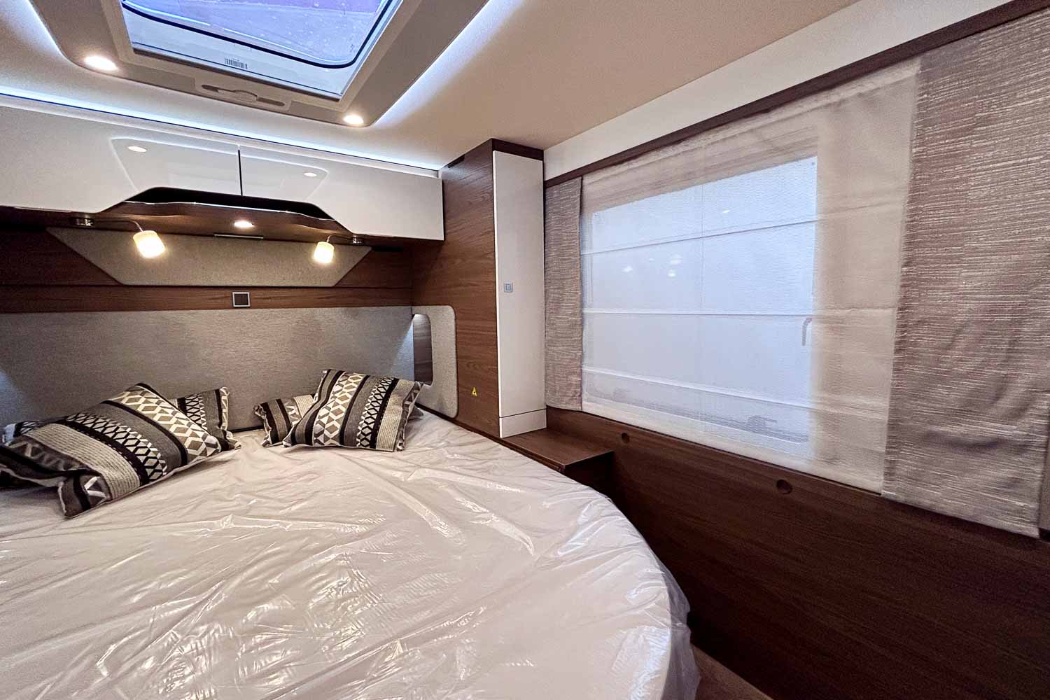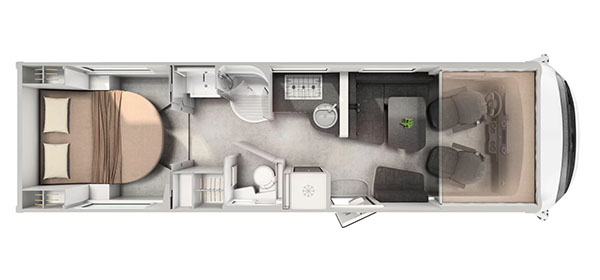 Esta Hymer B ML I 890 es una autocaravana integral para cuatro personas durante la marcha y dos plazas para dormir. Dispone de amplia cama isla en la parte trasera, fácilmente accesible desde ambos laterales, con numerosos espacios de almacenamiento para organizar nuestro equipaje, tanto en la parte superior como en la parte inferior de la cama.