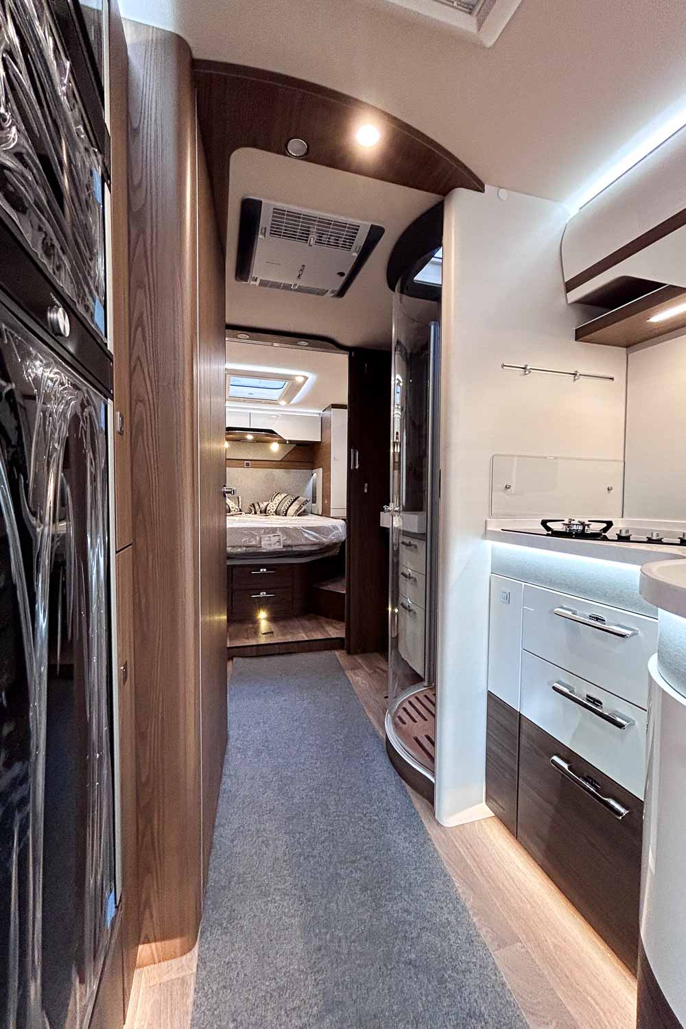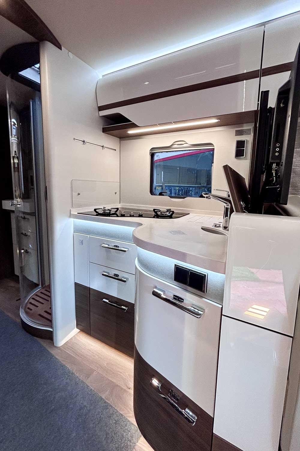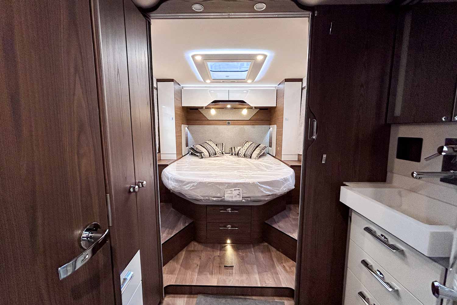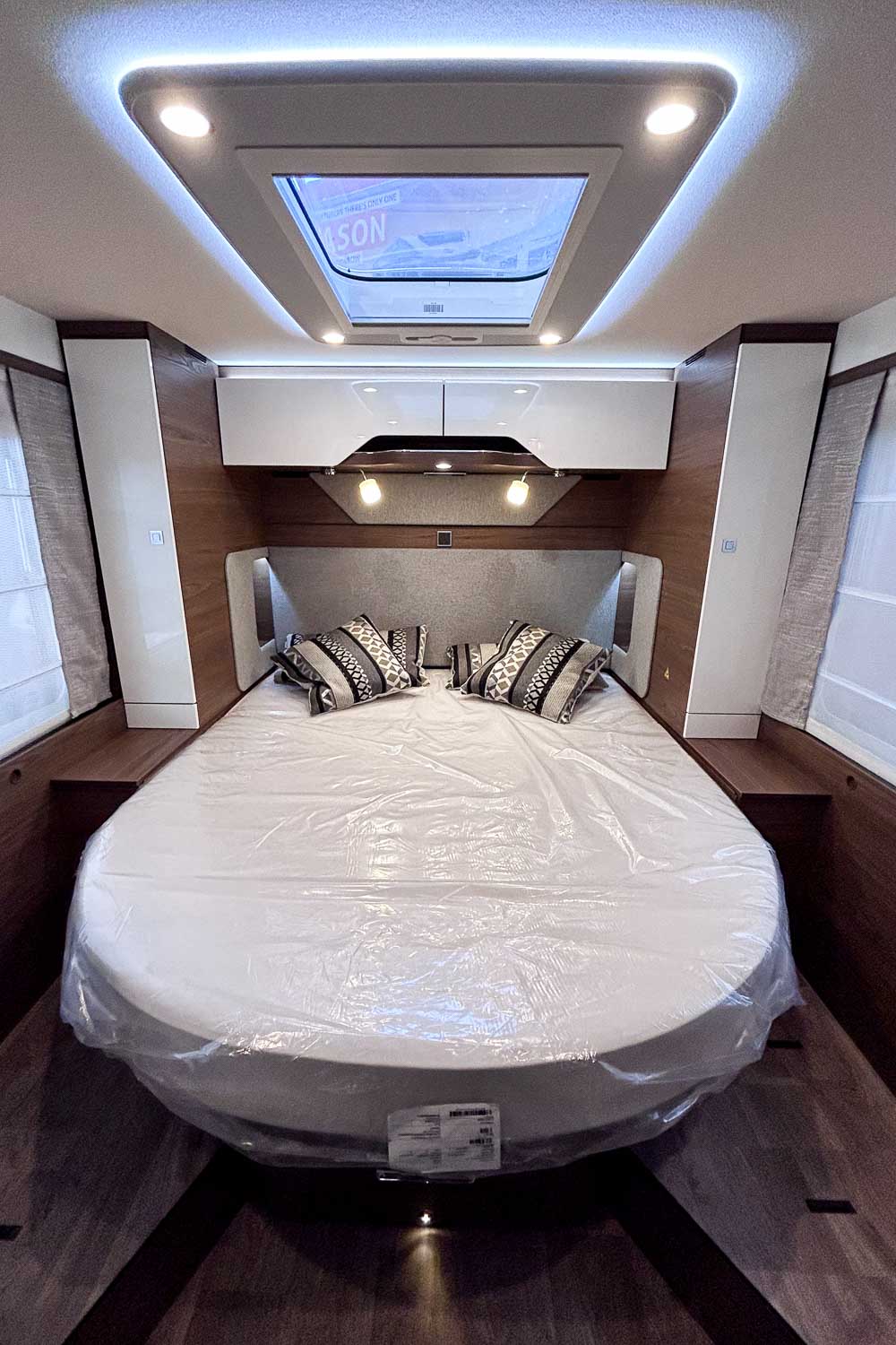 Esta Hymer B ML I 890 es una autocaravana integral para cuatro personas durante la marcha y dos plazas para dormir. Dispone de amplia cama isla en la parte trasera, fácilmente accesible desde ambos laterales, con numerosos espacios de almacenamiento para organizar nuestro equipaje, tanto en la parte superior como en la parte inferior de la cama.