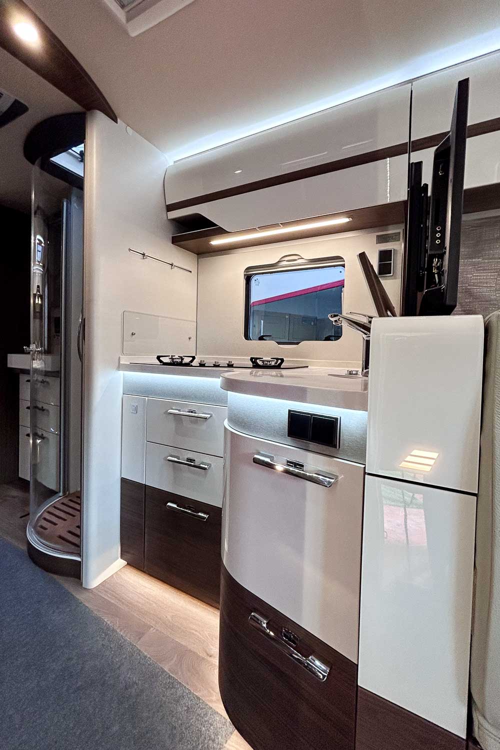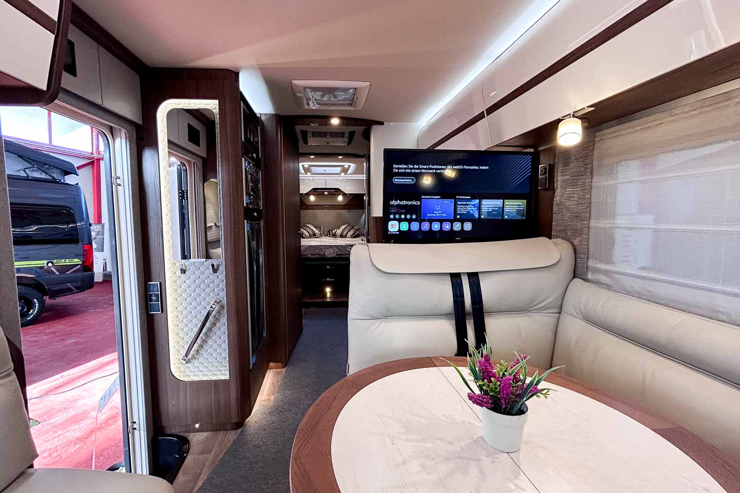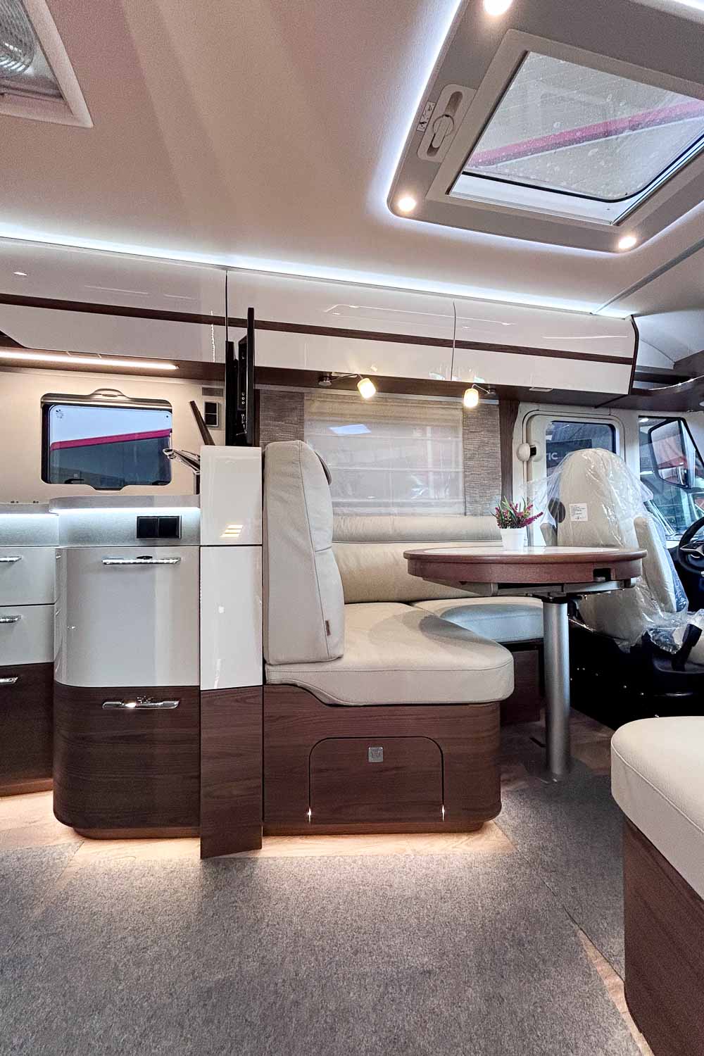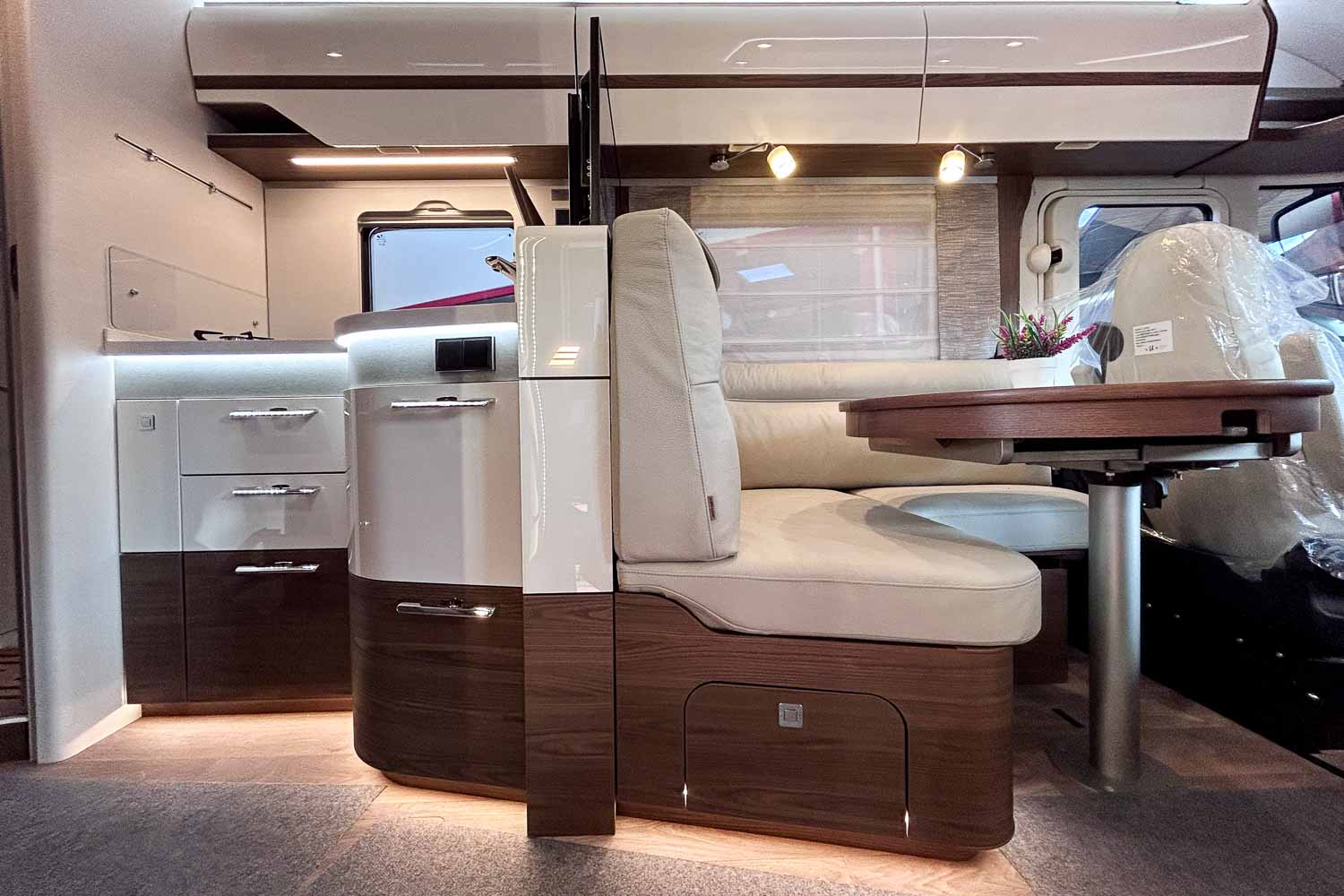 Esta Hymer B ML I 890 es una autocaravana integral para cuatro personas durante la marcha y dos plazas para dormir. Dispone de amplia cama isla en la parte trasera, fácilmente accesible desde ambos laterales, con numerosos espacios de almacenamiento para organizar nuestro equipaje, tanto en la parte superior como en la parte inferior de la cama.