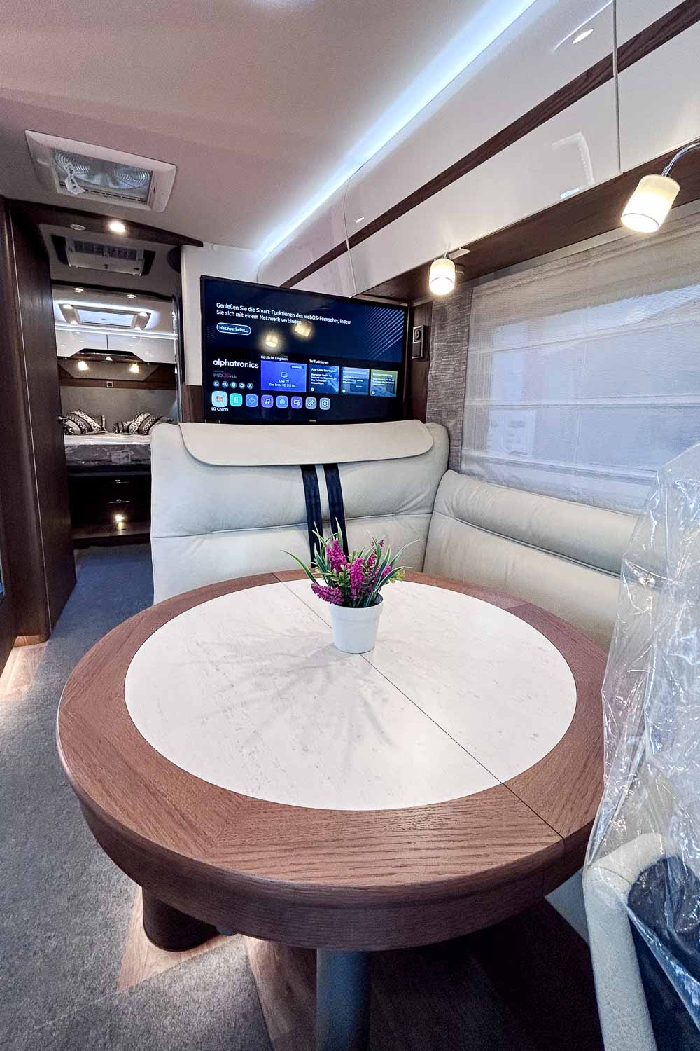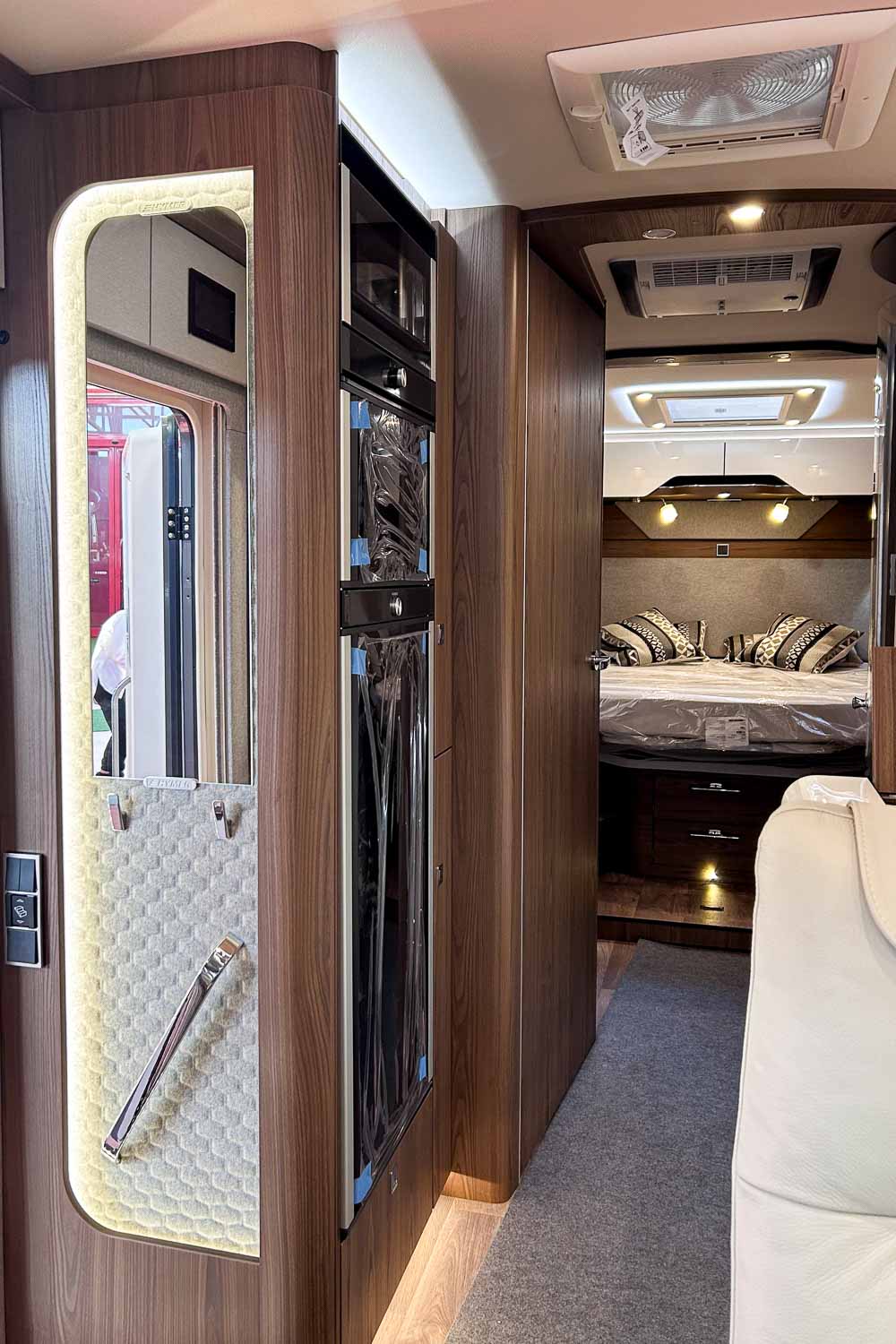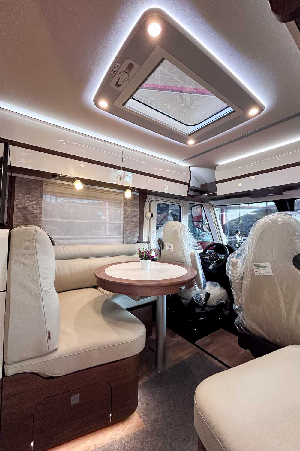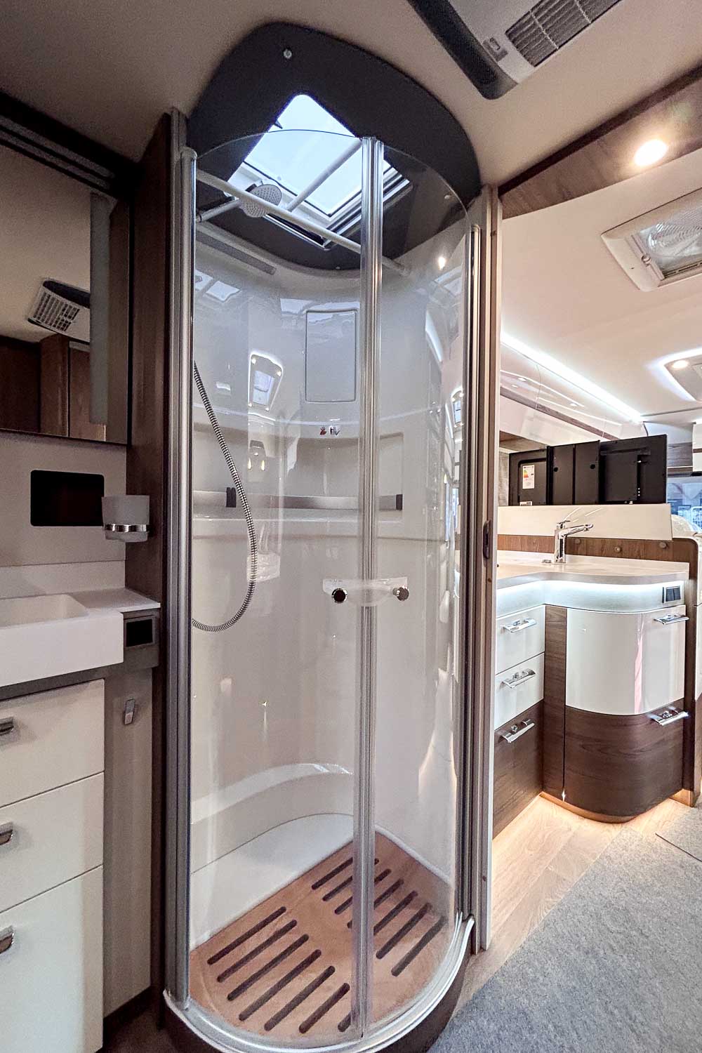 Esta Hymer B ML I 890 es una autocaravana integral para cuatro personas durante la marcha y dos plazas para dormir. Dispone de amplia cama isla en la parte trasera, fácilmente accesible desde ambos laterales, con numerosos espacios de almacenamiento para organizar nuestro equipaje, tanto en la parte superior como en la parte inferior de la cama.