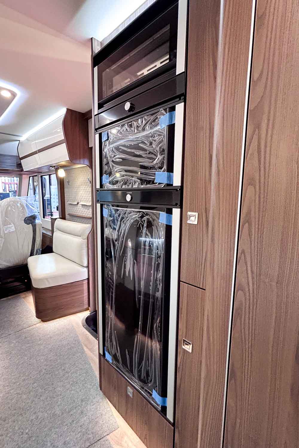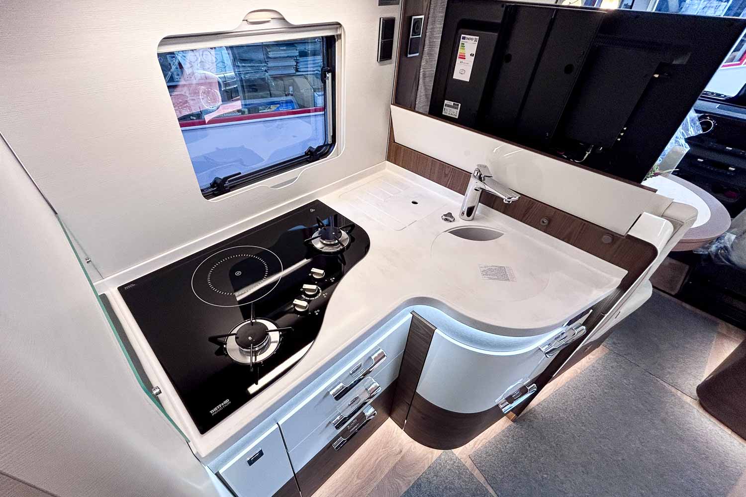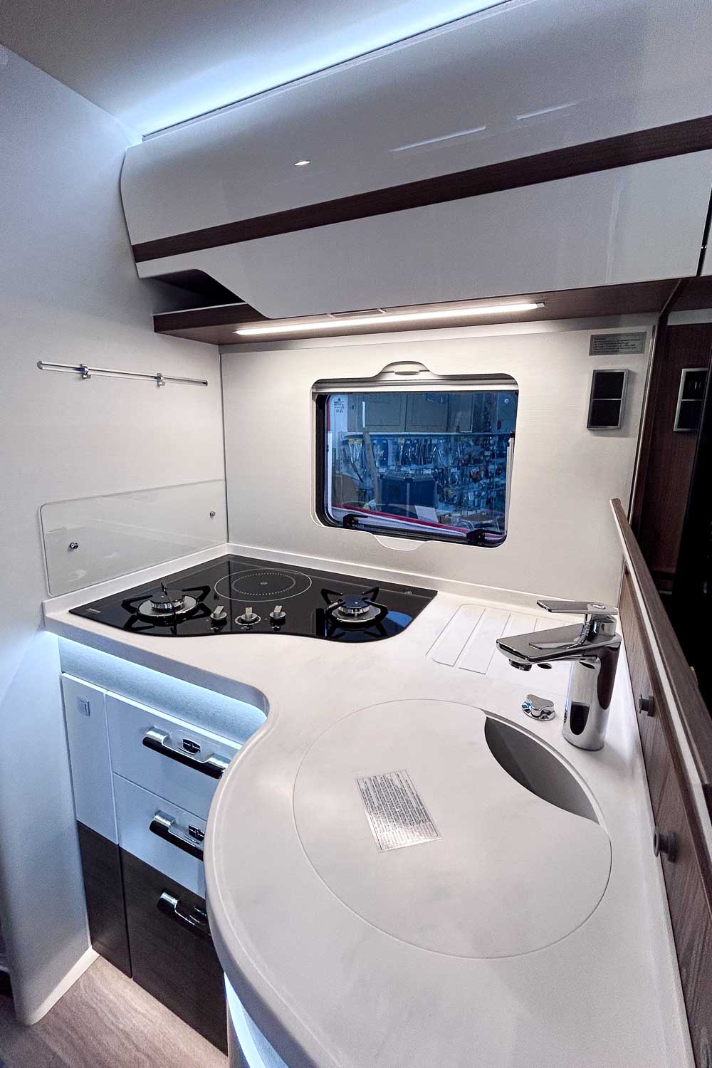 La parte central del vehículo está ocupada por la cocina equipada con dos fuegos, fregadero, frigorífico grande, descongelador independiente y horno. Dispone de numerosos espacios de almacenamiento para alimentación y menaje.