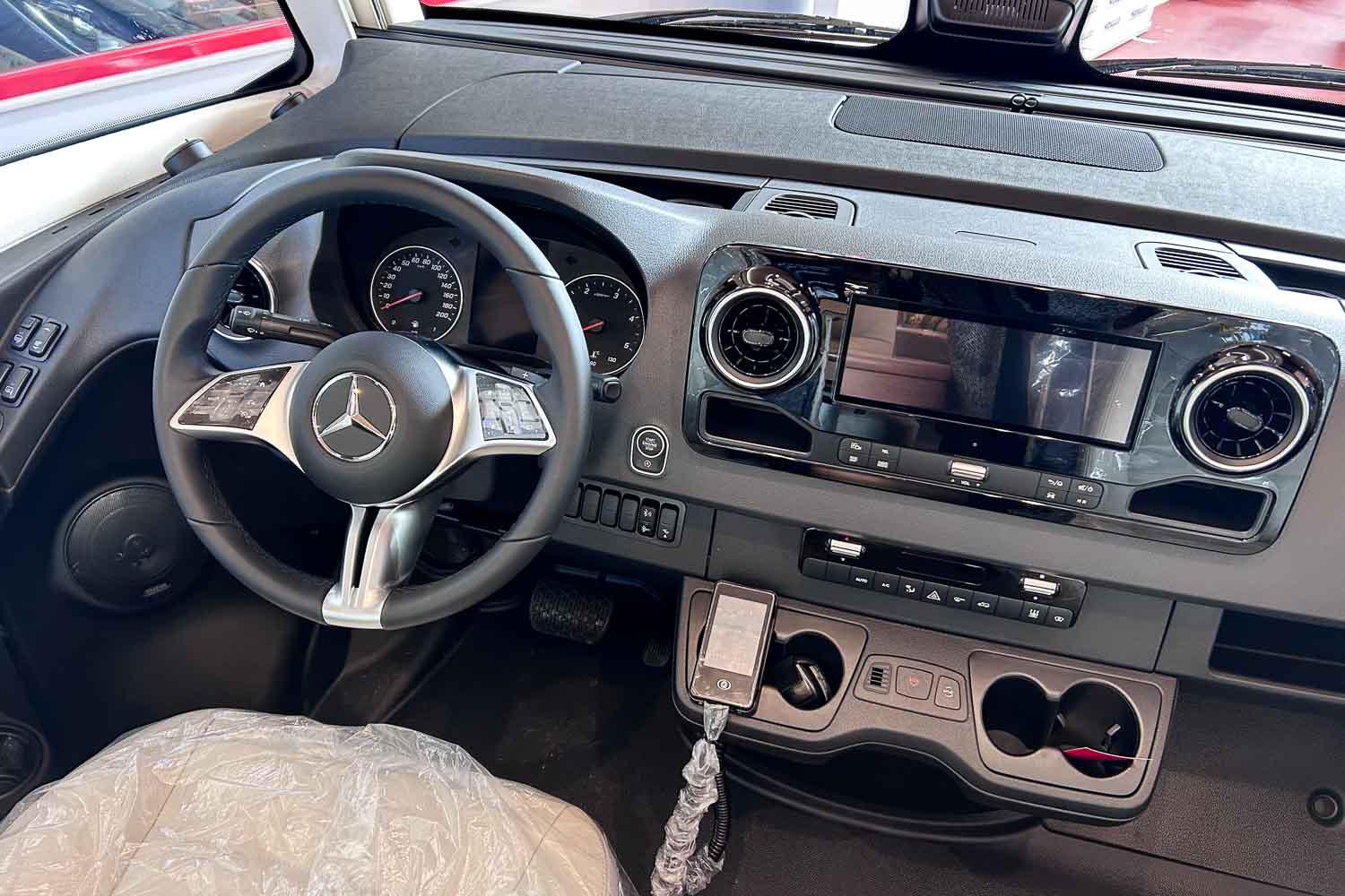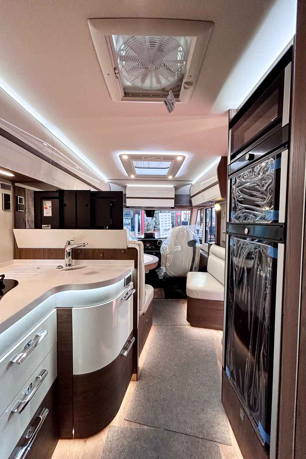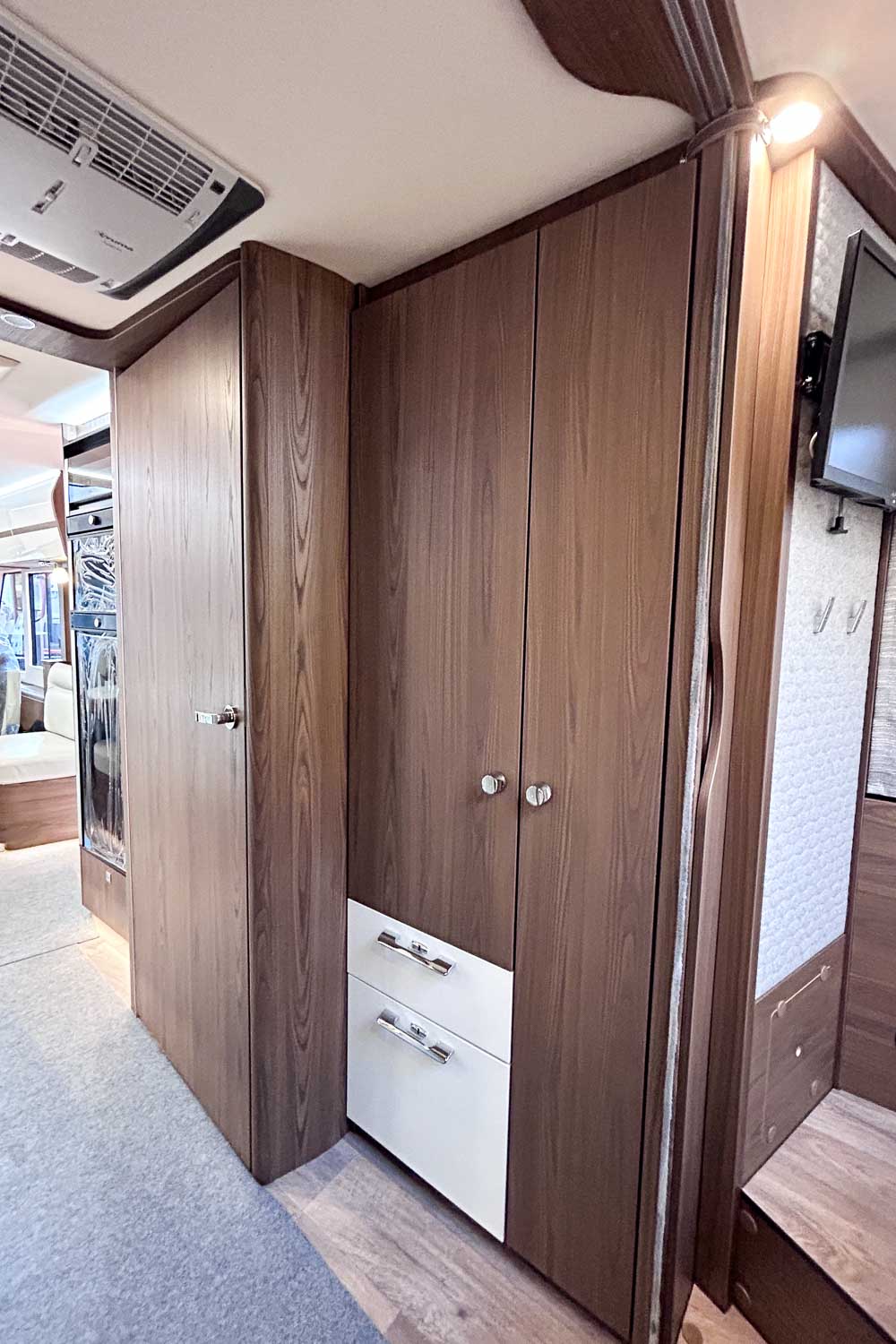 La parte central del vehículo está ocupada por la cocina equipada con dos fuegos, fregadero, frigorífico grande, descongelador independiente y horno. Dispone de numerosos espacios de almacenamiento para alimentación y menaje.