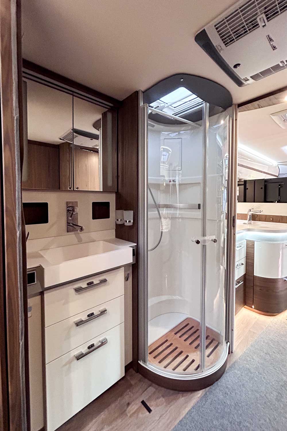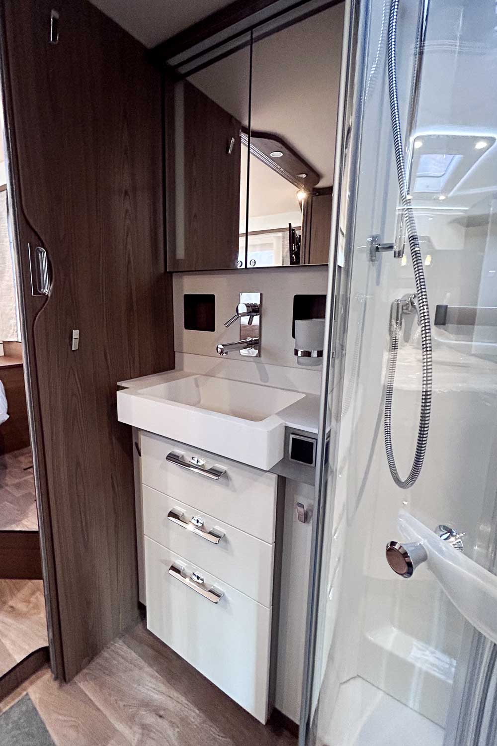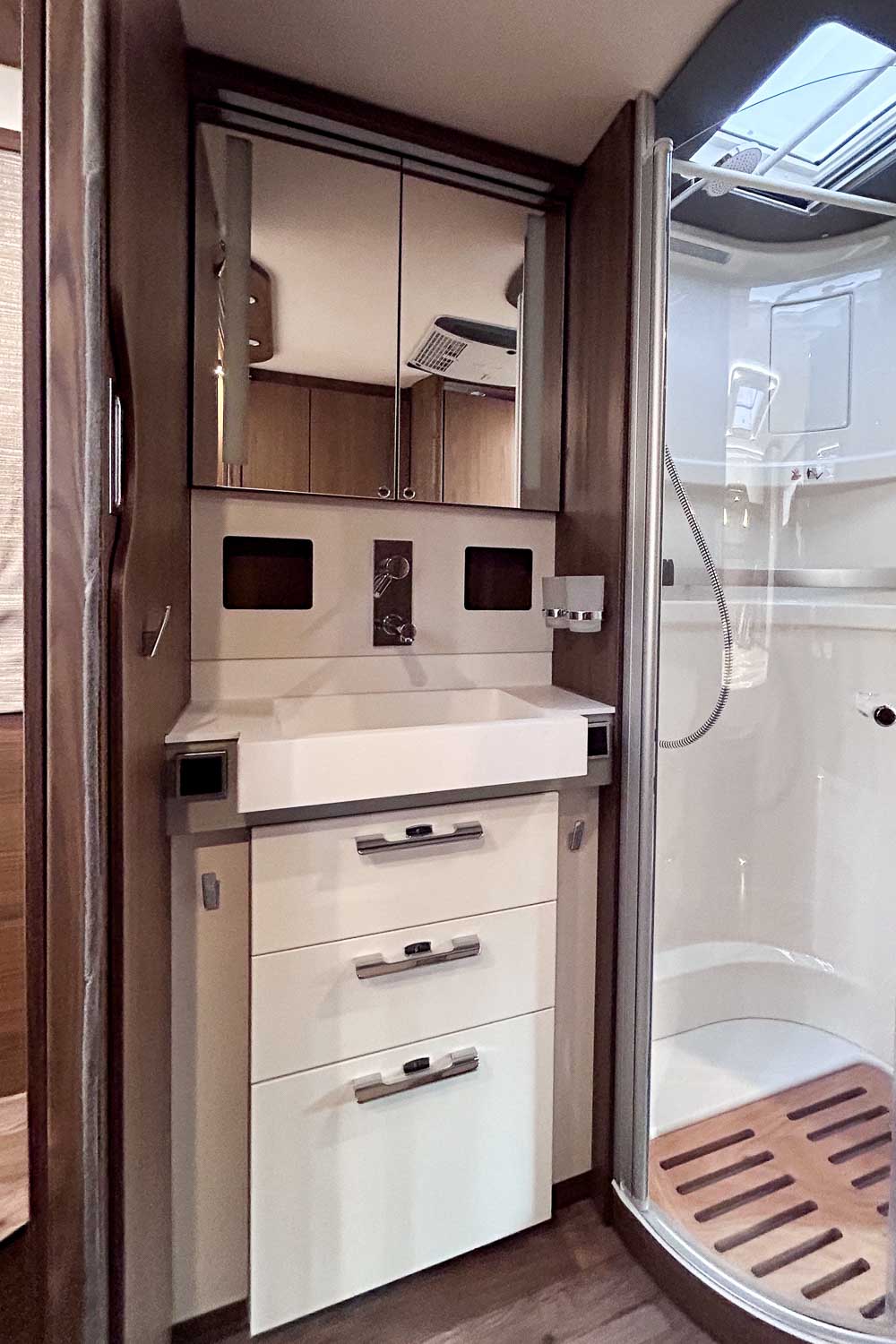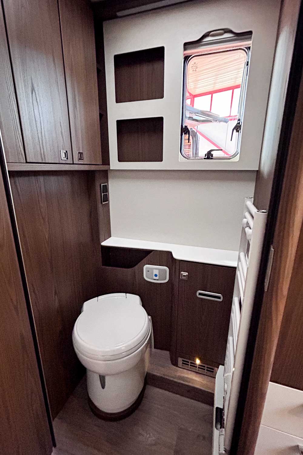 Dispone de amplia zona de baño, equipado con W.C independiente y cabina de ducha, además del lavamanos así como numerosos espacios de almacenamiento.