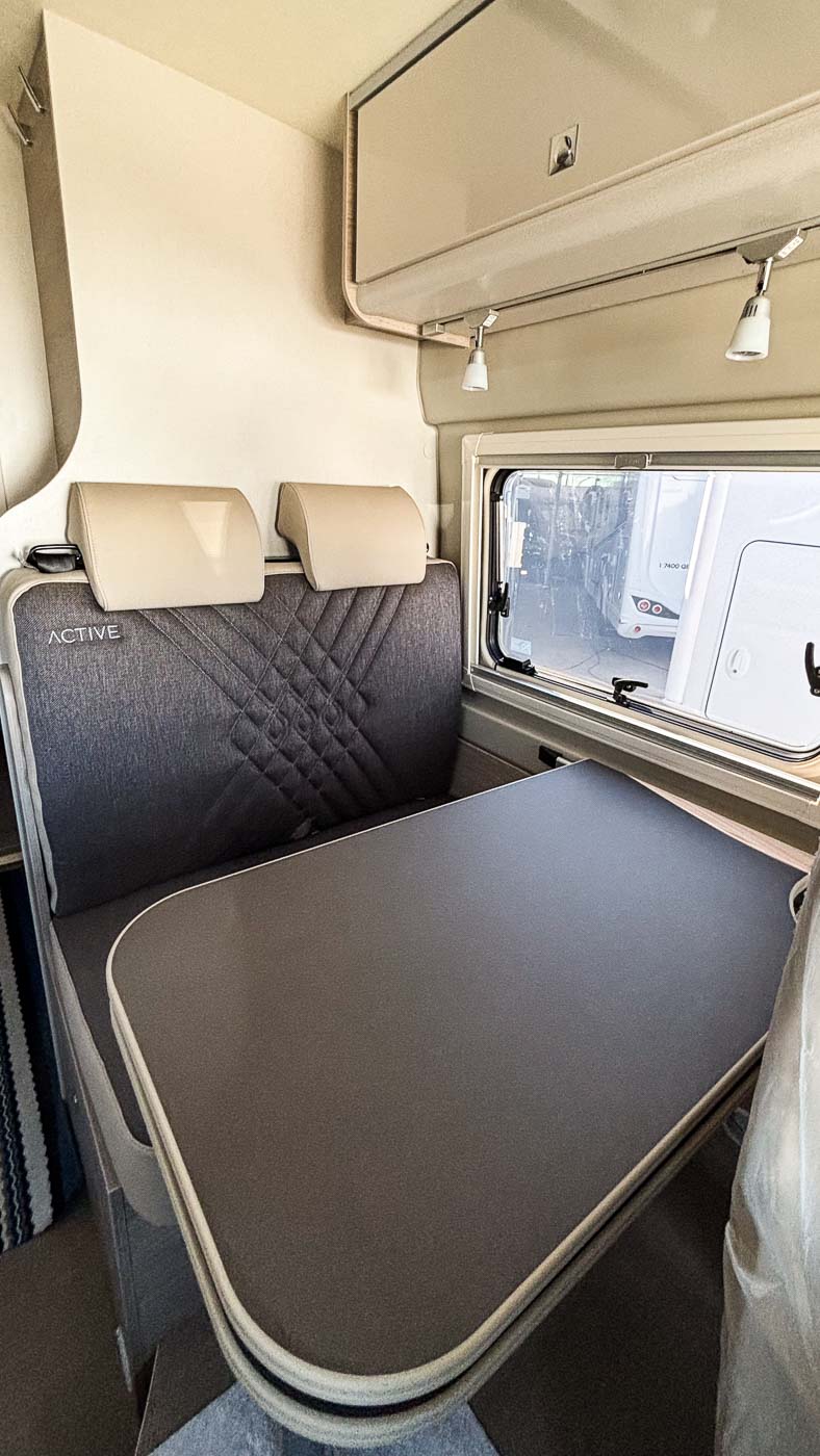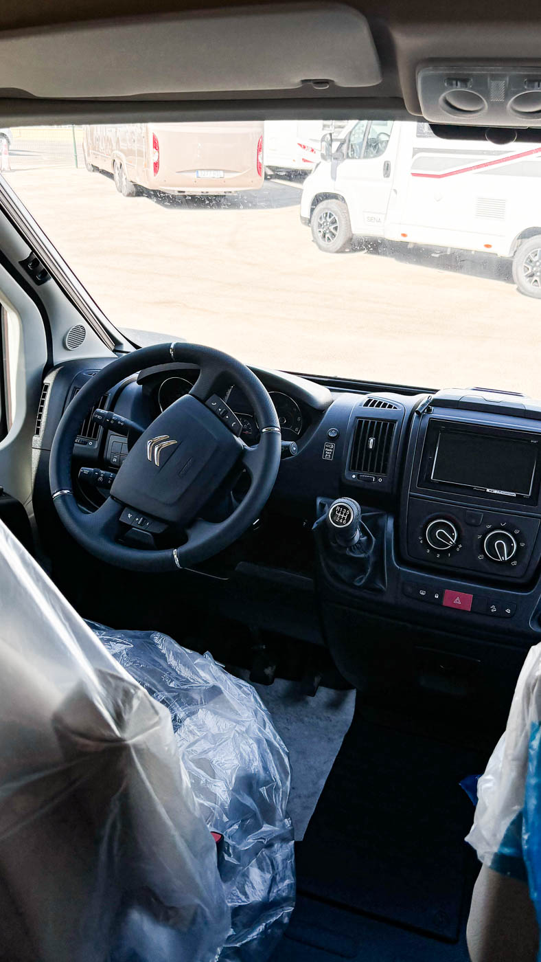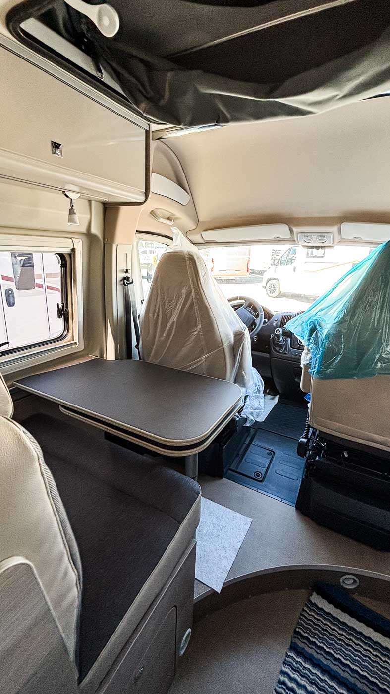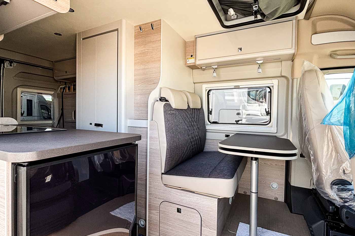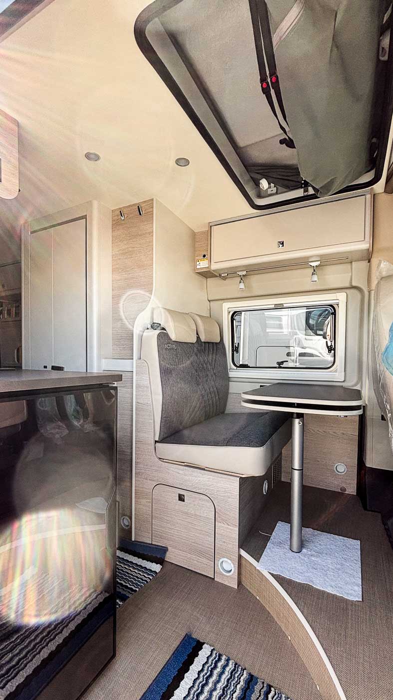 En la parte central del vehículo encontramos un pequeño salón cómodo gracias a la mesa extensible de la que dispone y los asientos giratorios de la cabina.