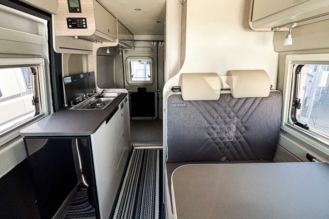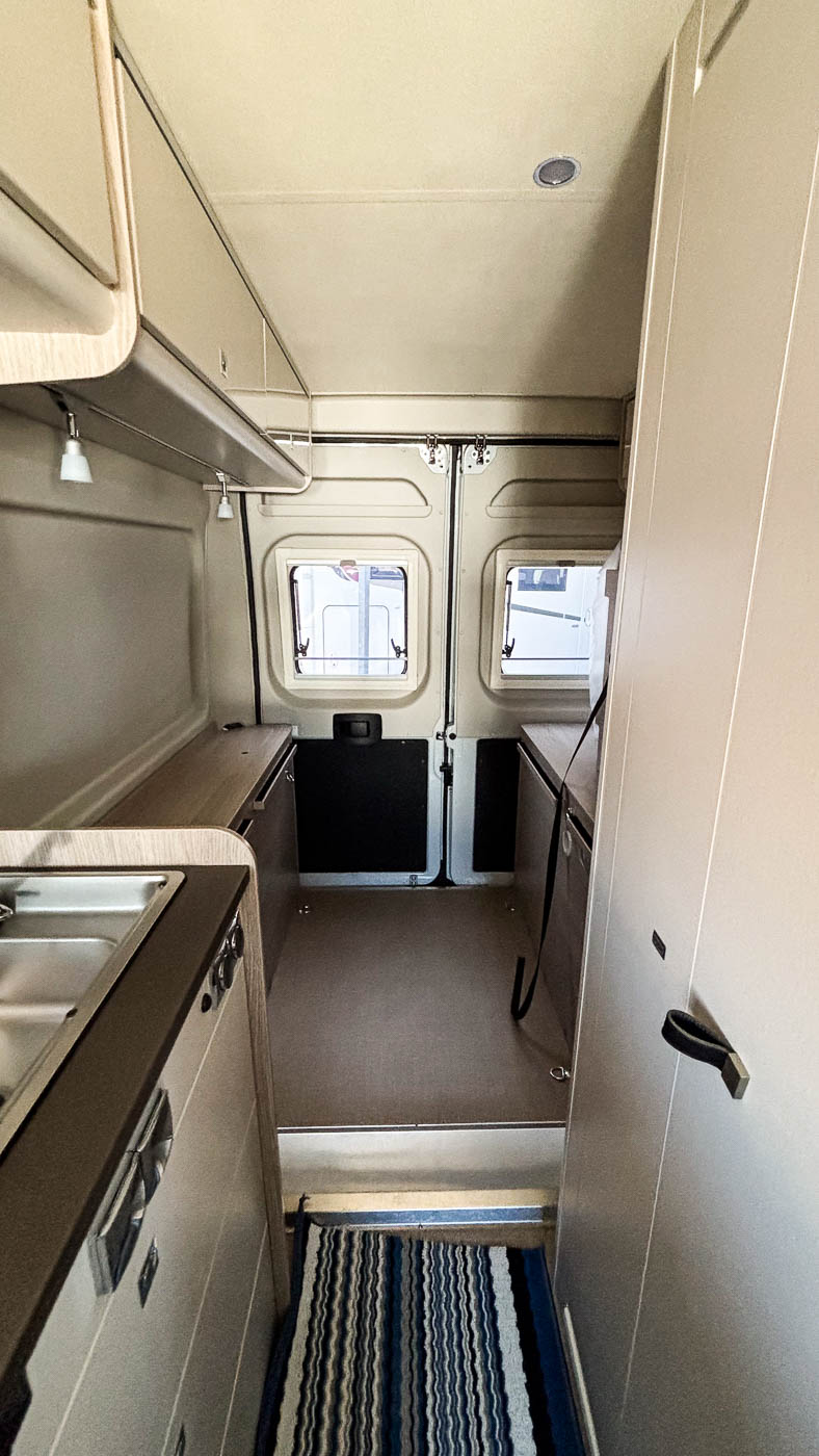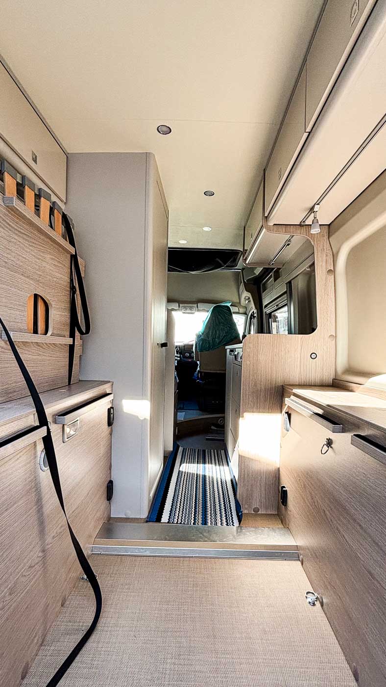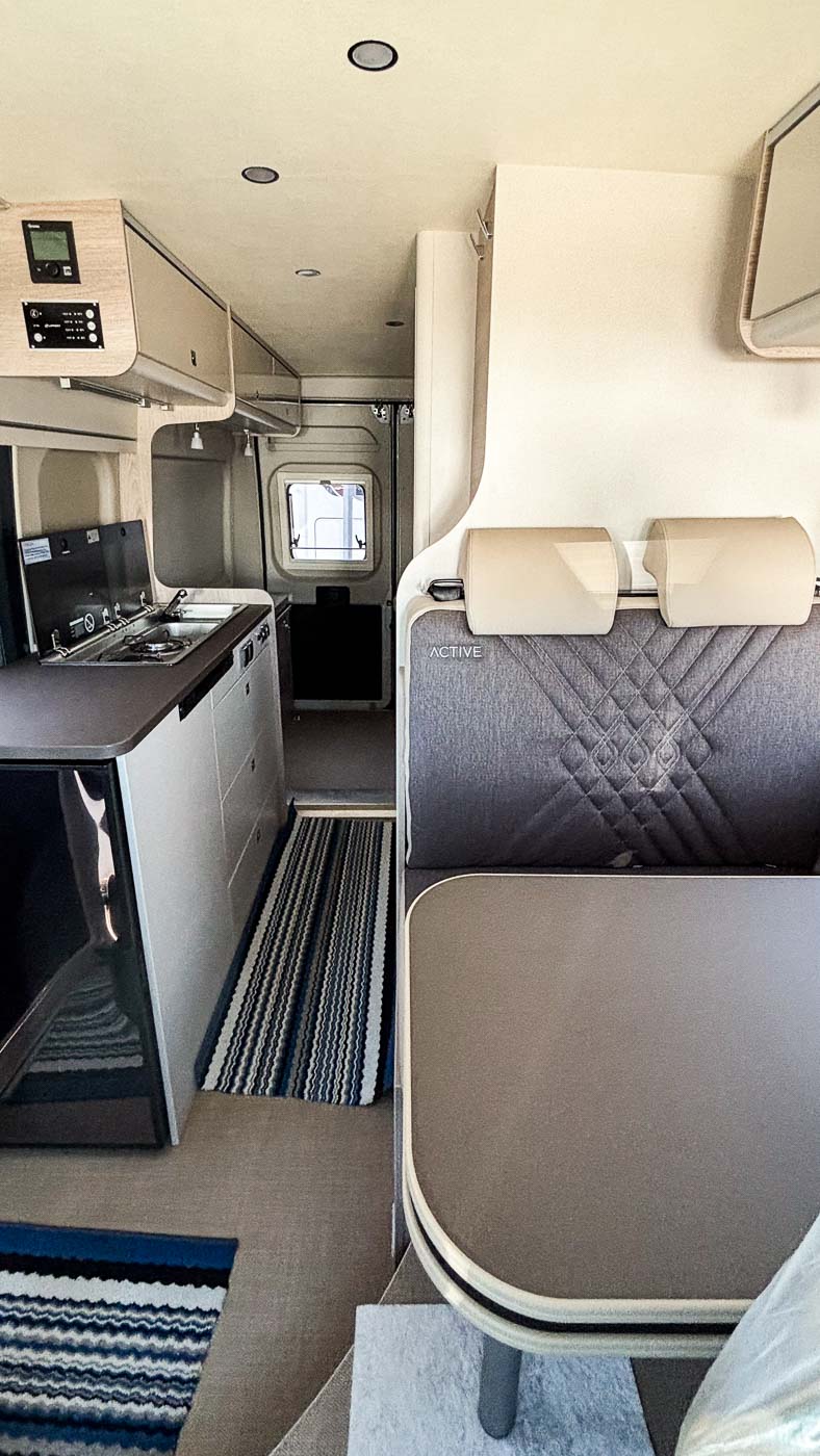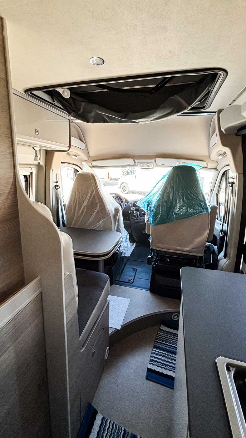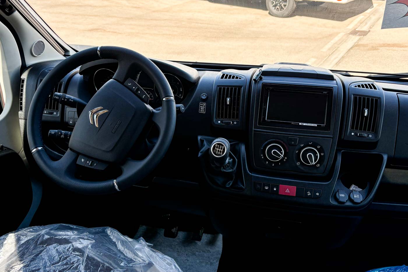 En la parte central del vehículo encontramos un pequeño salón cómodo gracias a la mesa extensible de la que dispone y los asientos giratorios de la cabina.
