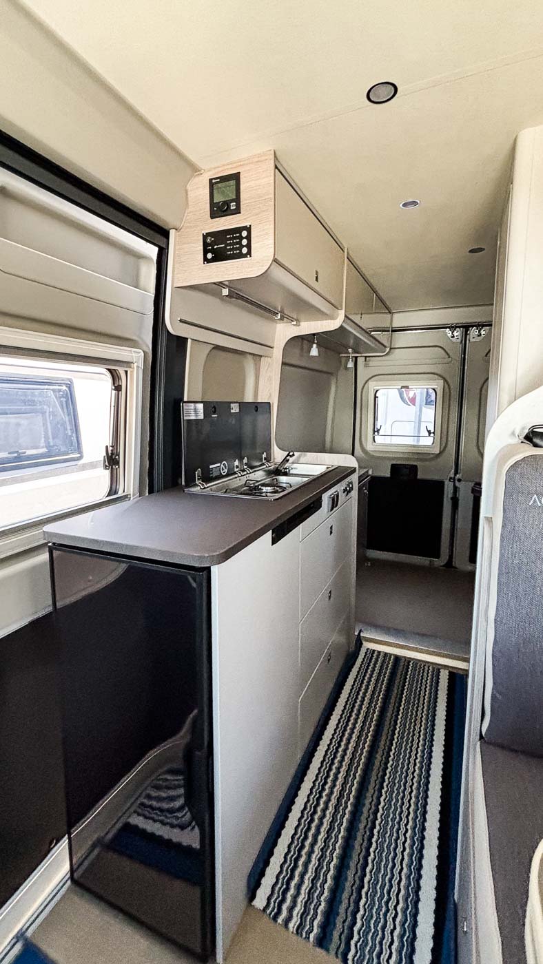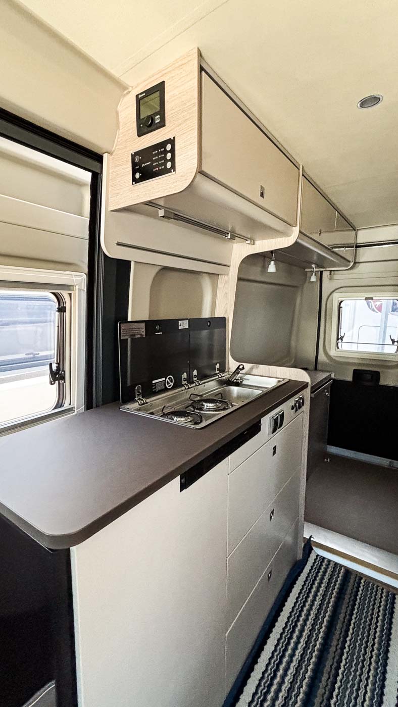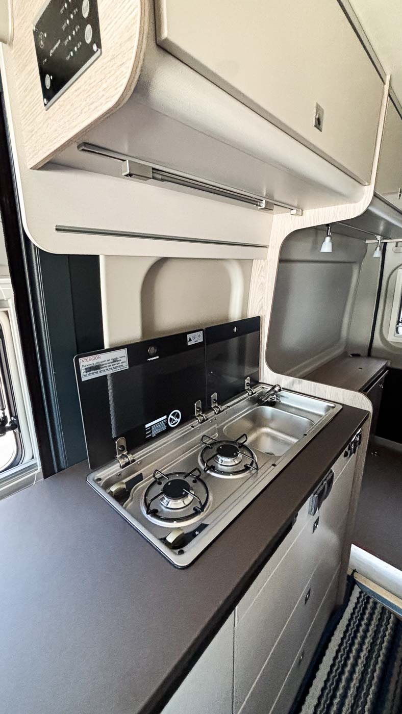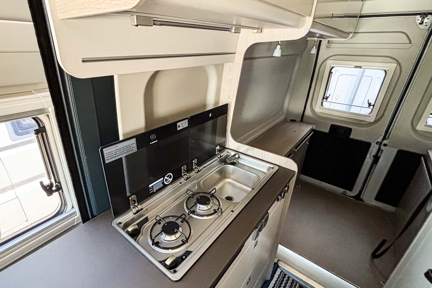 Dispone de cocina práctica y funcional, equipada con dos fuegos, fregadero, y frigorífico. Con numerosos espacios de almacenamiento para menaje de cocina o alimentación.