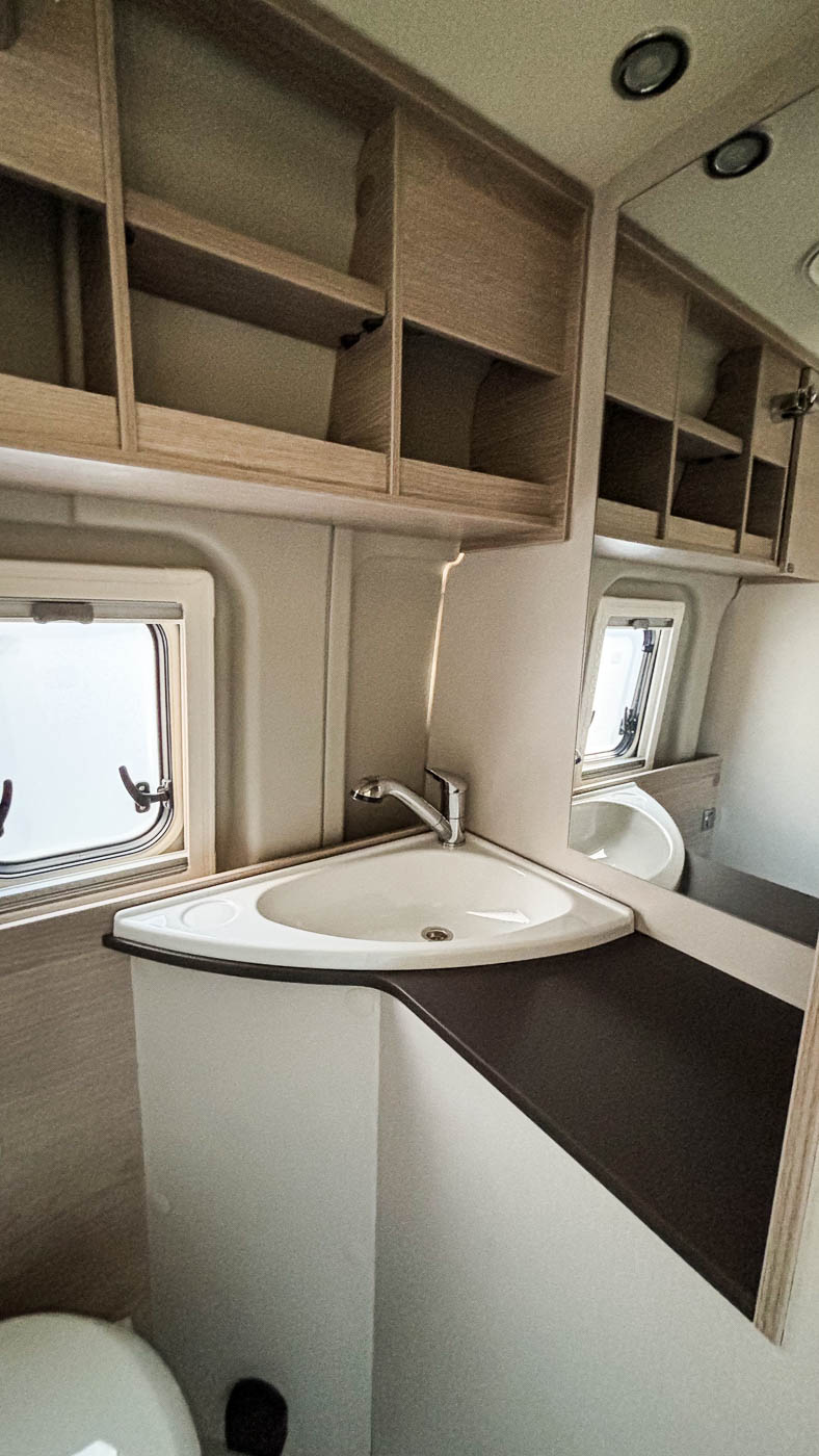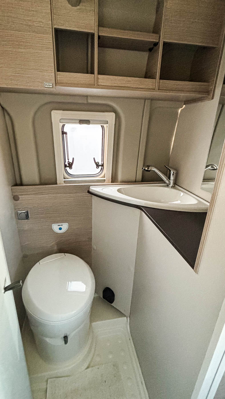 Dispone de baño completamente equipado con todo lo necesario para nuestras estancias: lavamanos, W.C. y ducha extensible, además de espacios de almacenamiento para equipaje.