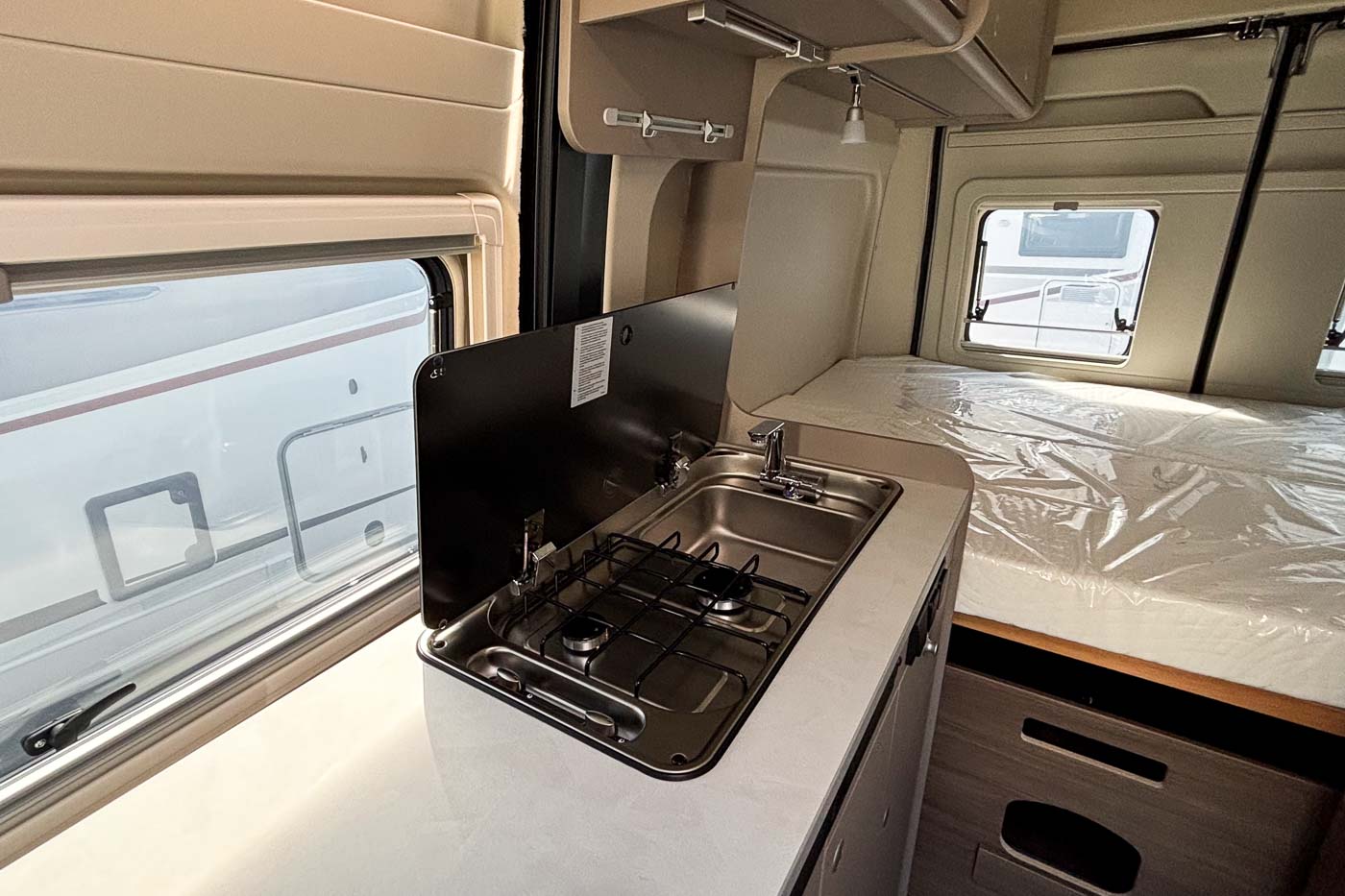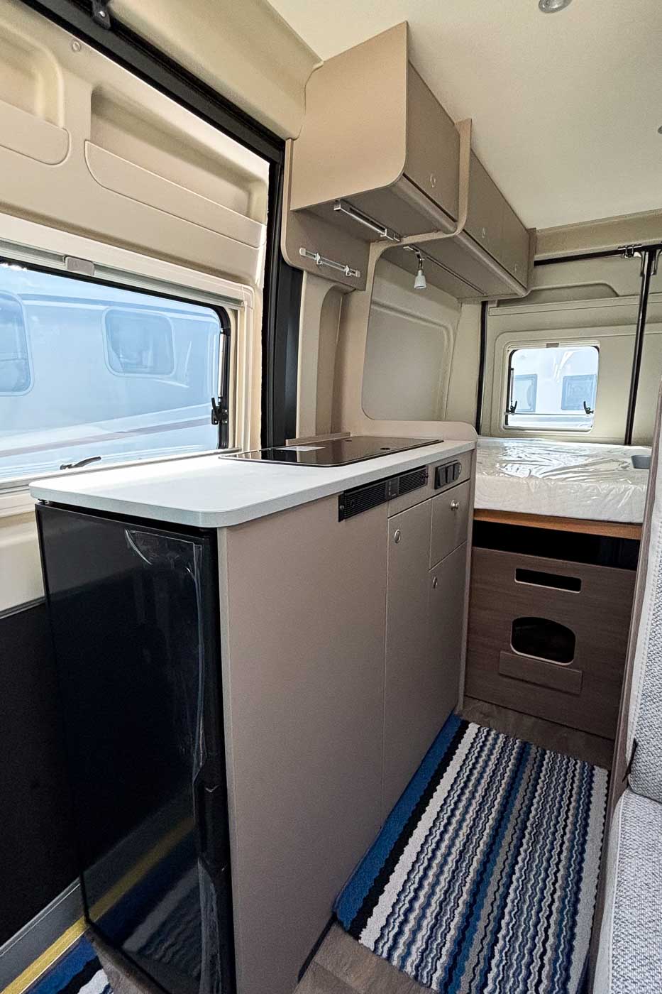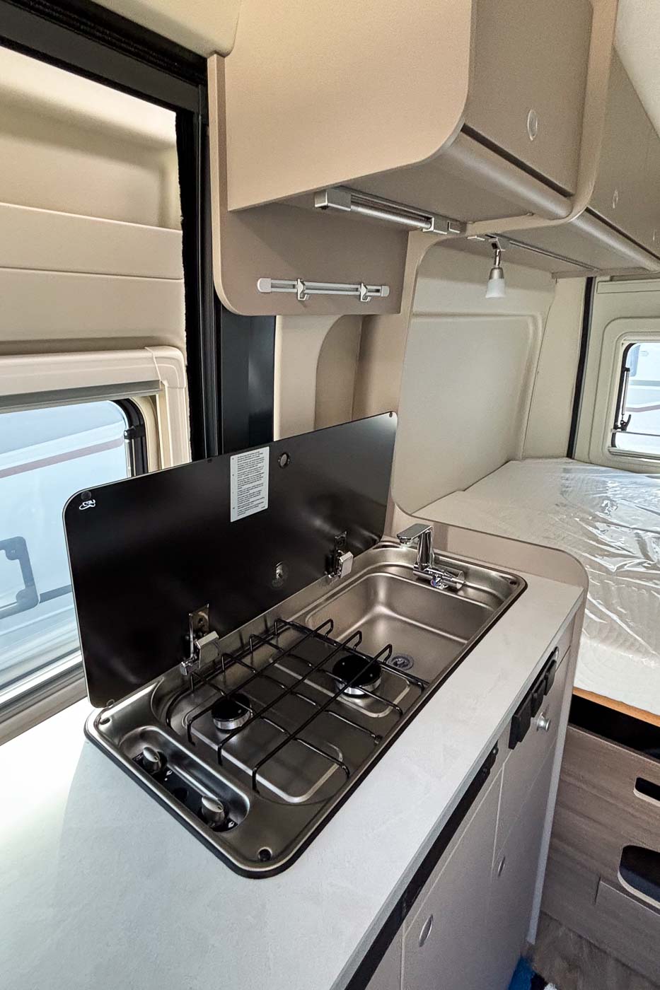 La parte central del vehículo está ocupada por la cocina, equipada con dos fuegos, fregadero y frigorífico.