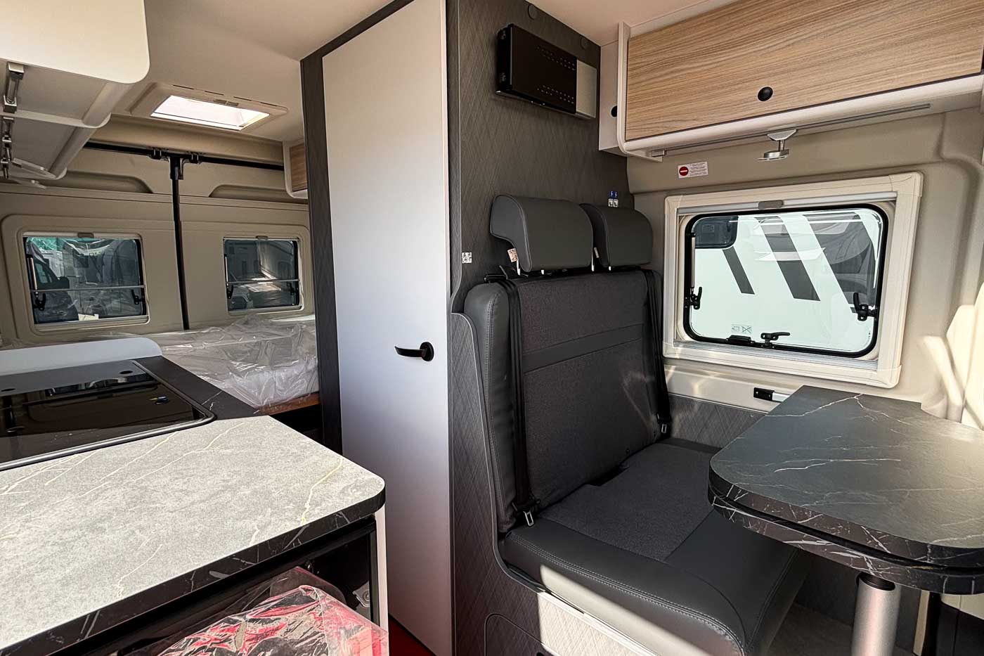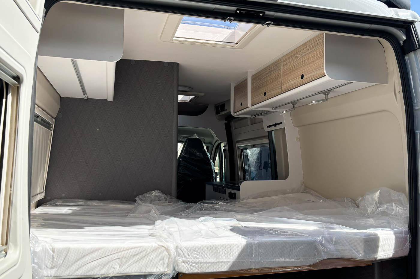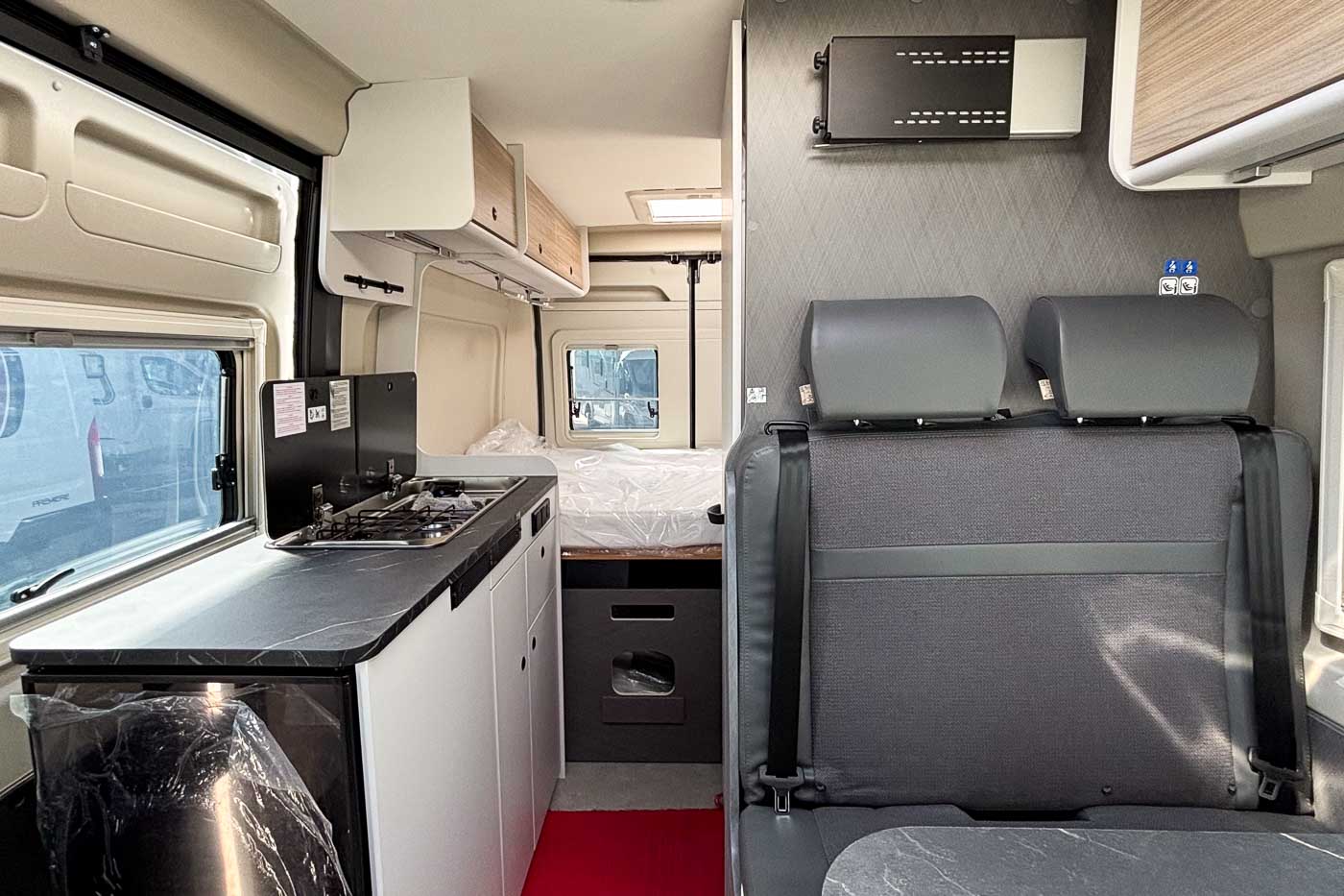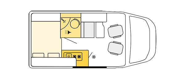 Su distribución se caracteriza principalmente por disponer de amplia cama transversal en la parte trasera, fácilmente desmontable para aprovechar el espacio para el transporte de equipaje durante los trayectos.