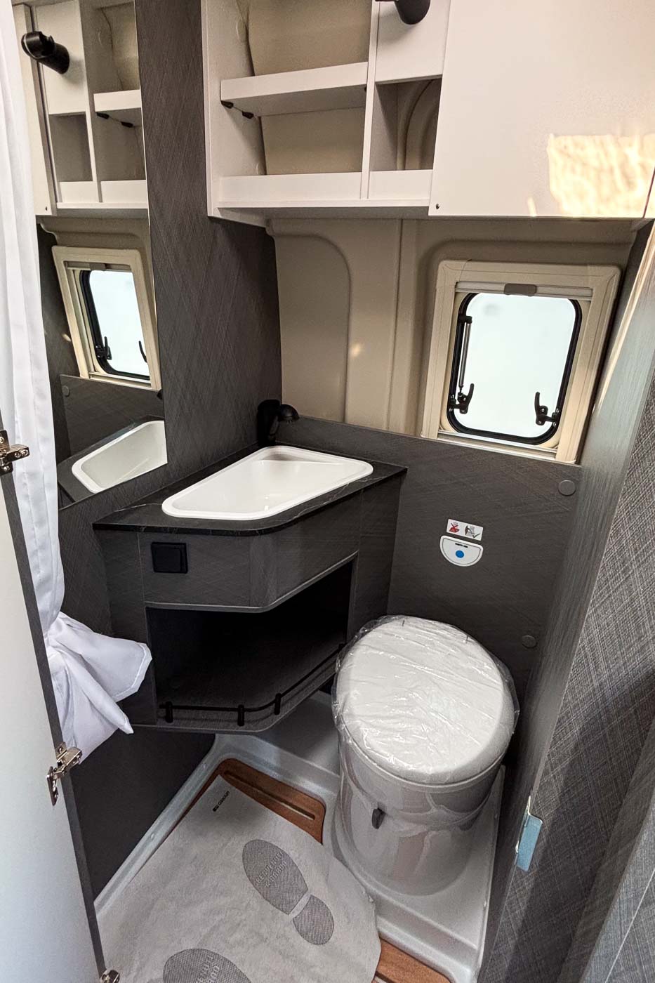 En el baño, compacto y funcional, encontrará todo lo que necesita: lavamanos, W.C. y ducha extensible, así como espacios de almancemamiento.