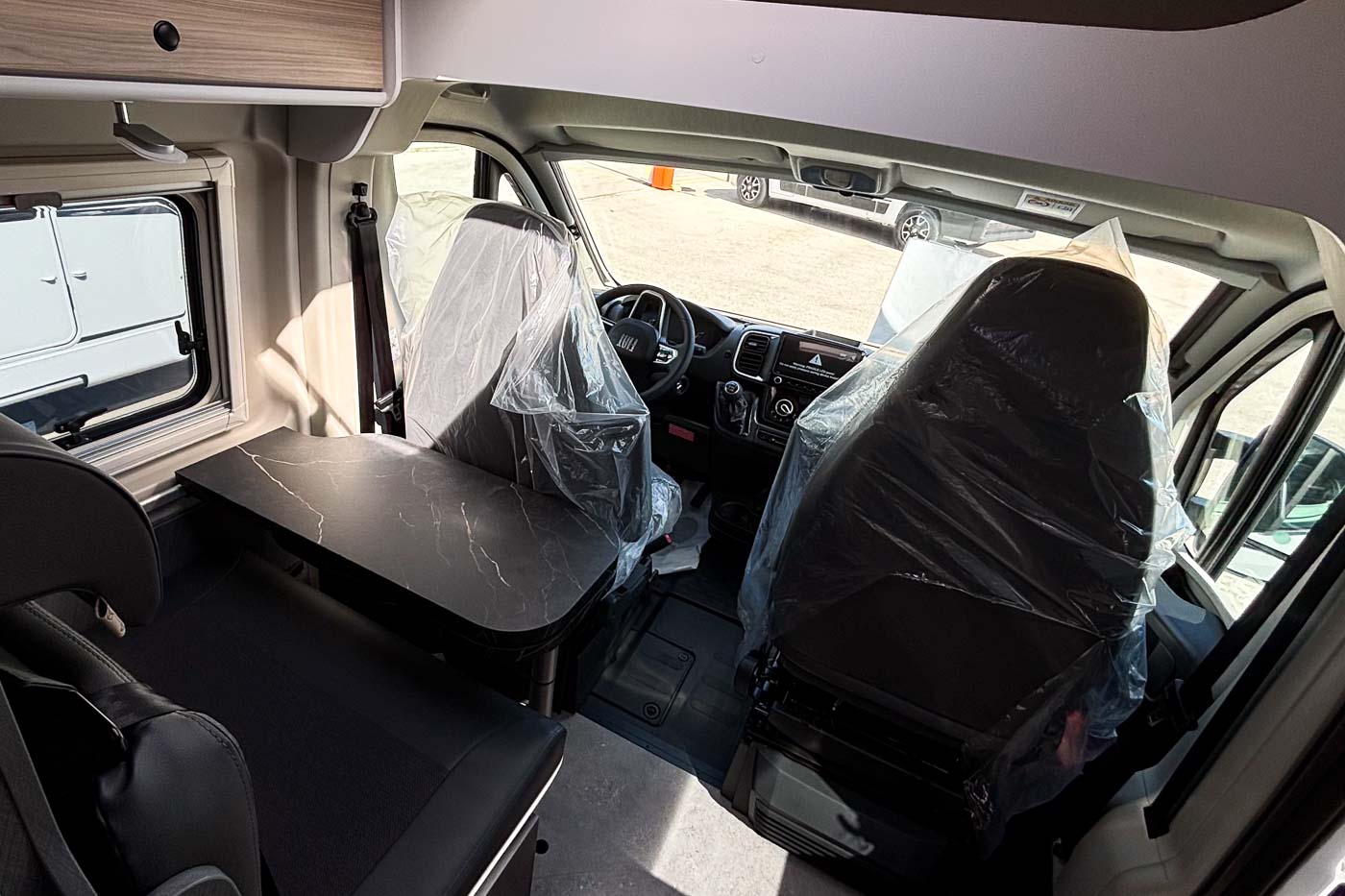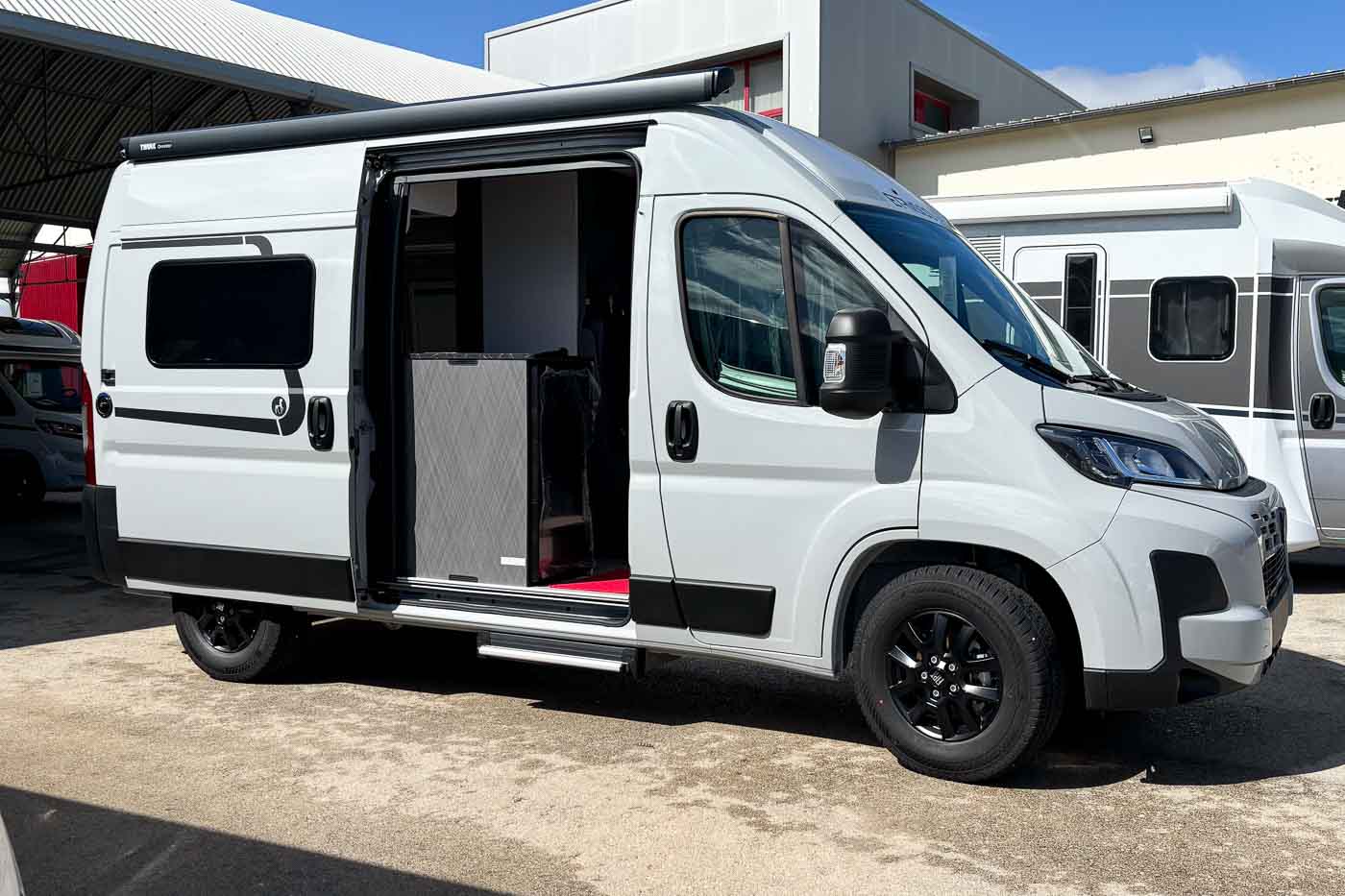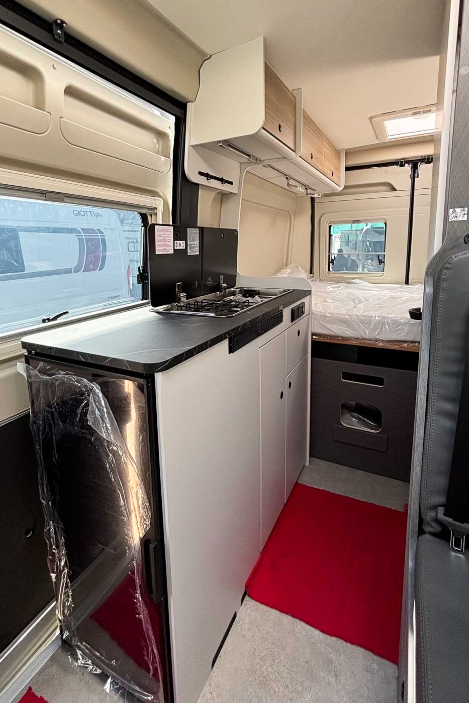 La parte central del vehículo está ocupada por la cocina, equipada con dos fuegos, fregadero y frigorífico. Dispone de numerosos espacios de almacenamiento para menaje y alimentación.