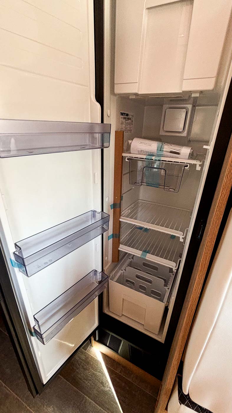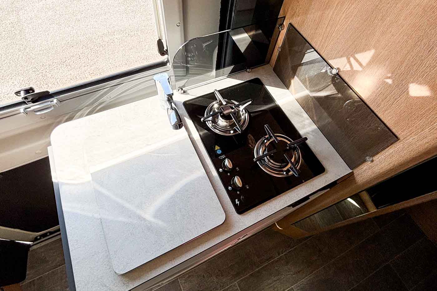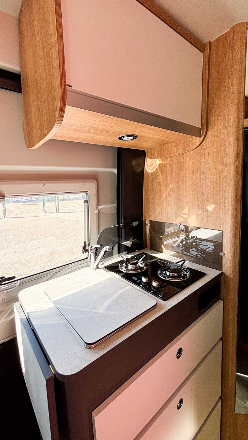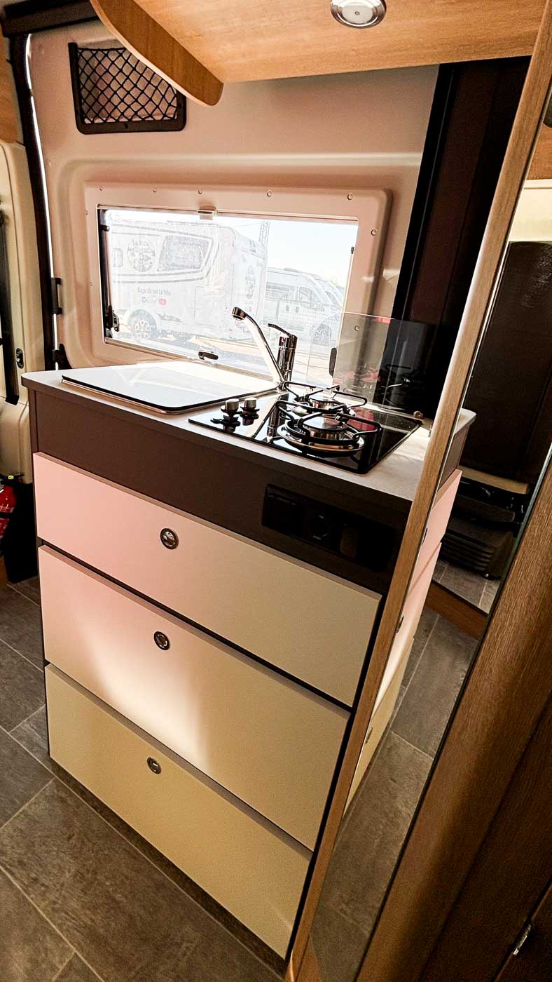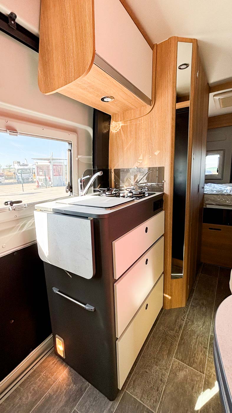 La parte central del vehículo está ocupada por la cocina, equipada con dos fuegos, fregadero y frigorífico grande, así como aleta lateral extensible.