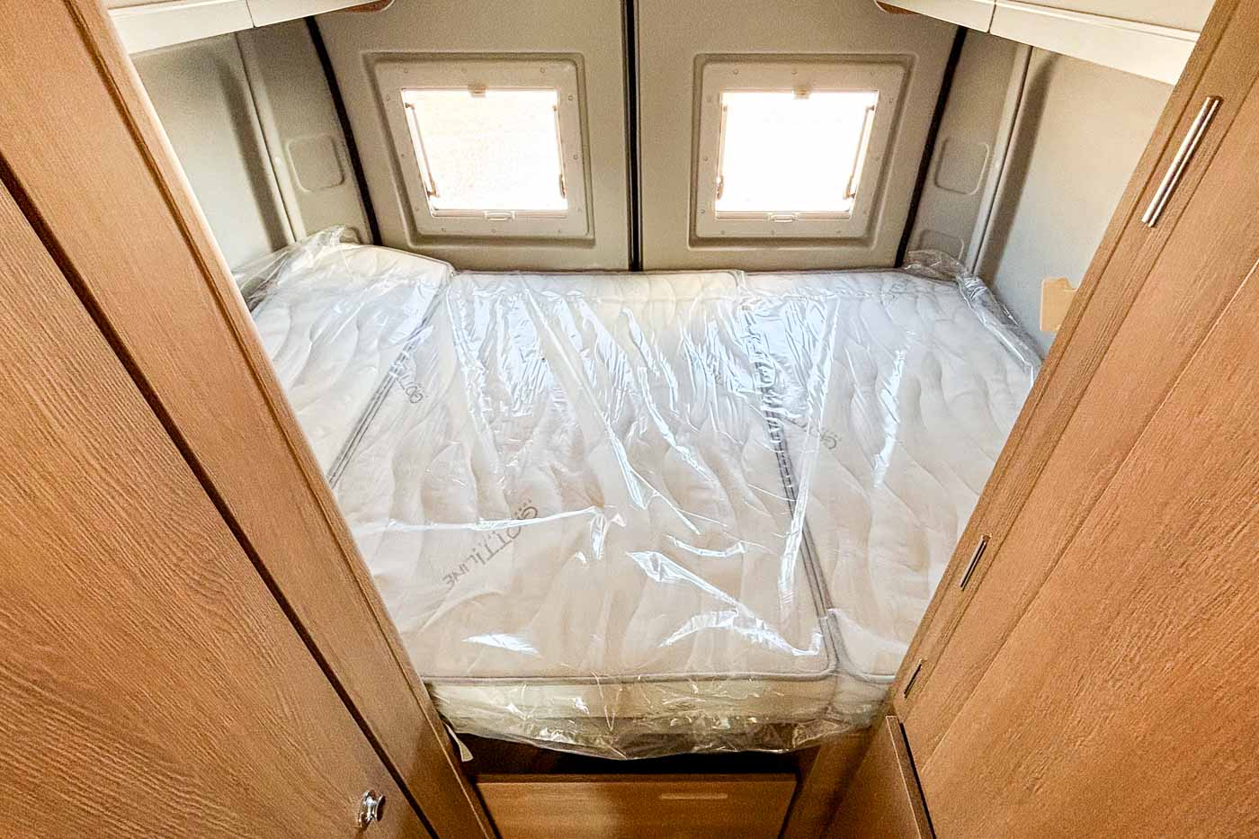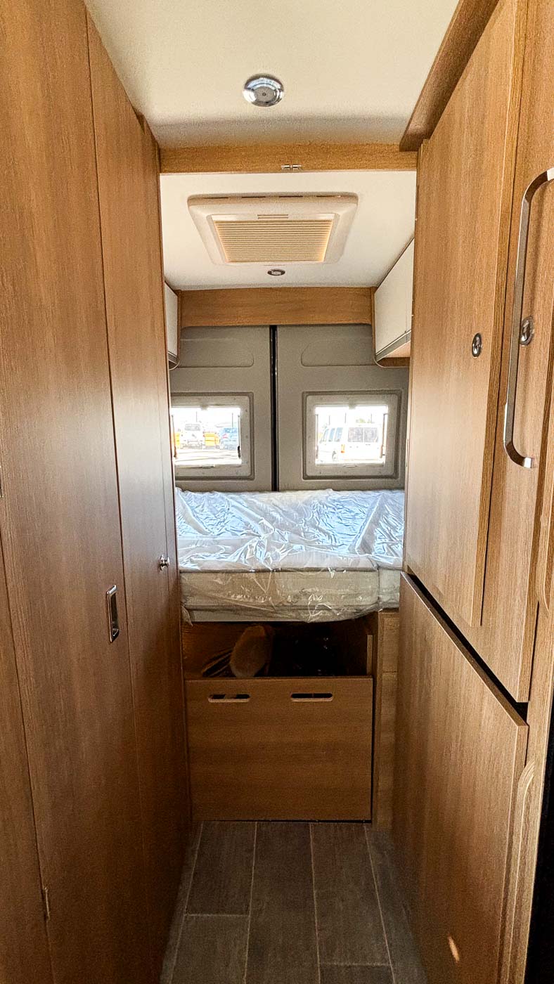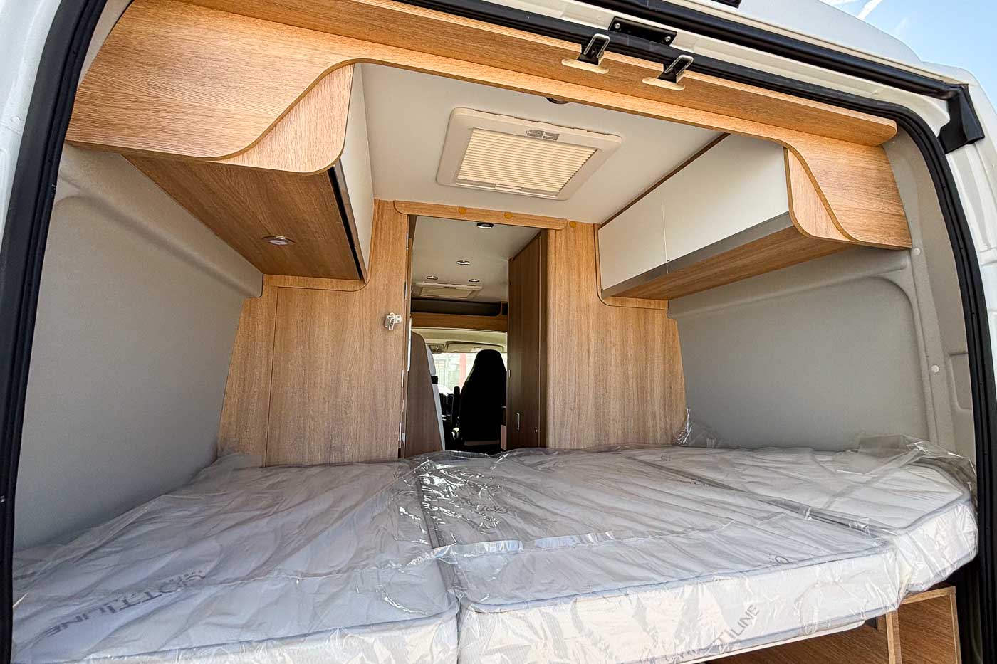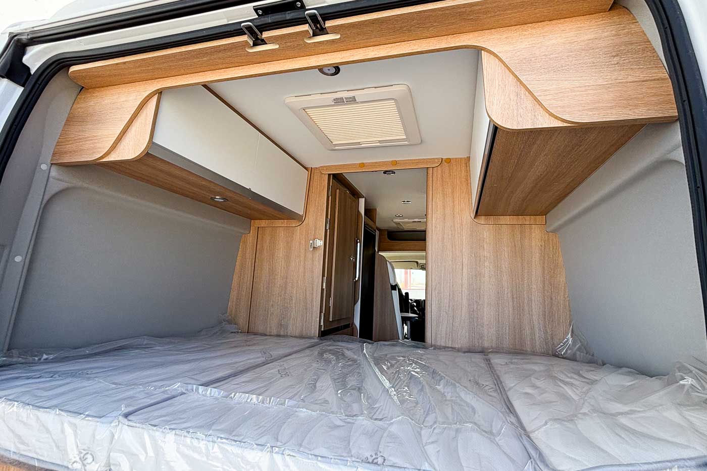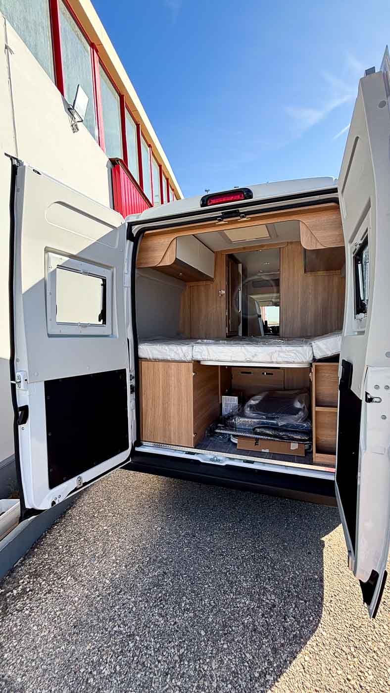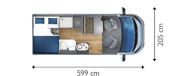 Su distribución se caracteriza principalmente por disponer de amplia cama transversal en la parte trasera, fácilmente desmontable para aprovechar el espacio para el transporte de equipaje durante los trayectos.