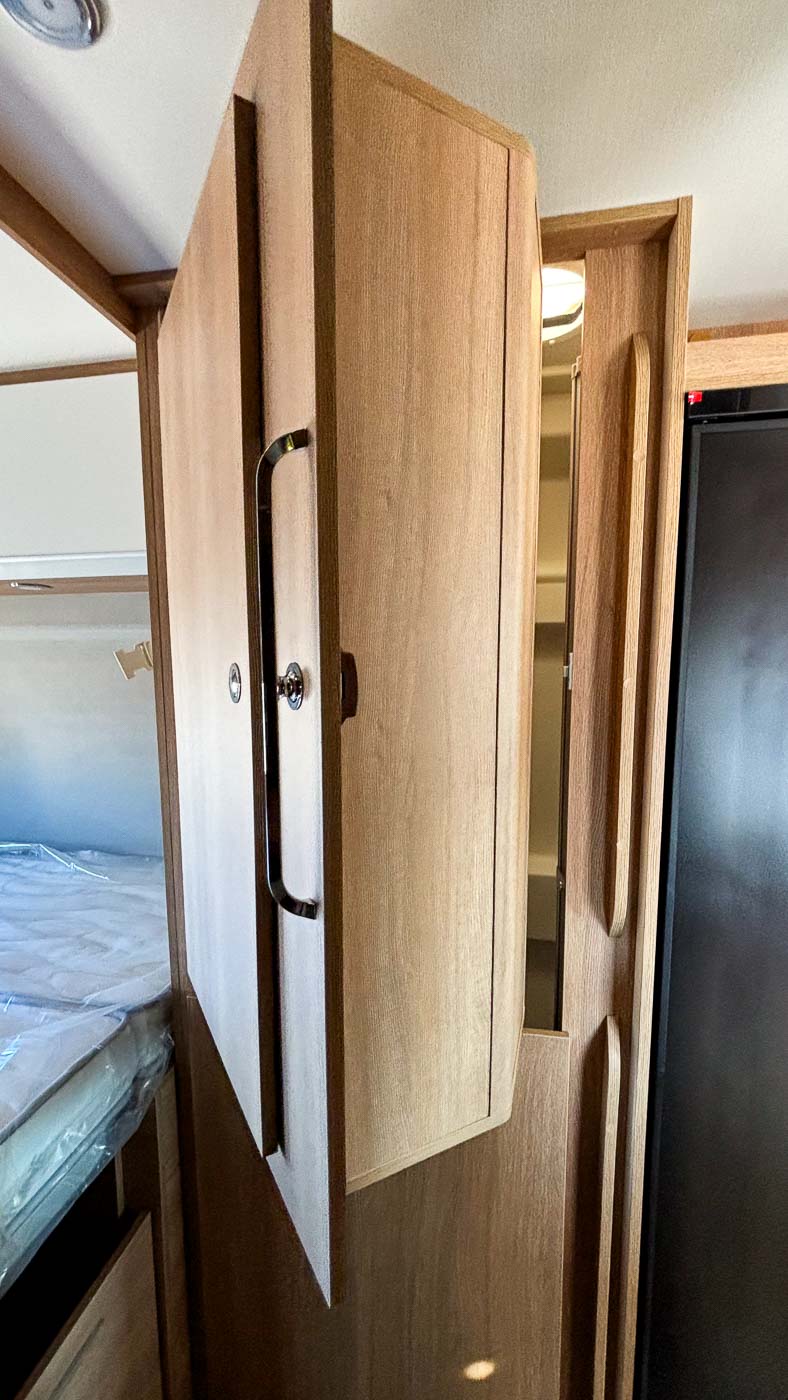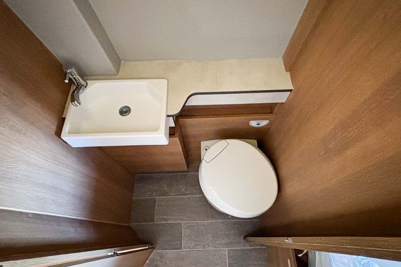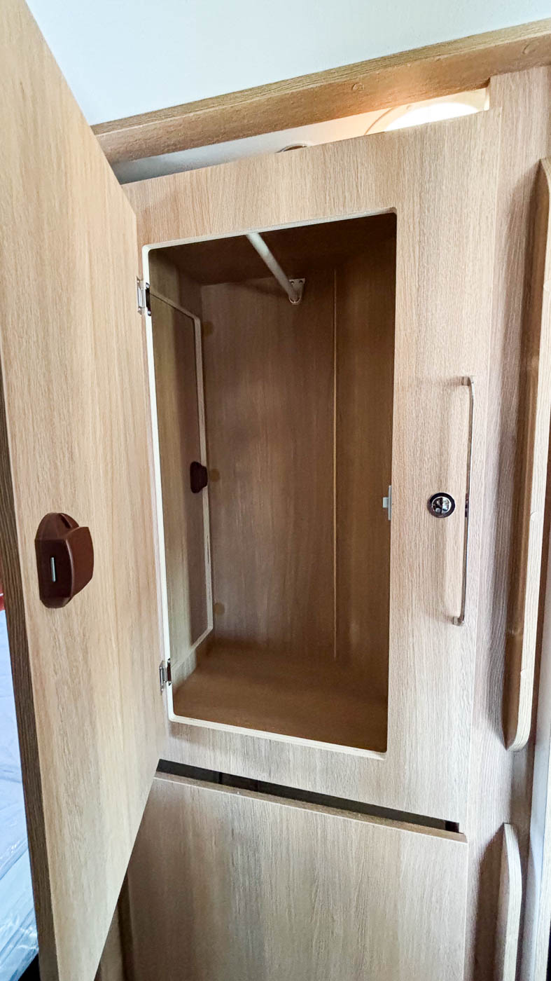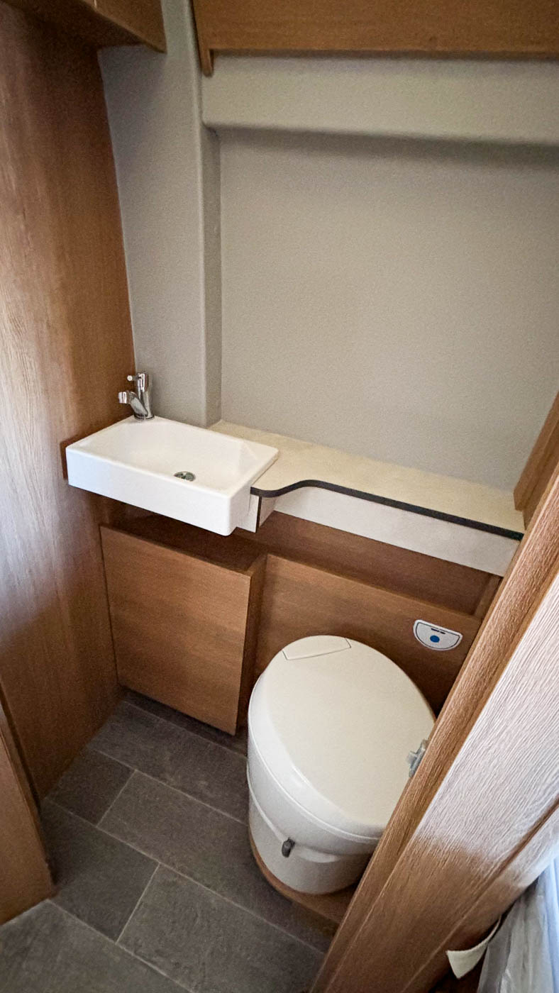En el baño, compacto y funcional, encontrará todo lo que necesita: lavamanos y W.C. Esta cámper dispone además de cabina de ducha independiente, ubicada tras el armario abatible del que dispone.