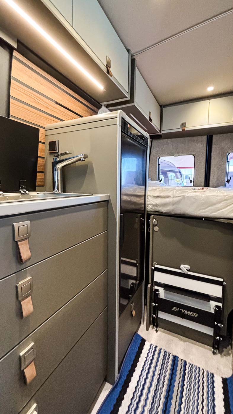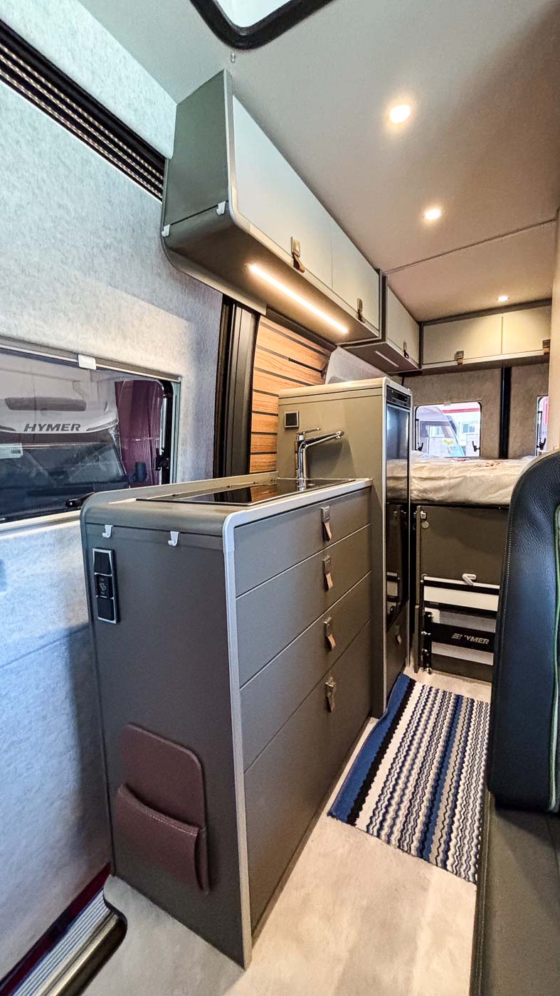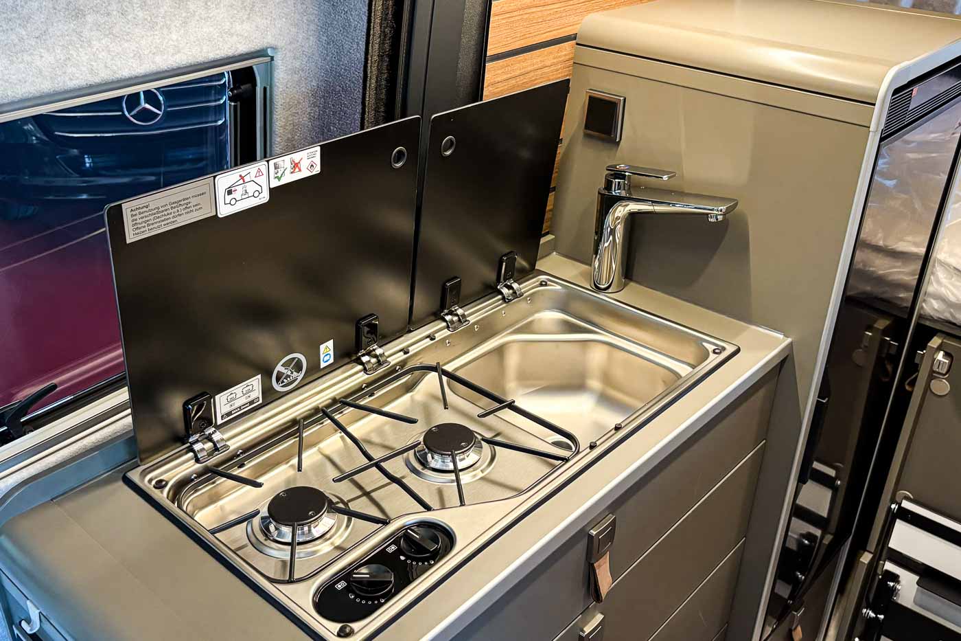 La parte central del vehículo está ocupada por la cocina, equipada con dos fuegos, fregadero y frigorífico.
