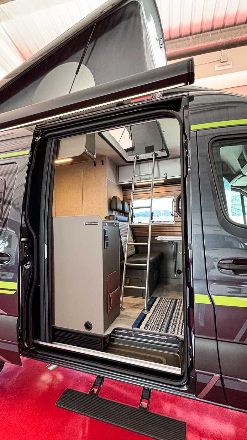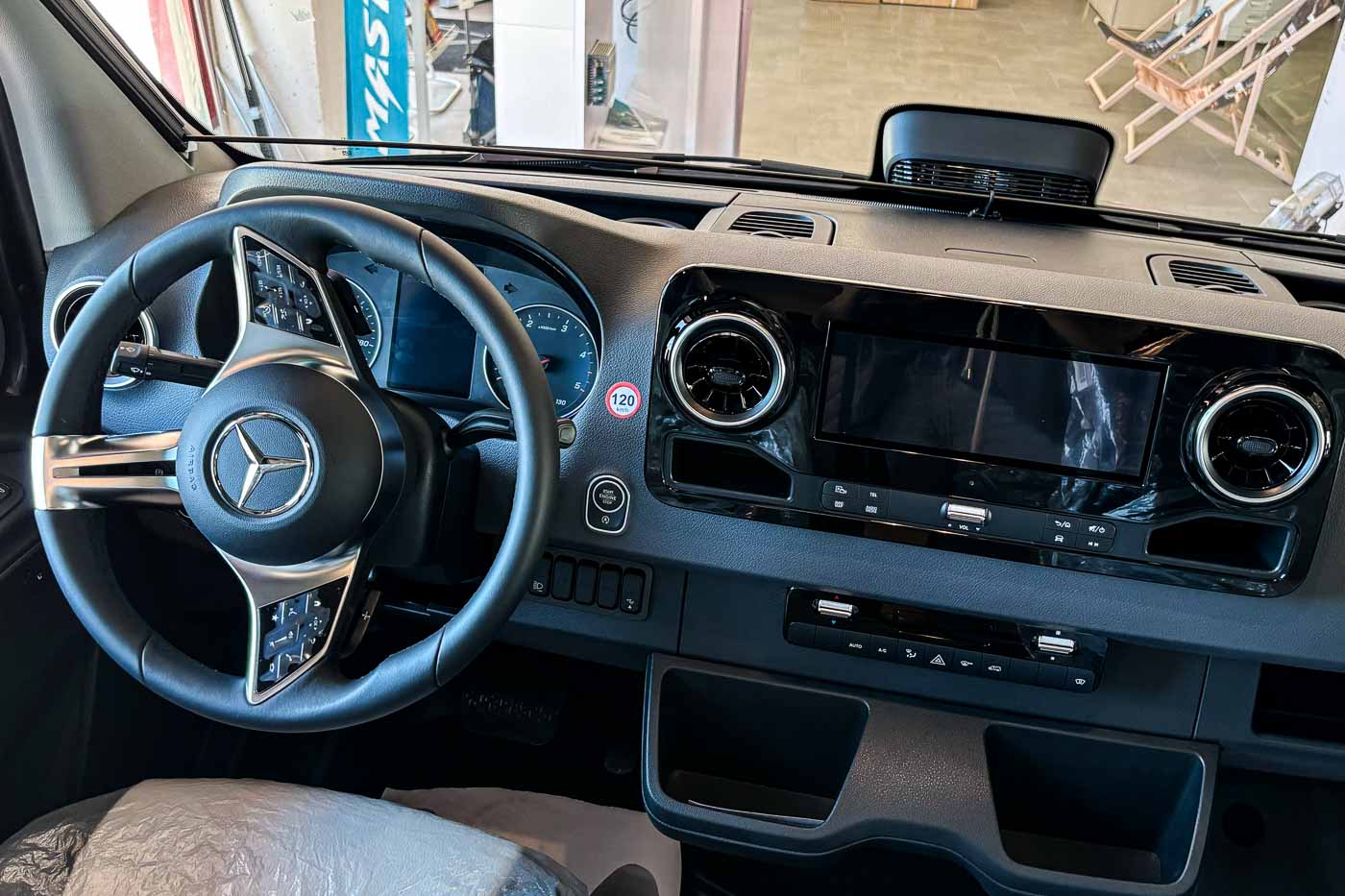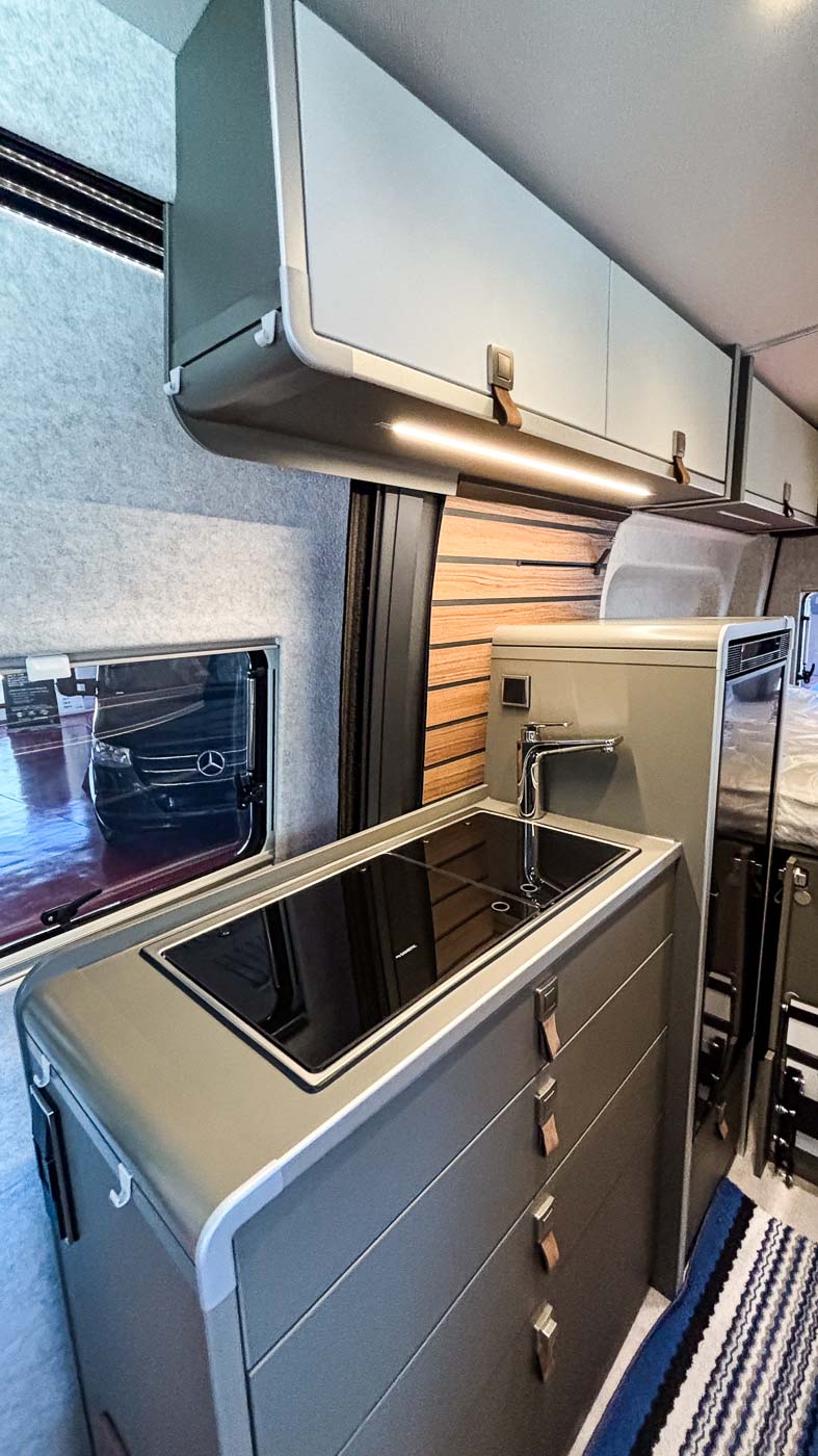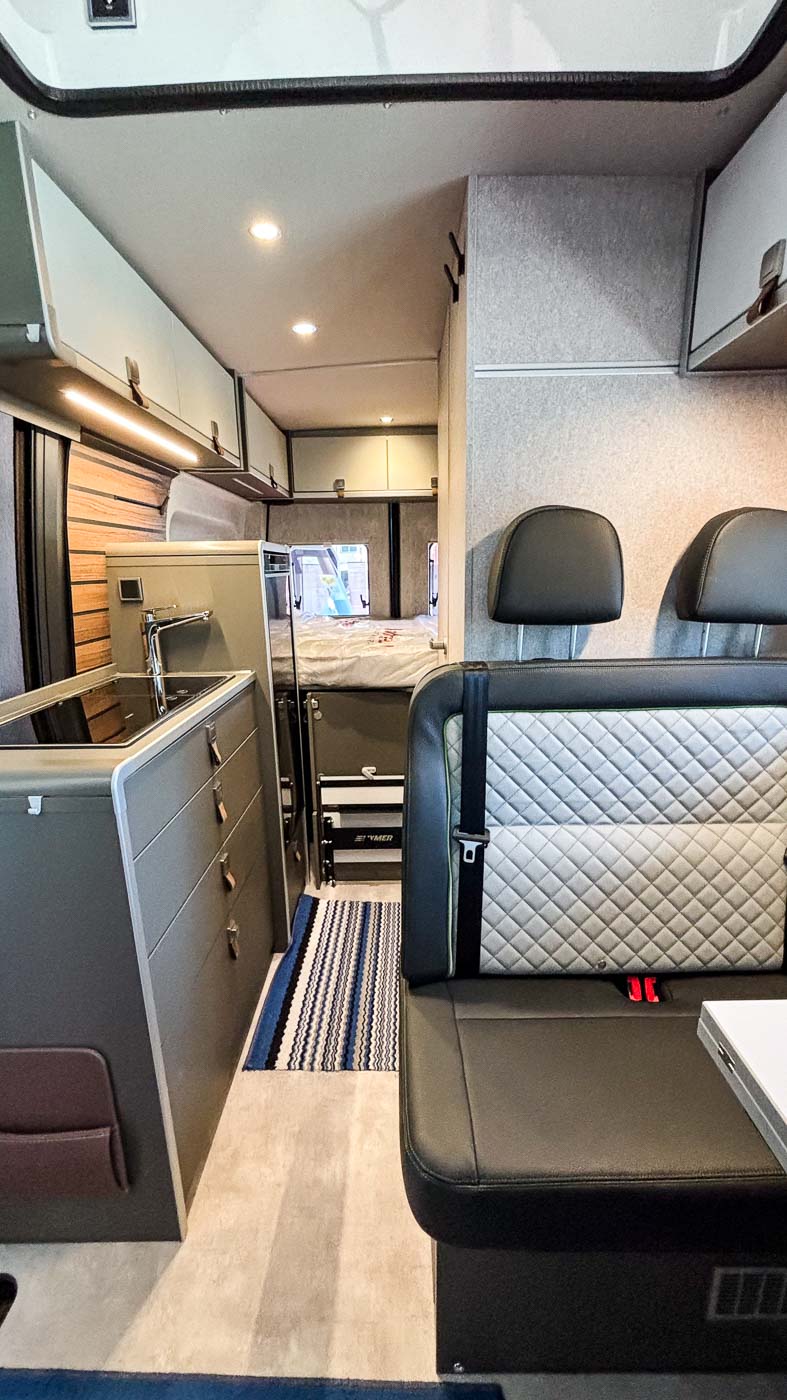 La parte central del vehículo está ocupada por la cocina, equipada con dos fuegos, fregadero y frigorífico.
