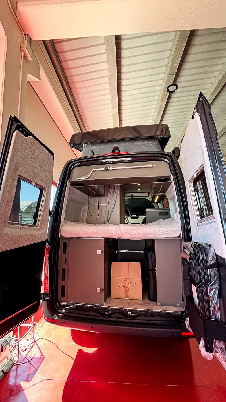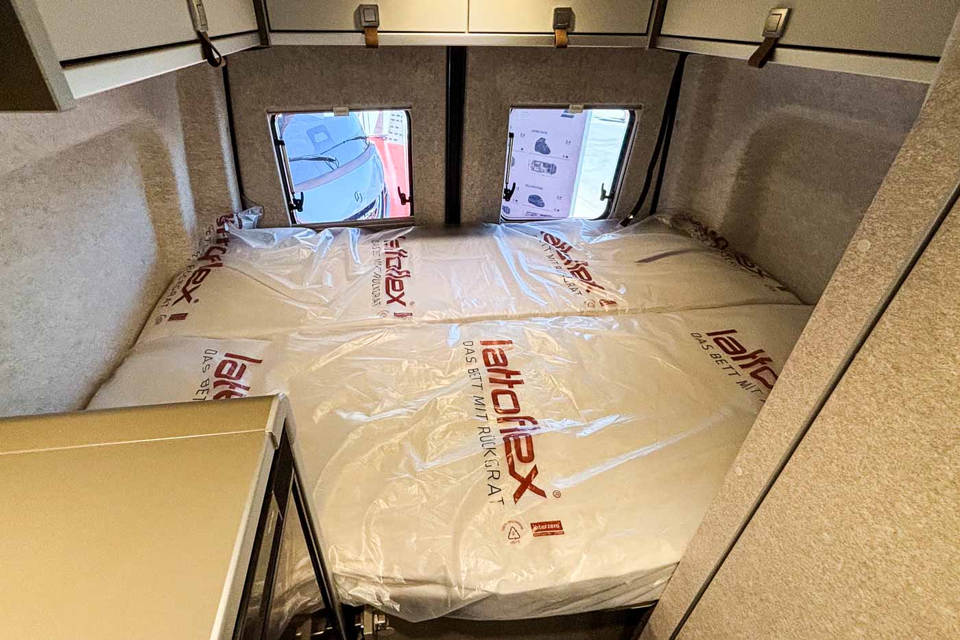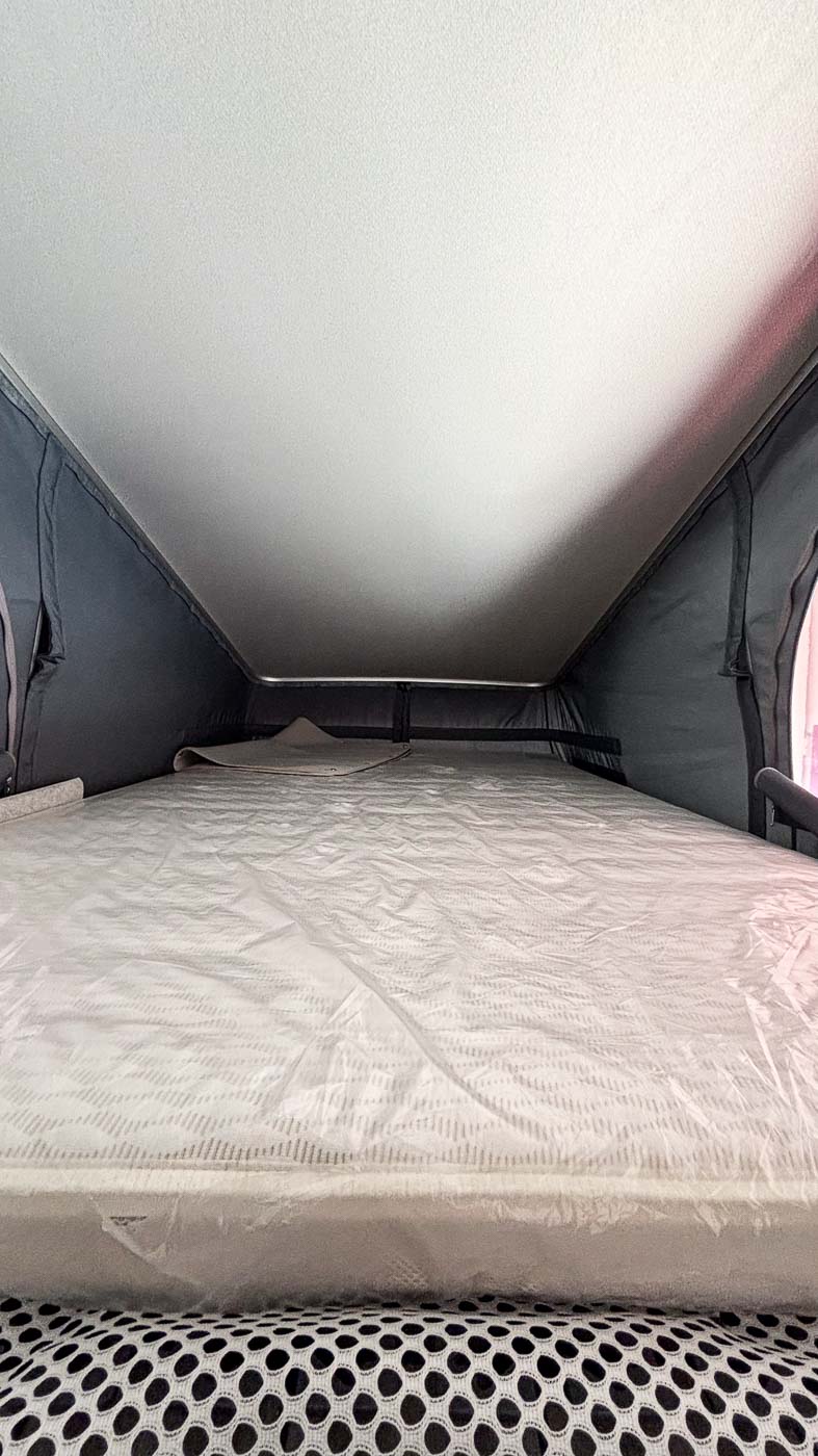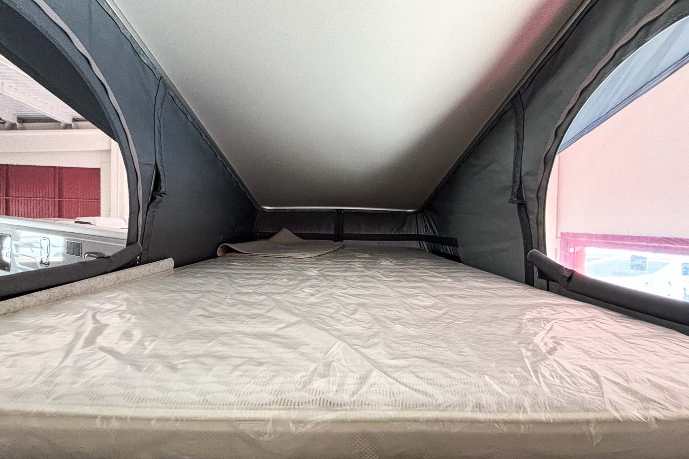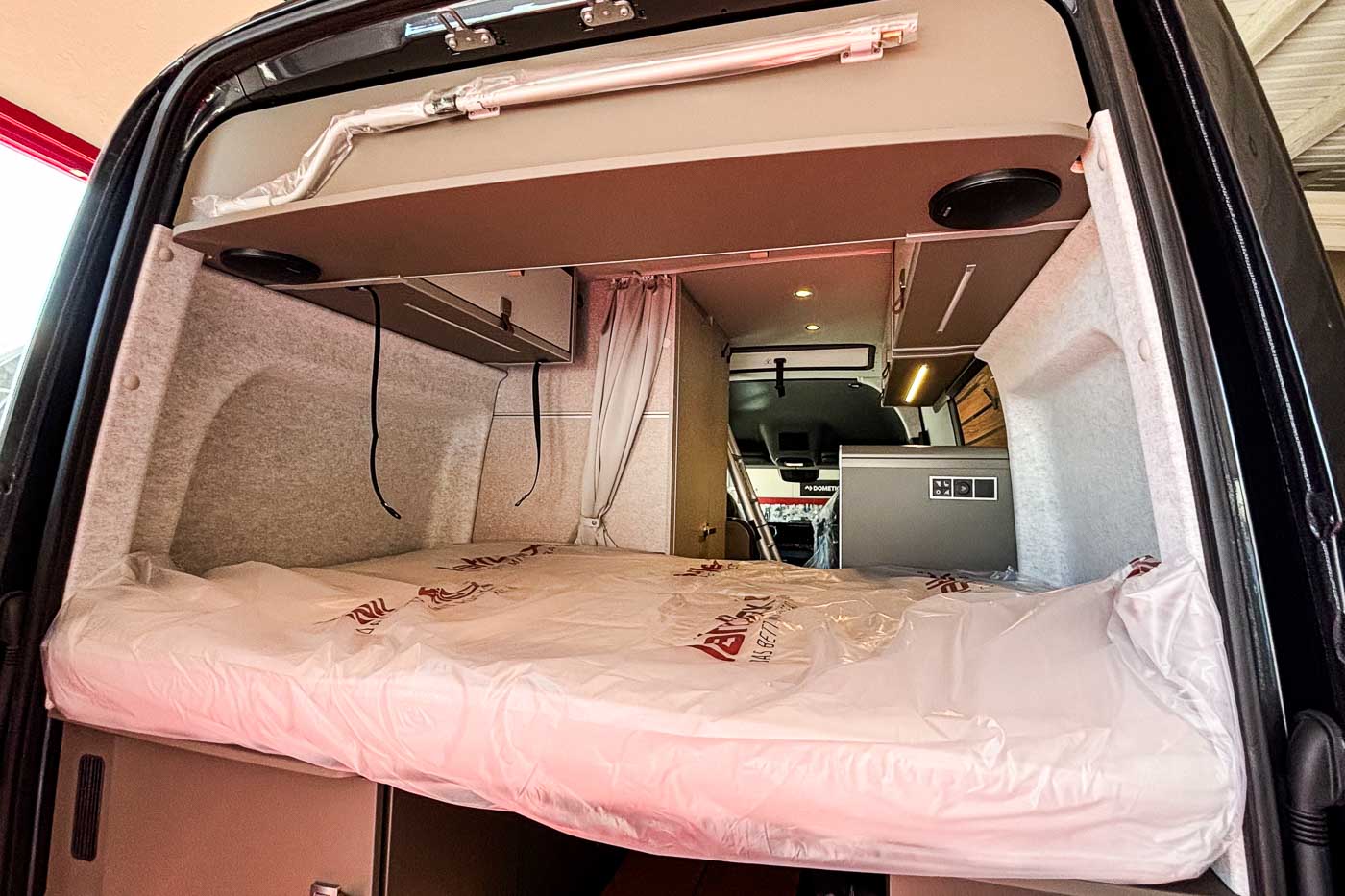 Gracias a su techo abatible, encontramos otra cama doble de grandes dimensiones, ofreciendo así hasta cuatro plazas para dormir.