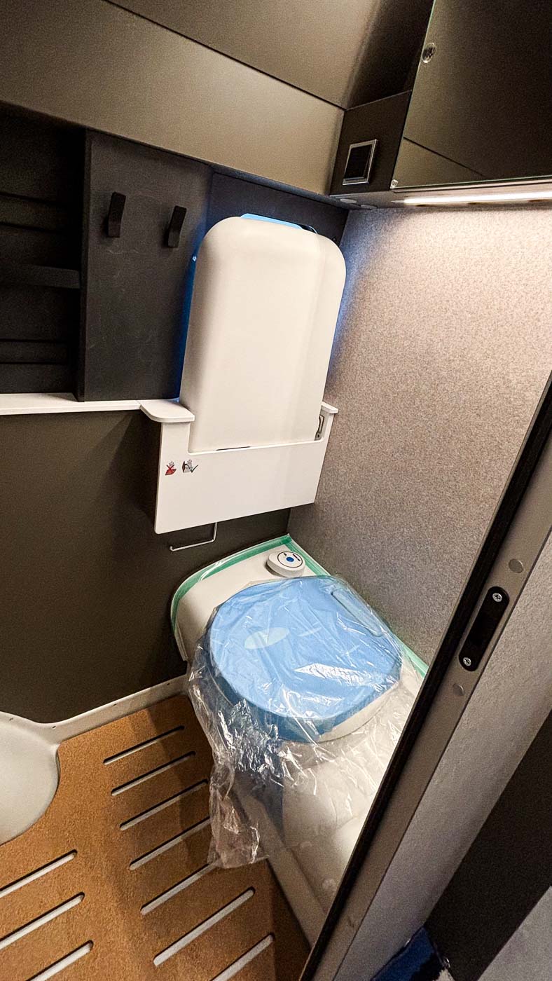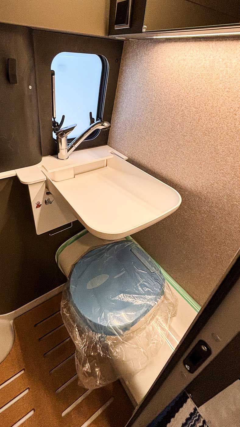 En el baño, compacto y funcional, encontrará todo lo que necesita: lavamanos plegable, W.C. y ducha extensible.