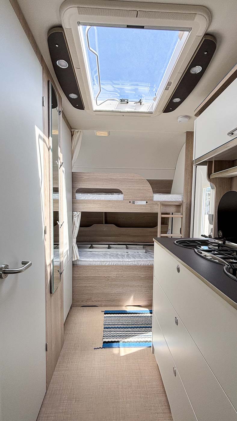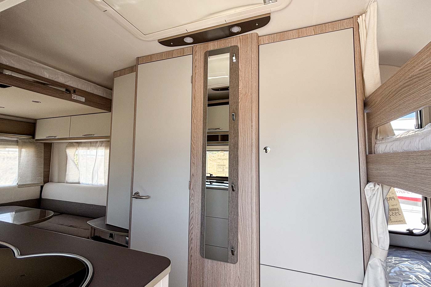 La Burstner Premio Plus 440 TK tiene capacidad para hasta seis personas y se caracteriza principalmente por disponer de dos ambientes: salón con cama abatible en techo y literas. Una distribución ideal para familias con hijos que quieran disfrutar de las estancias con el mayor confort posible.