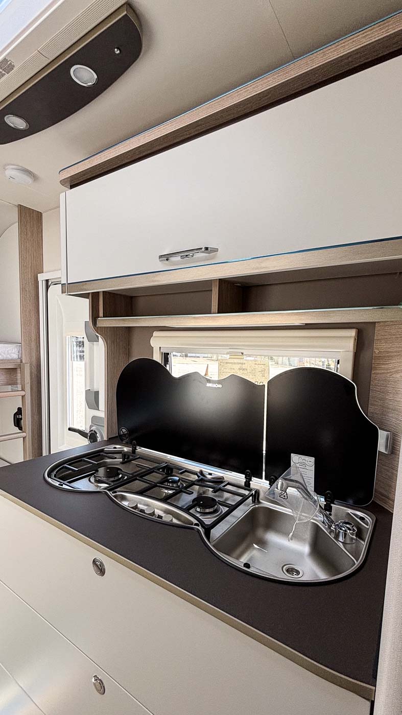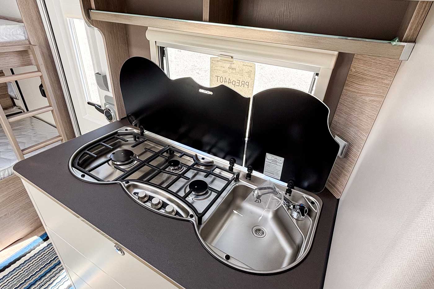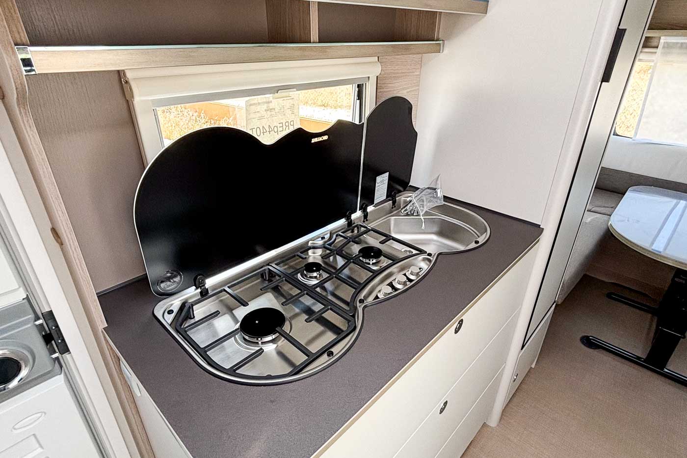 En la parte central de la caravana se encuentra la cocina, completamente equipada con todo lo necesario: tres fuegos, fregadero y frigorífico grande.