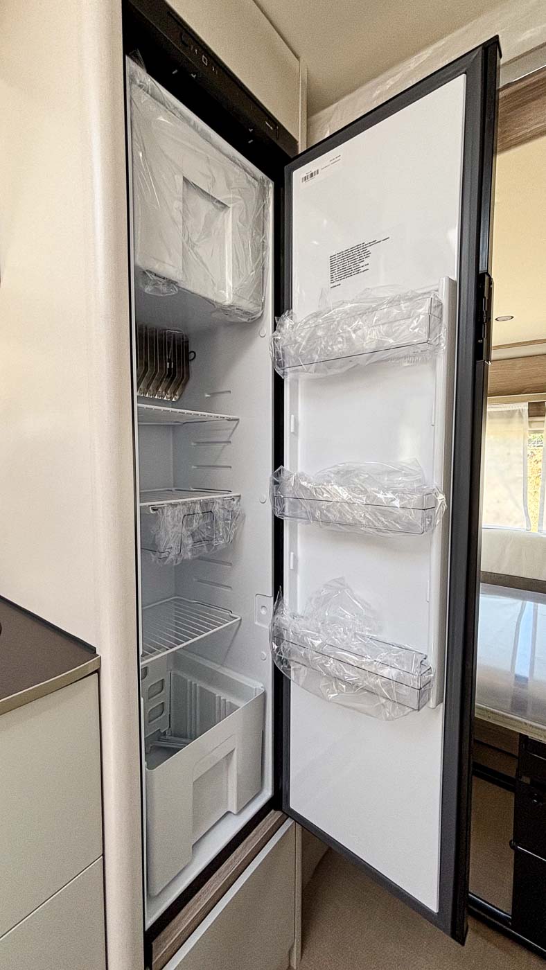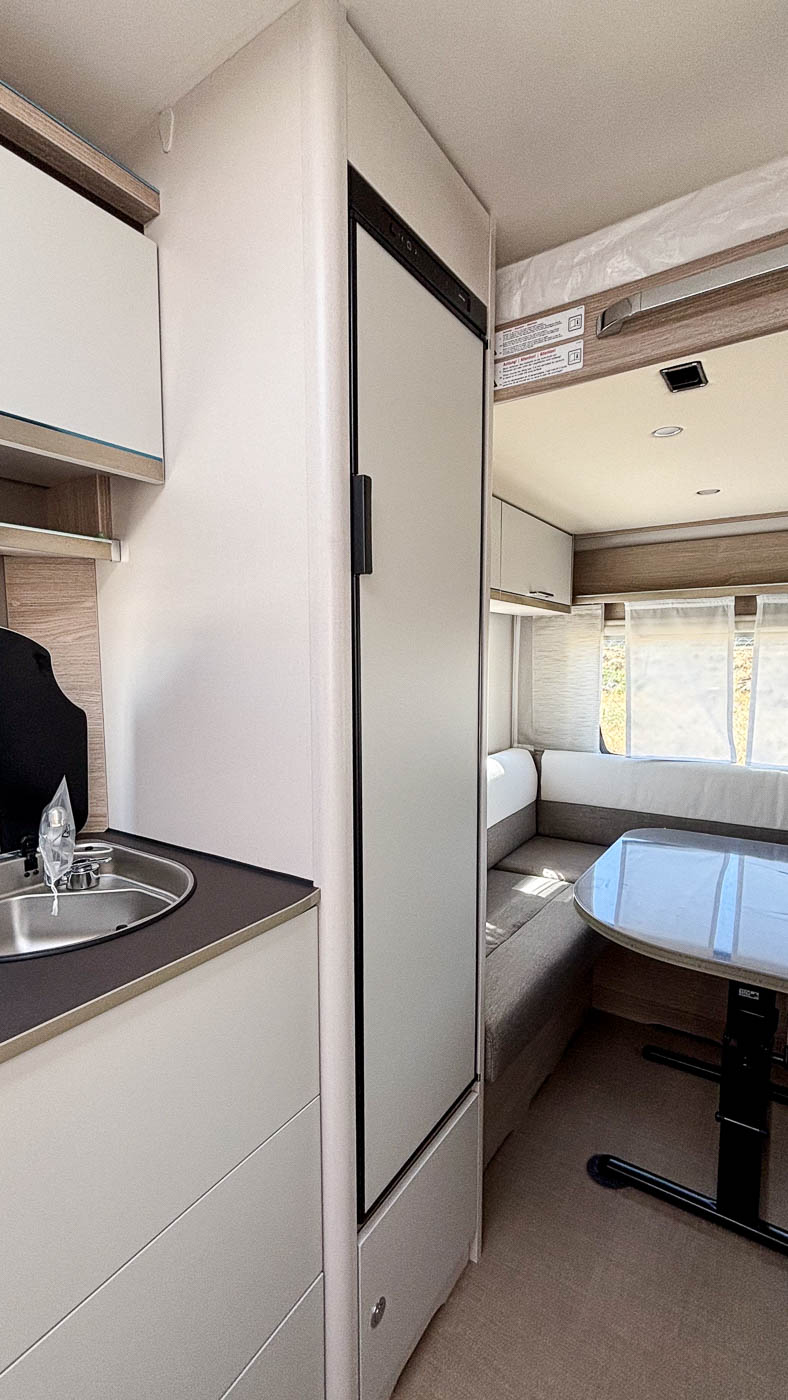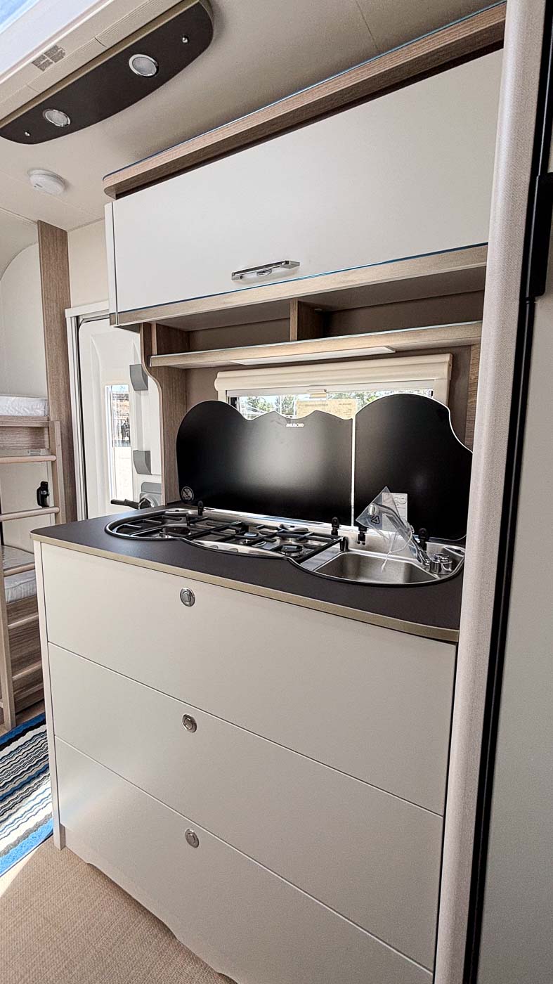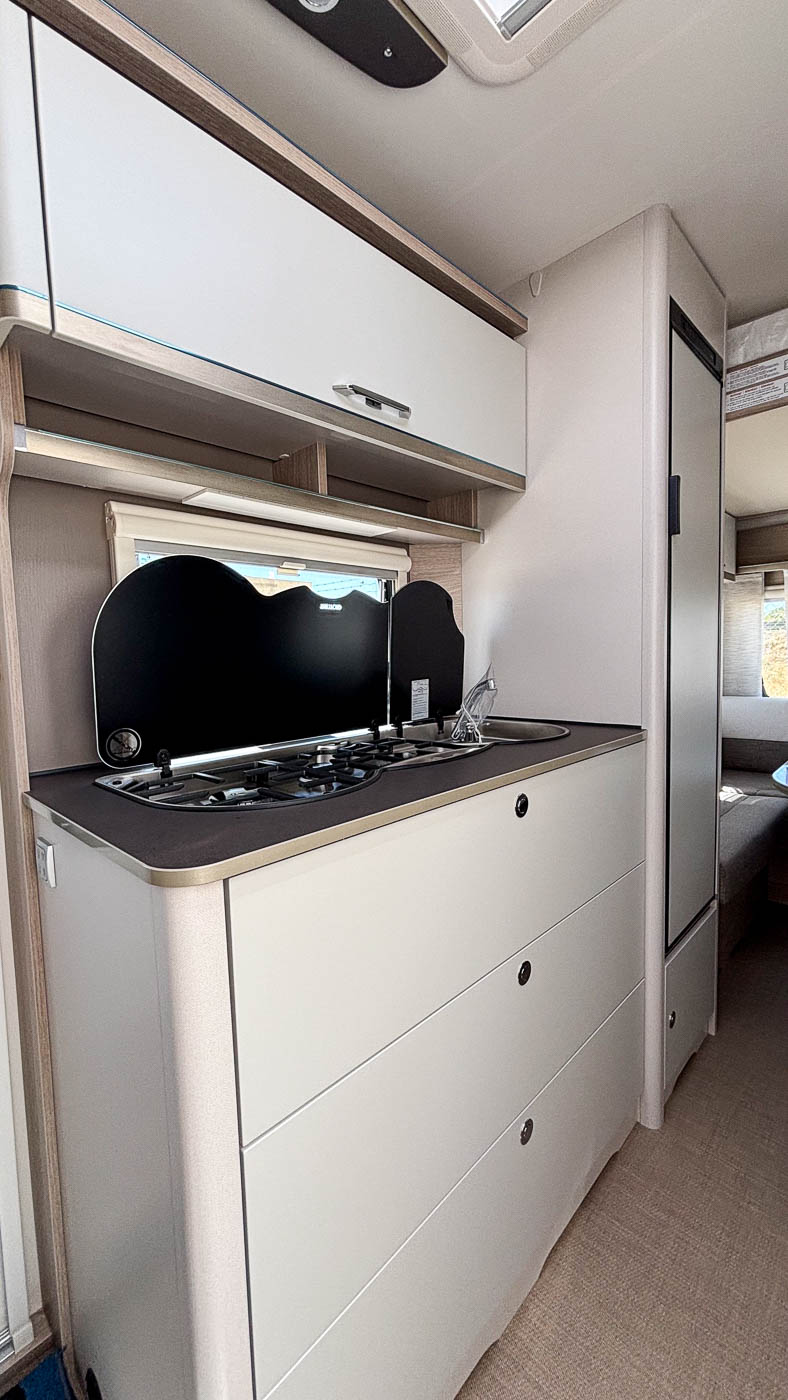 En la parte central de la caravana se encuentra la cocina, completamente equipada con todo lo necesario: tres fuegos, fregadero y frigorífico grande.