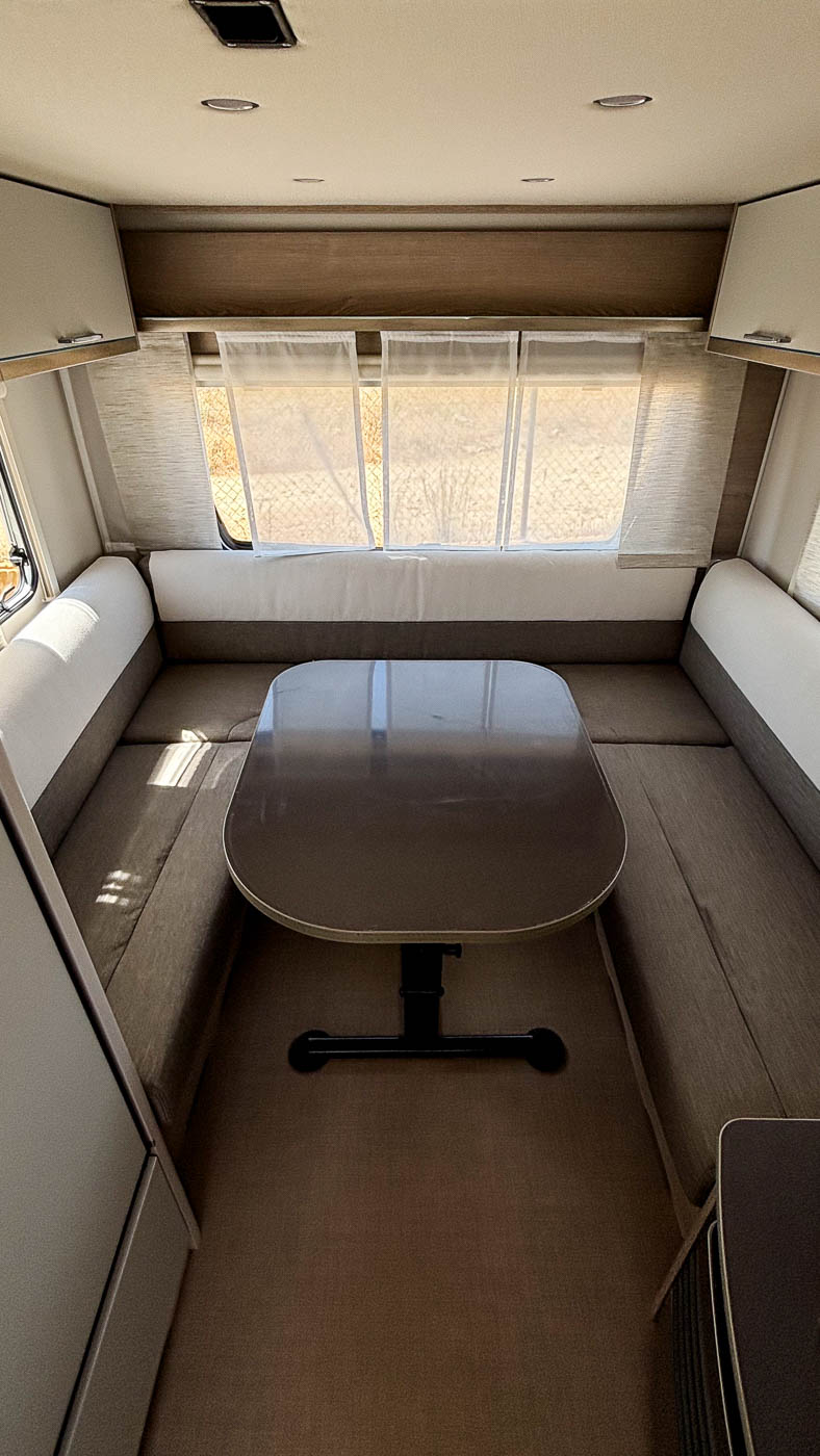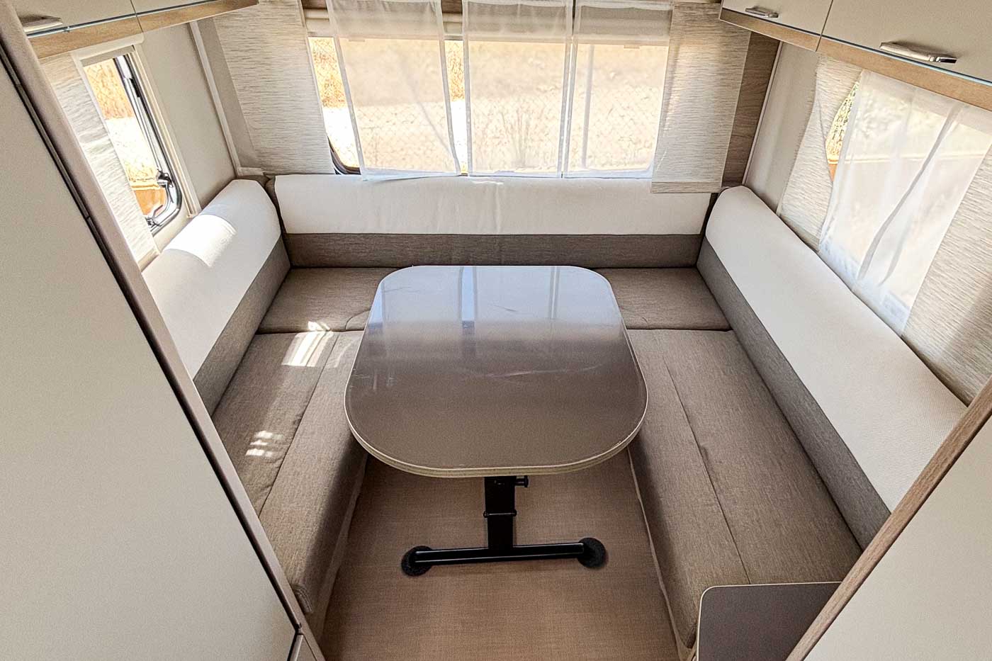 El gran salón en “U” del que dispone resulta cómodo para disfrutar en familia de nuestras estancias; se transforma en amplia cama doble. Sobre esta zona se dispone además una cama doble de grandes dimensiones, fácilmente abatible desde el techo.