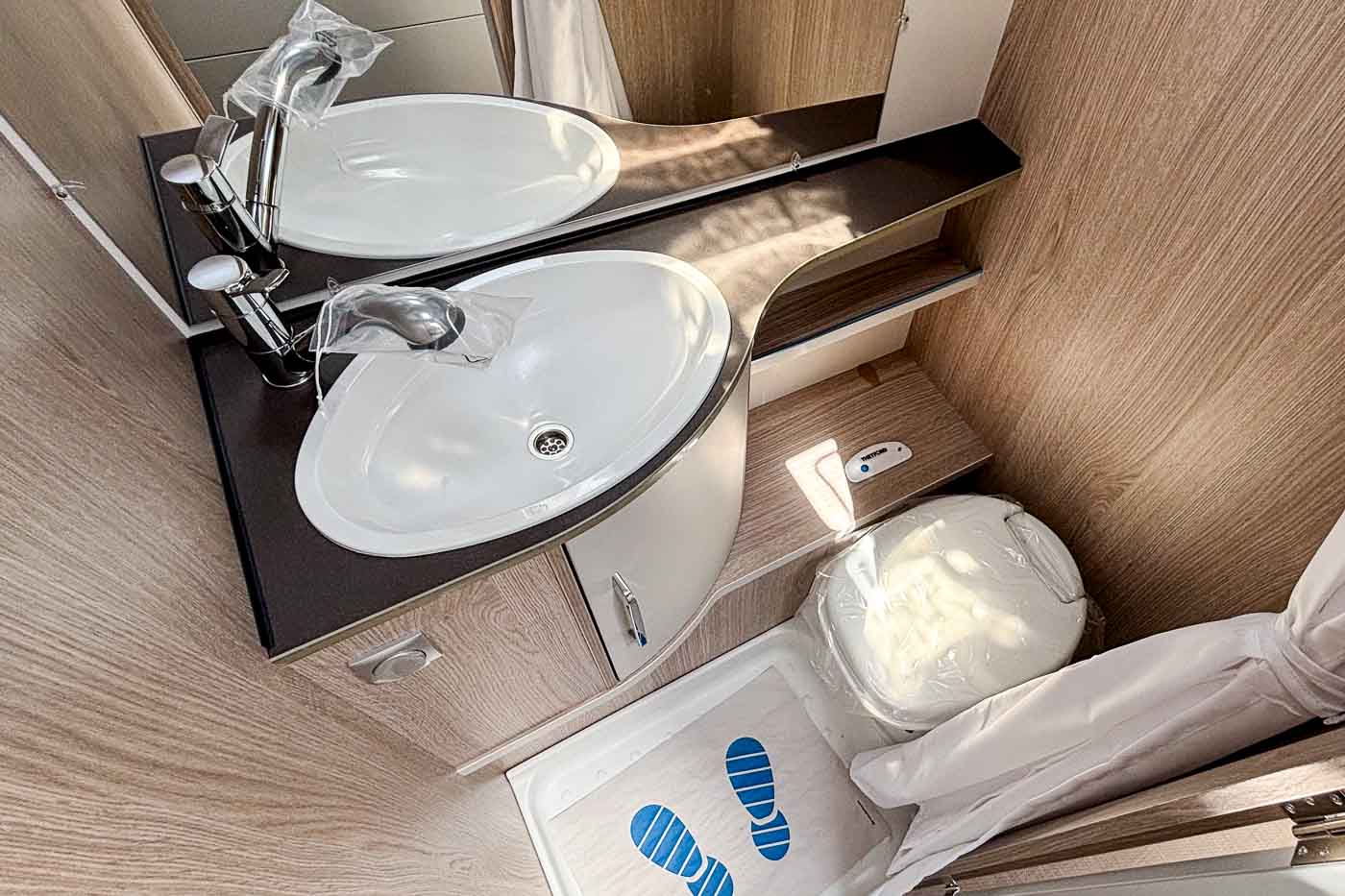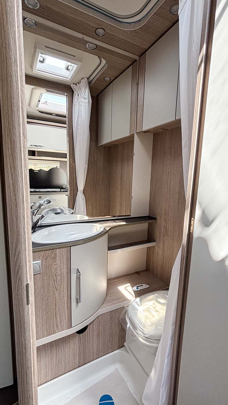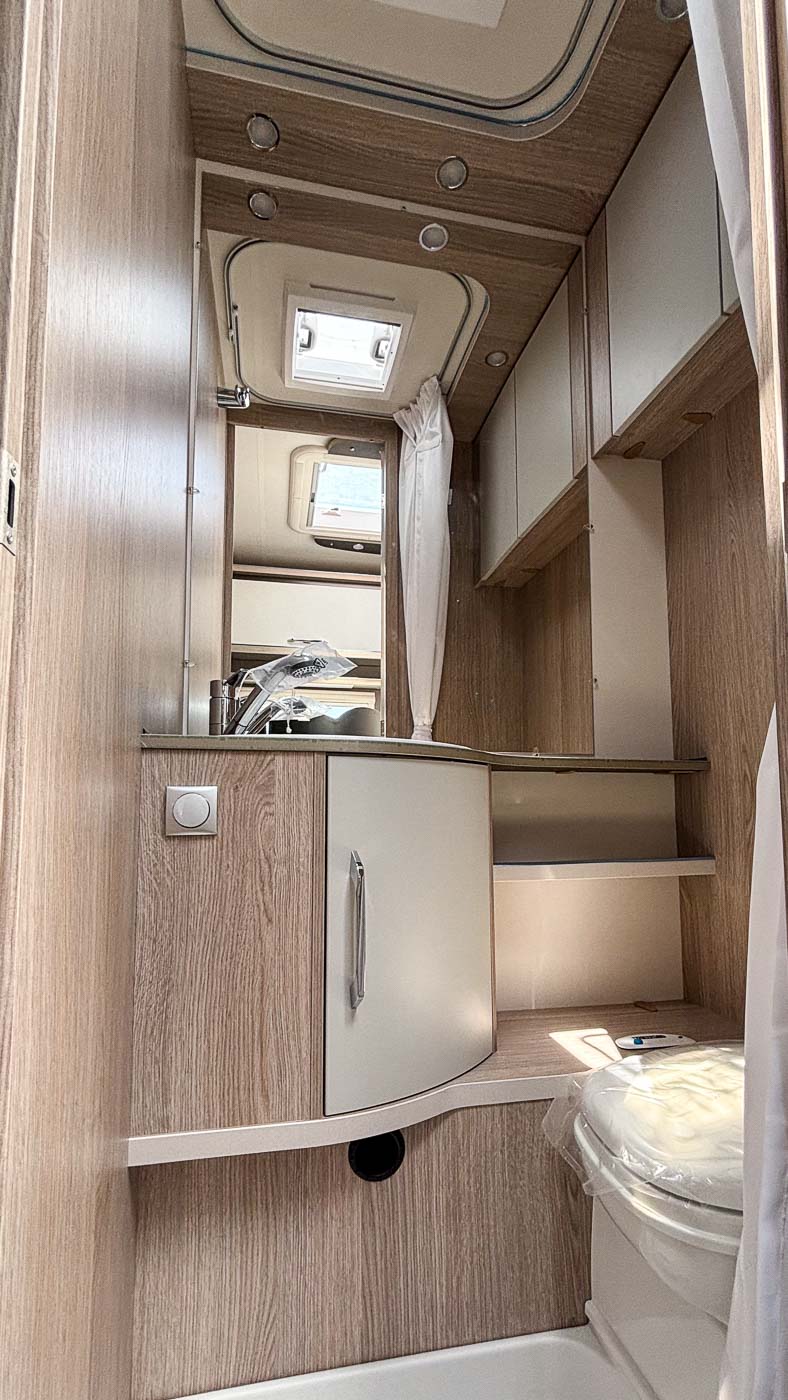Cuenta además con baño compacto equipado con W.C., lavamanos y ducha extensible.