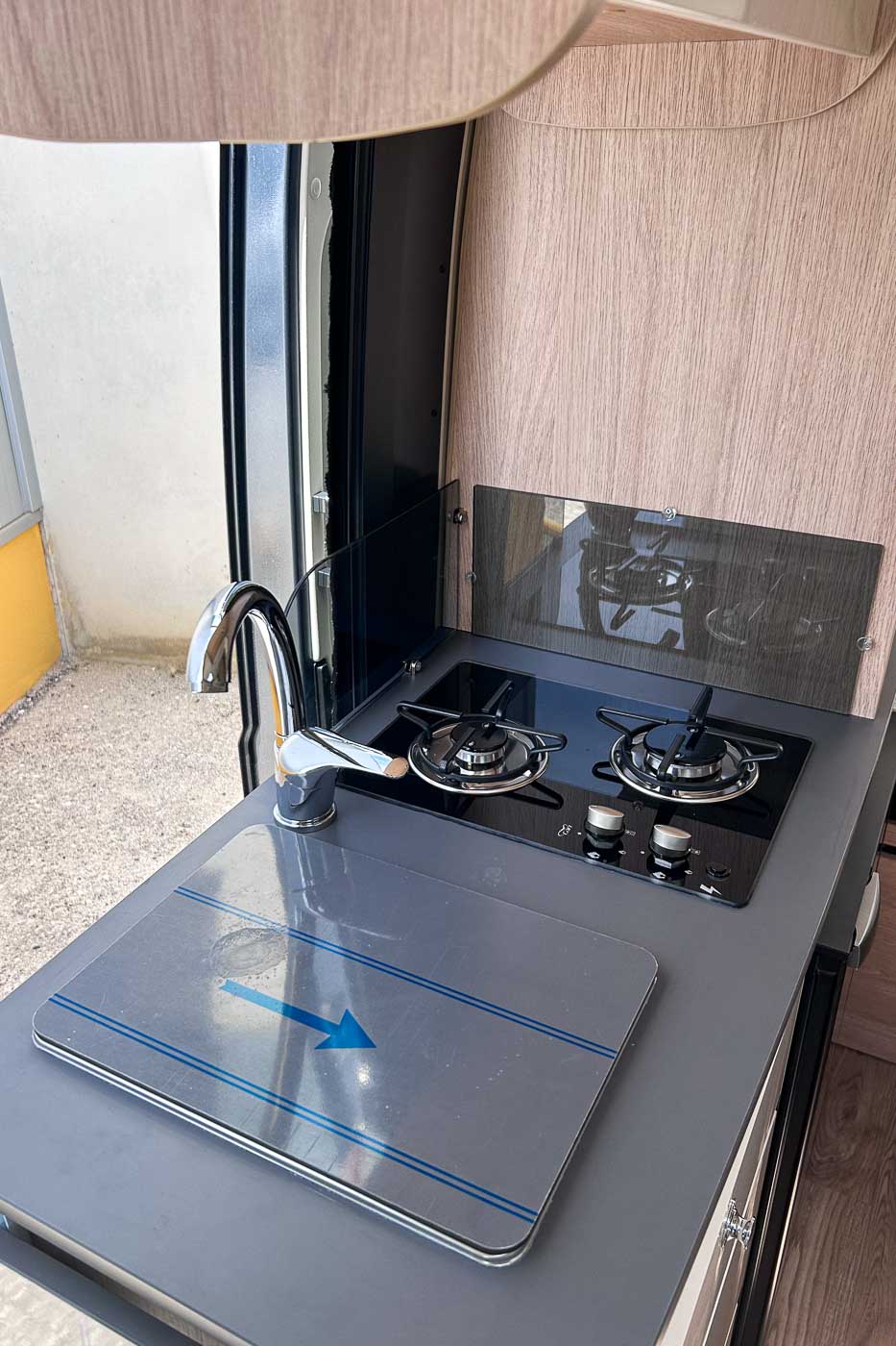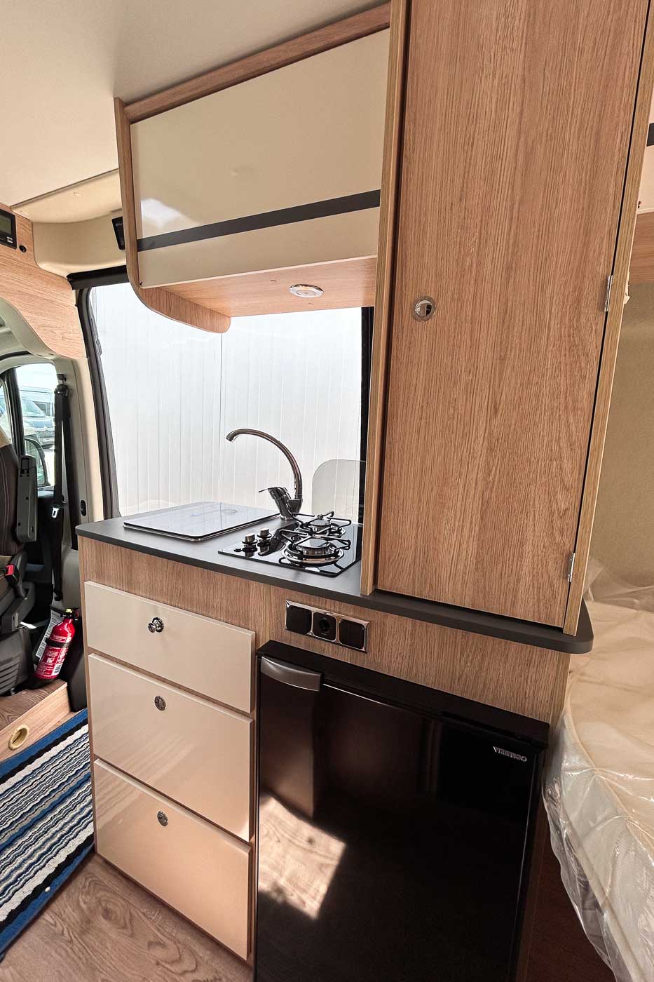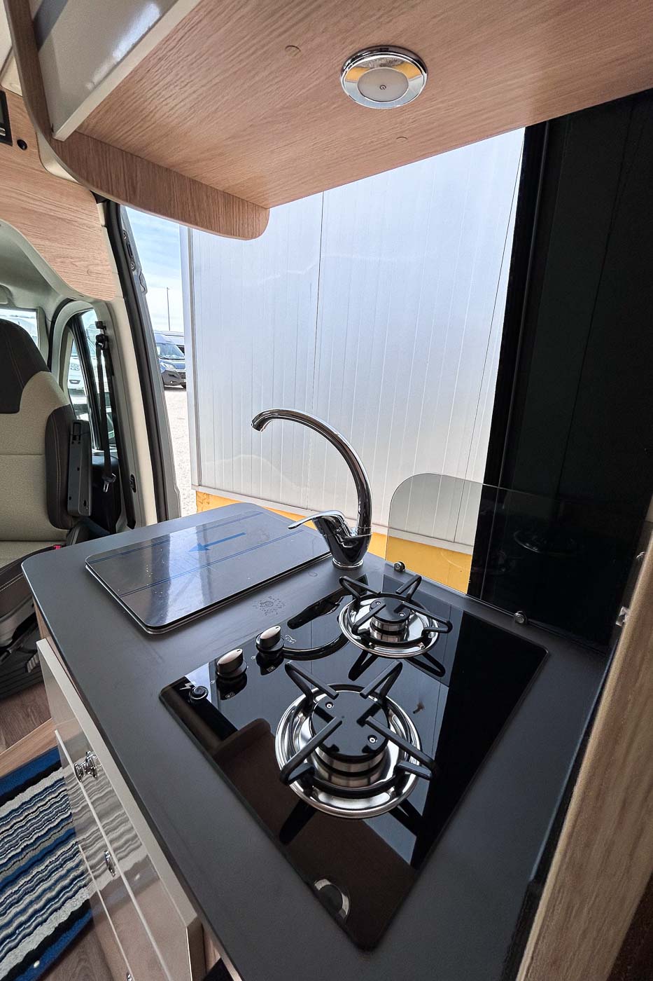 La parte central del vehículo está ocupada por la cocina, equipada con dos fuegos, fregadero y frigorífico, así como aleta lateral extensible.