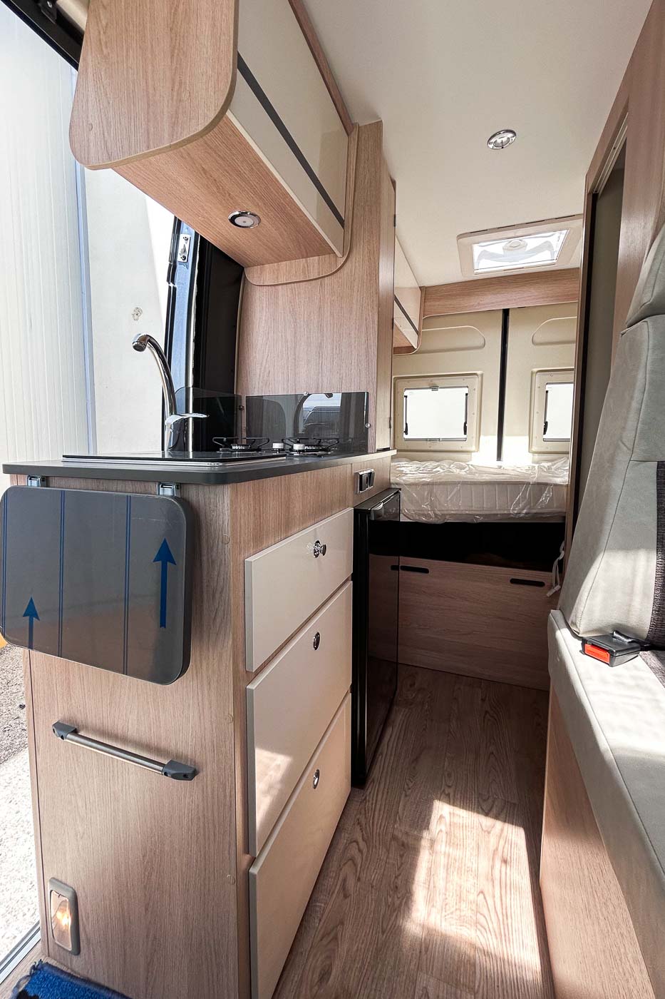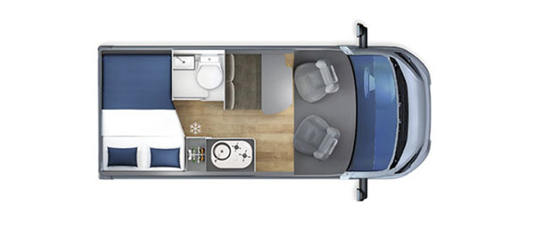 Su distribución se caracteriza principalmente por disponer de amplia cama transversal en la parte trasera, fácilmente desmontable para aprovechar el espacio para el transporte de equipaje durante los trayectos.
